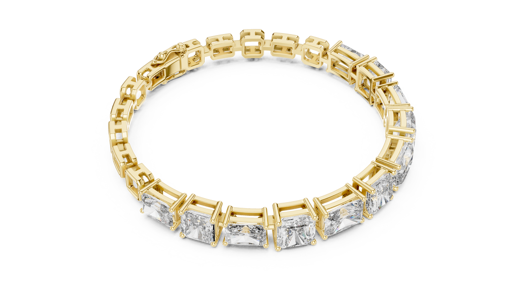 This elegant piece is defined by its clean lines and geometric precision. The box-style links connect seamlessly, creating a flexible band of radiant, four-sided crystals. With its polished, copper-pink framework and secure locking clasp, it offers a contemporary take on classic luxury.