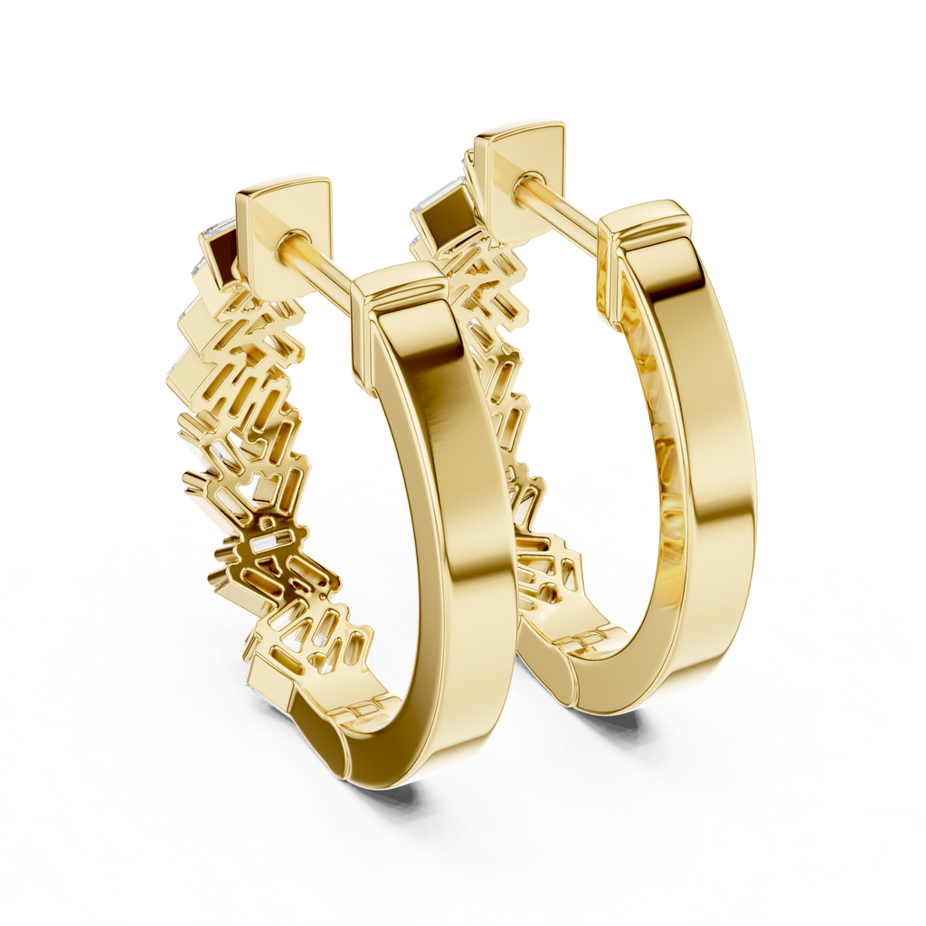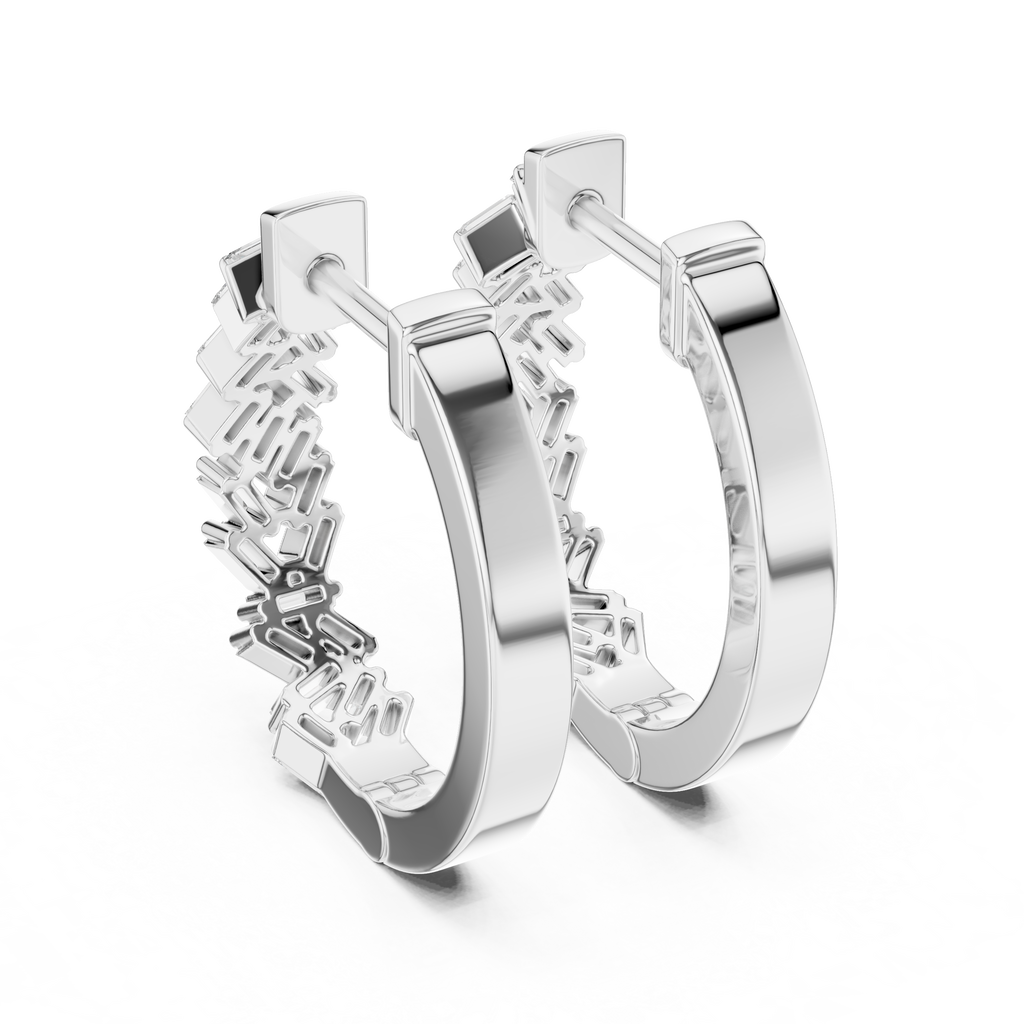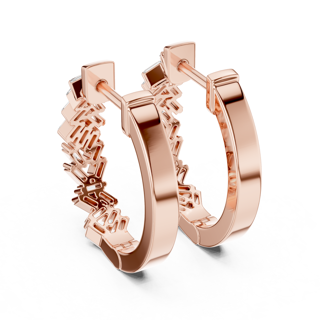 Elevate your everyday style with the sharp, architectural beauty of these herringbone diamond J-hoops. Crafted in warm rose gold, the design breaks away from tradition by featuring a striking zigzag pattern composed of interlocking baguette-cut diamonds. This precise, angled arrangement creates a dynamic "V" formation that enhances the stones' natural clarity, delivering the sophisticated, mirror-like flashes of light unique to step-cut gems. Modern and edgy, these earrings offer a bold geometric texture that stands out as a high-fashion alternative to the classic round diamond hoop.