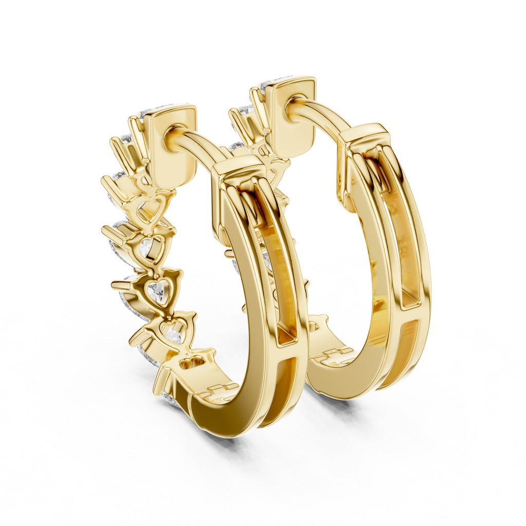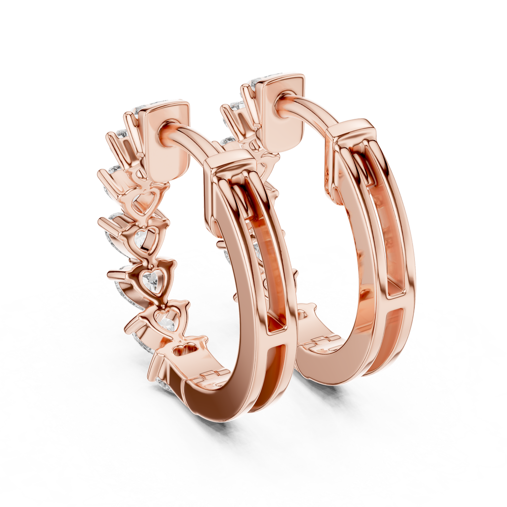 Capture the essence of romance with these breathtaking heart-cut diamond J-hoops, a true statement of love and luxury. Set in gleaming rose gold, the earrings feature a cascading row of distinct heart-shaped diamonds, arranged tip-to-top to create a seamless ribbon of brilliance. Unlike designs that use metal shapes to mimic hearts, these hoops showcase the rare beauty of the fancy cut itself, allowing each gemstone to reflect light with intense fire and clarity. The minimal shared-prong setting ensures the focus remains entirely on the unique silhouette of the diamonds, making this pair a playful yet sophisticated treasure for anyone who loves sentimental jewelry.