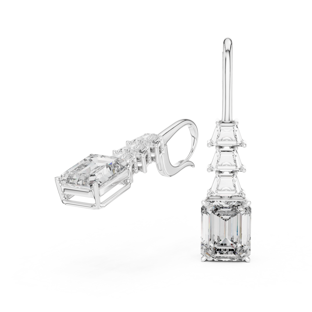 Channel the grandeur of the Art Deco era with these magnificent diamond drop earrings, a masterpiece of geometric precision. The design features a breathtaking emerald-cut diamond solitaire suspended from a structured tier of three graduating trapezoid-cut diamonds. This linear "step-cut" arrangement creates a mesmerizing "hall of mirrors" effect, offering deep, sophisticated flashes of light rather than the scattered sparkle of round stones. Set in warm rose gold, the architectural silhouette elongates the neck and delivers a commanding presence, making these earrings the ultimate accessory for black-tie galas and red-carpet moments.