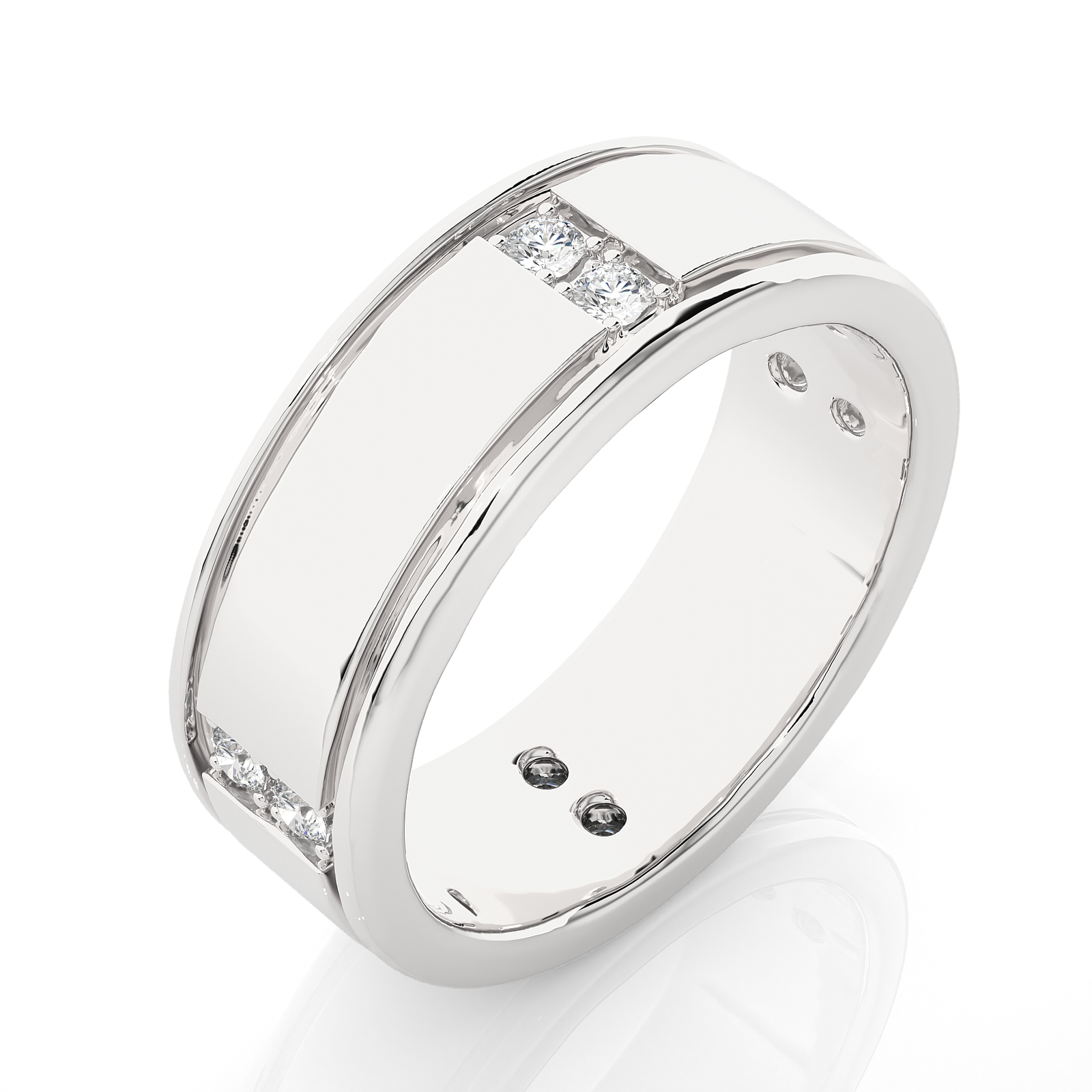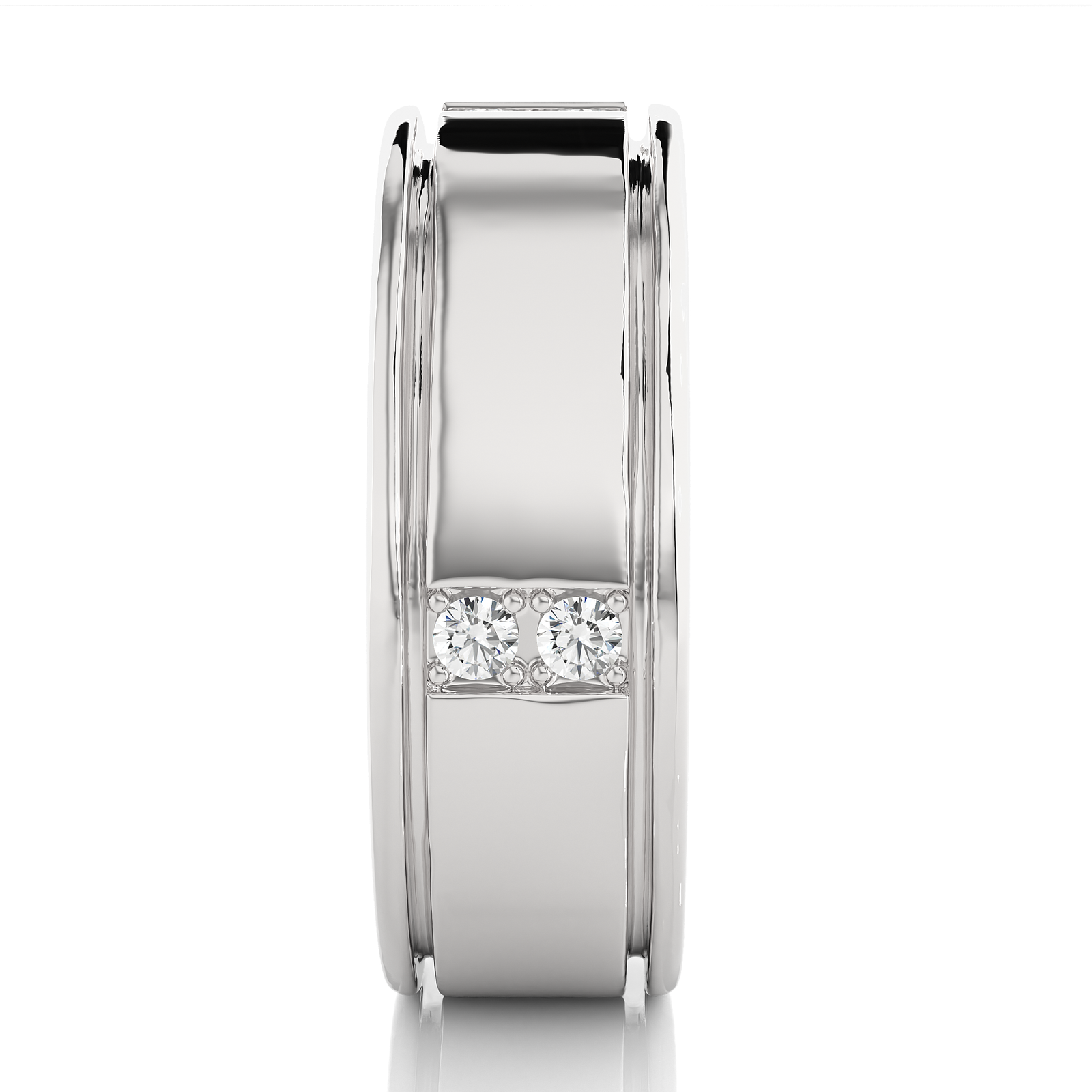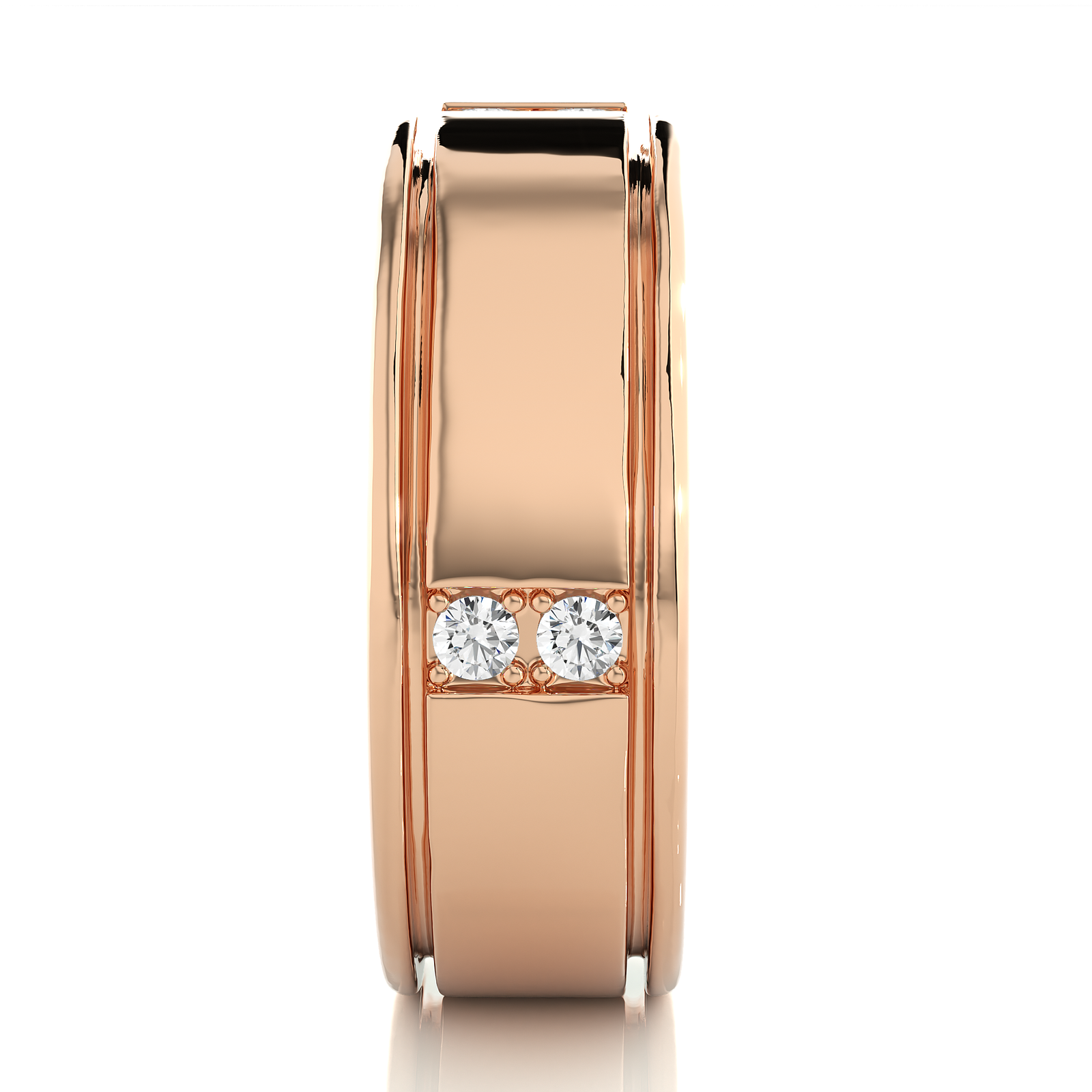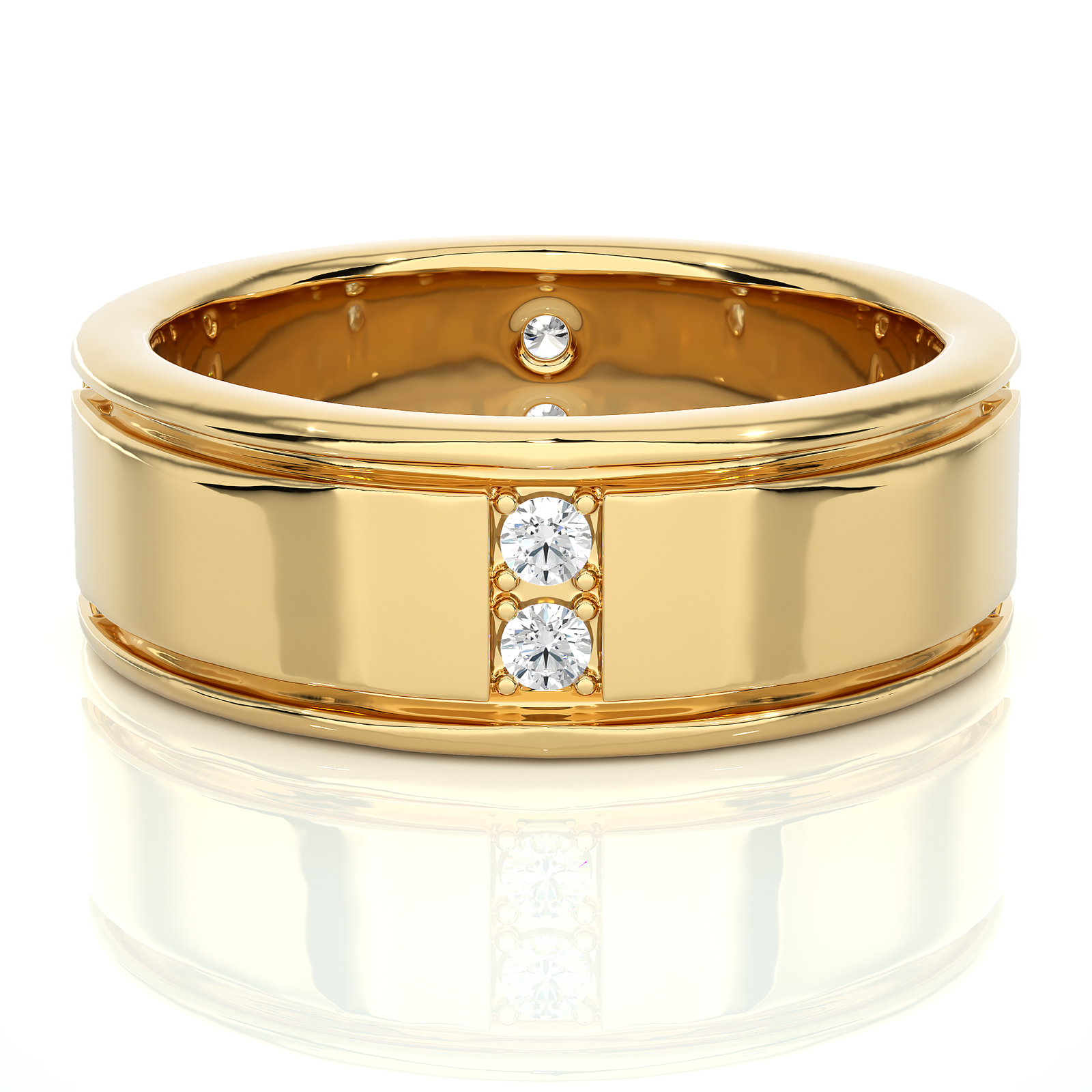 This bold solid gold ring features a clean, polished center flanked by sleek grooves and twin diamond accents on either edge. A stylish fusion of elegance and strength, it's perfect as a contemporary wedding band or a statement piece. Subtle diamonds offer sparkle without compromising the ring's minimalist sophistication.