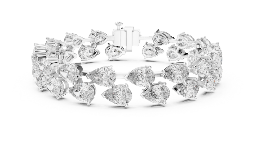 Wrap your wrist in the sophisticated luxury of this Rose Gold Interlocking Pear Diamond Bracelet. Moving beyond the traditional straight-line tennis style, this exquisite piece features two parallel rows of brilliant pear-shaped diamonds, artfully angled to create a mesmerizing woven or herringbone pattern. The unique "zipper" arrangement allows the stones to nestle perfectly against one another, minimizing gaps and maximizing continuous sparkle. Crafted with a fluid, articulated structure for superior comfort and finished with a seamless box clasp, this bracelet is a modern statement piece that effortlessly combines architectural design with timeless glamour.