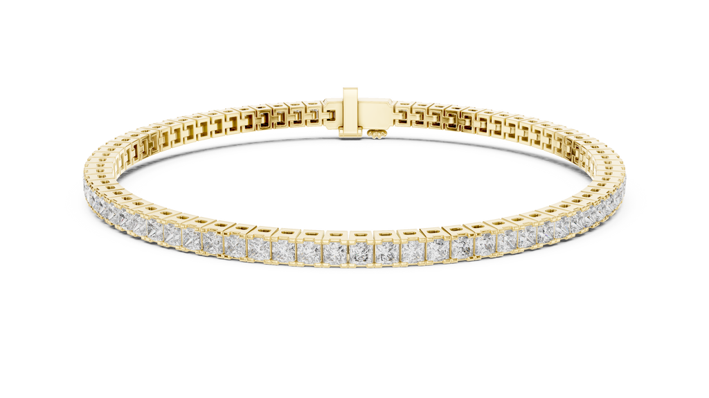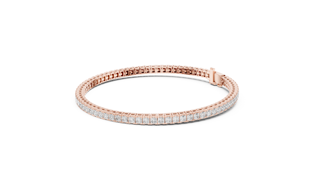 Elevate your wrist stack with the sharp, geometric allure of this Rose Gold Princess-Cut Tennis Bracelet. Distinguished by its clean, architectural lines, this modern classic features a continuous, seamless row of square-cut diamonds, each expertly set in individual box links to maximize brilliance and define its structured silhouette. The warm rose gold metalwork provides a stunning contrast to the icy precision of the stones, creating a sophisticated "ribbon of light" effect. Finished with a secure, integrated box clasp for a smooth, uninterrupted flow, this bracelet is the perfect choice for those who appreciate the bold, contemporary edge of square diamonds over traditional rounds.
