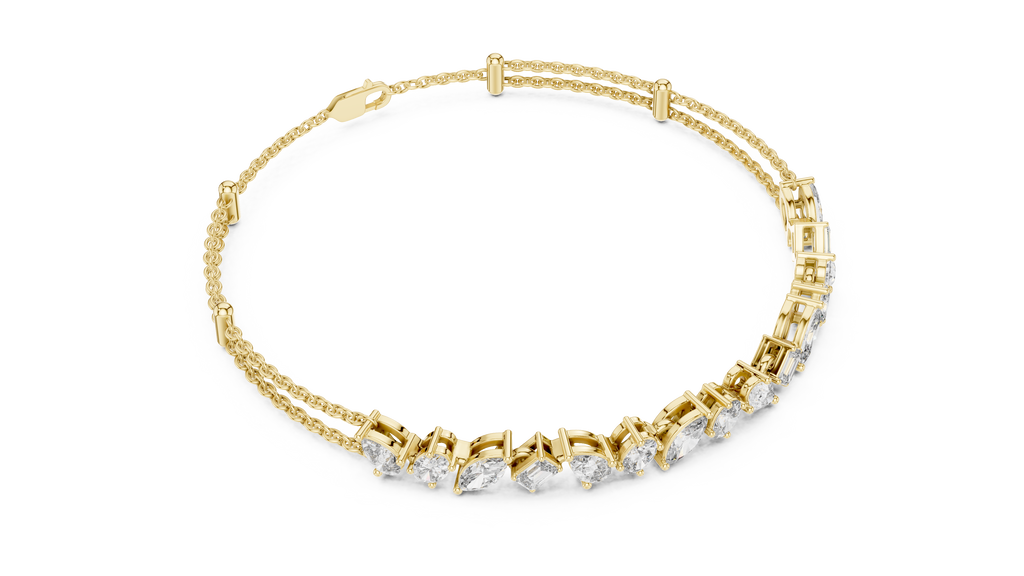 Celebrate individuality with the eclectic charm of this Rose Gold Mosaic Bar Bracelet. A true conversation starter, this modern design features a curated bar of mixed fancy-cut diamonds?including pear, emerald, oval, and marquise shapes?arranged in an artful, irregular rhythm that captures light from every angle. The dazzling diamond station is suspended from a unique double-strand chain, creating an instant layered look that feels both delicate and substantial. Secured with a lobster clasp and adjustable extender for a custom fit, this piece offers a fresh, contemporary twist on the classic diamond bracelet.