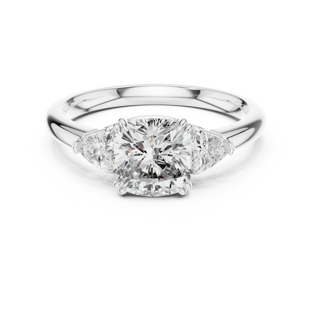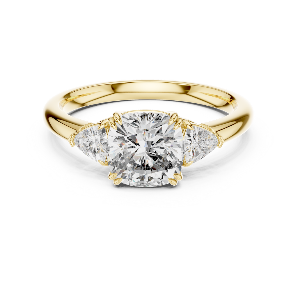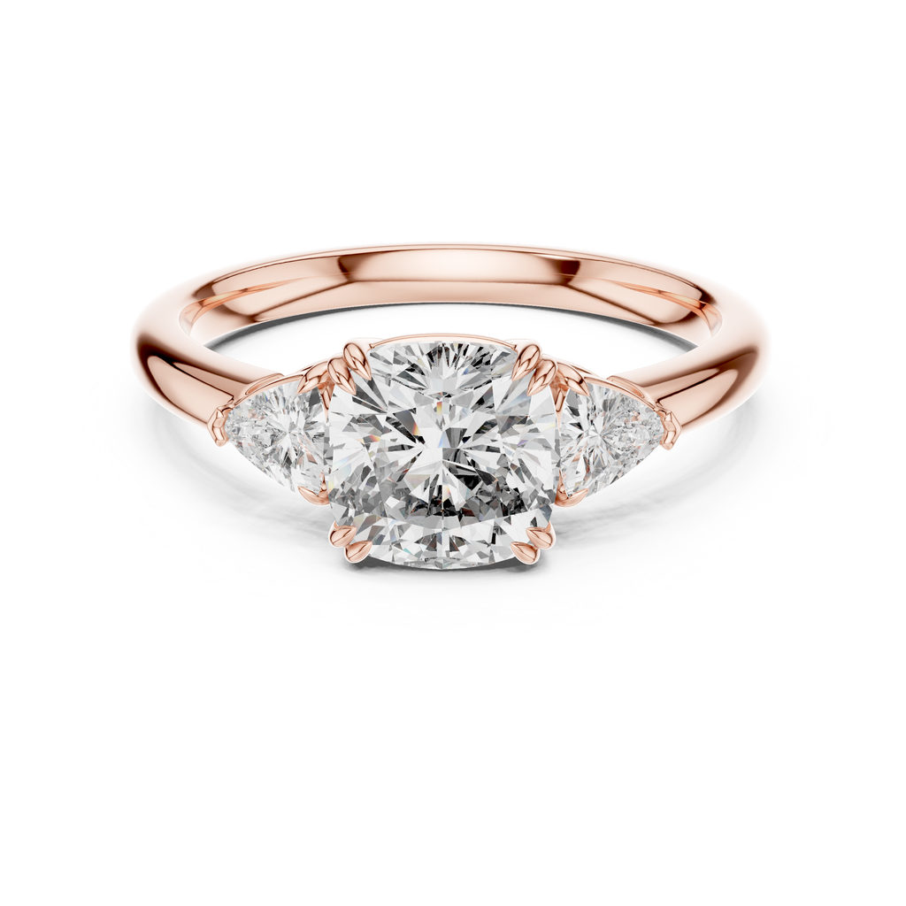 Celebrate your past, present, and future with this breathtaking three-stone engagement ring. At its heart lies a magnificent cushion-cut center stone, renowned for its soft edges and brilliant fire. The center gem is securely embraced by elegant double-claw prongs, adding a touch of vintage sophistication. Flanking the center stone are two brilliant trillion-cut diamonds, perfectly angled to draw the eye inward and maximize sparkle. Crafted in lustrous rose gold, the polished band provides a warm, romantic foundation that enhances the brilliance of the stones. This ring is a perfect balance of modern geometry and classic sentiment. Key Features: Center Stone: Premium Cushion Cut (Square with rounded corners). Side Stones: Two Trillion Cut (Triangular) accents. Metal Tone: Rose Gold (available in 14K or 18K). Setting Style: Three-Stone with Double-Claw Prongs. Band: High-polish smooth shank for comfort and durability.