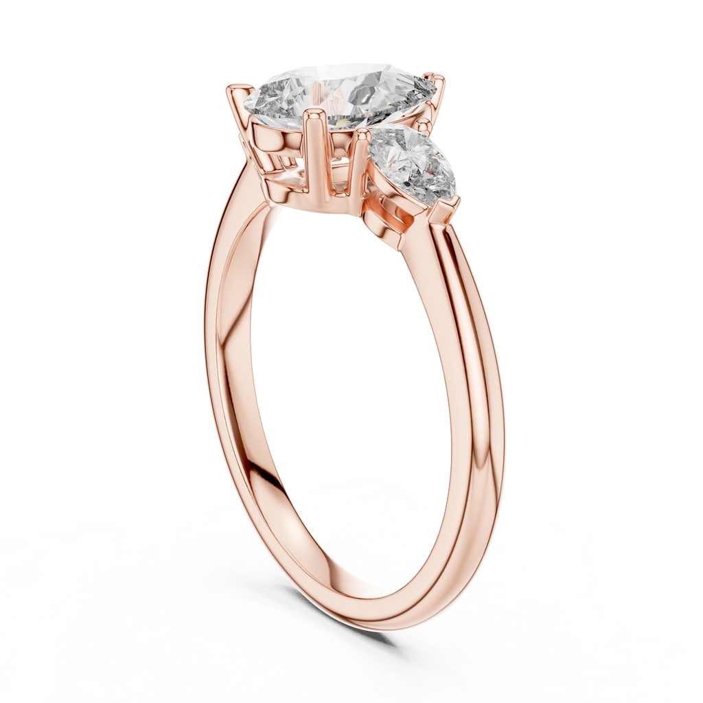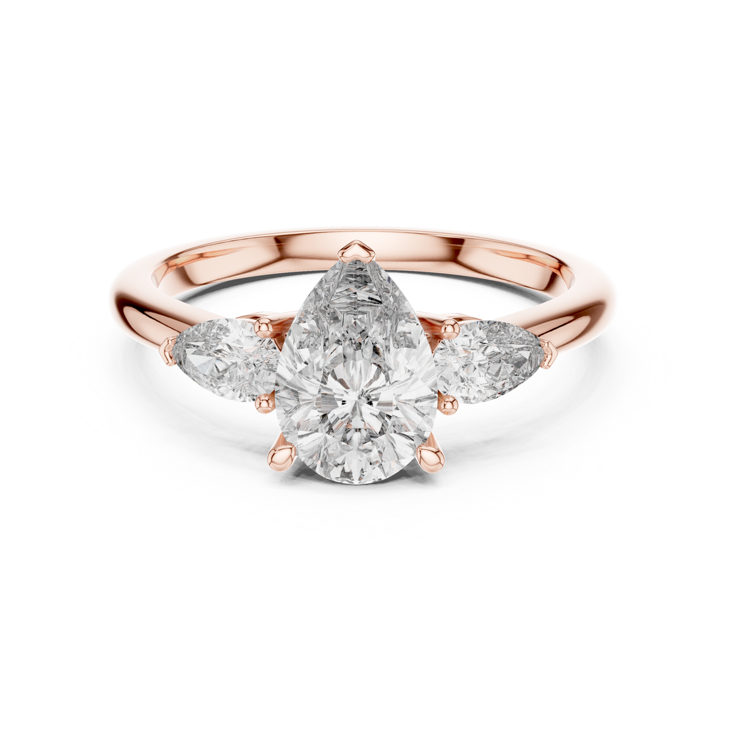 Embrace elegance with this stunning three-stone engagement ring, featuring a graceful Pear Cut center stone. Known for its distinctive teardrop silhouette, the center gem elongates the finger and captivates with its brilliant facets. The beauty of the center stone is amplified by two matching pear-shaped side stones, set horizontally to create a seamless, tapered look. Crafted in warm, polished Rose Gold, this trilogy design symbolizes the past, present, and future of your love story, making it a deeply meaningful and stylish choice. Key Features: Design Style: Three-Stone / Trilogy Engagement Ring. Center Stone: Premium Pear Cut (Teardrop shape). Side Stones: Two horizontal Pear Cut diamonds/gemstones. Metal Type: Polished Rose Gold. Setting Detail: Claw prongs securing the tips and curves of the stones. Band: Slender, high-polish shank.