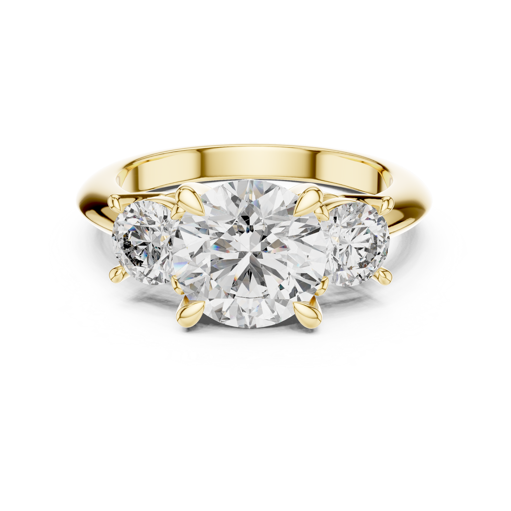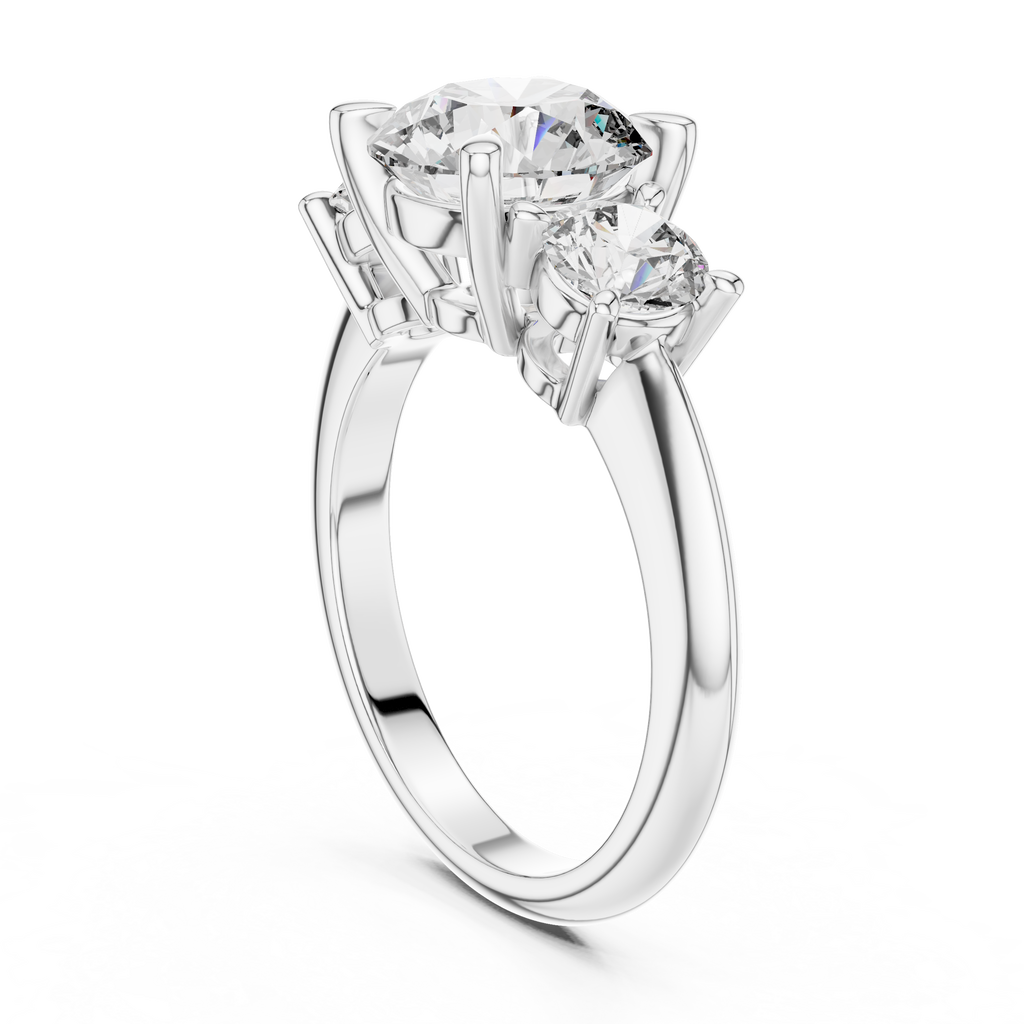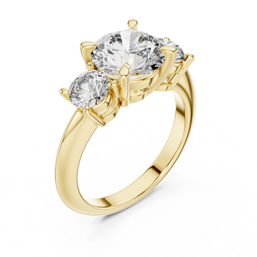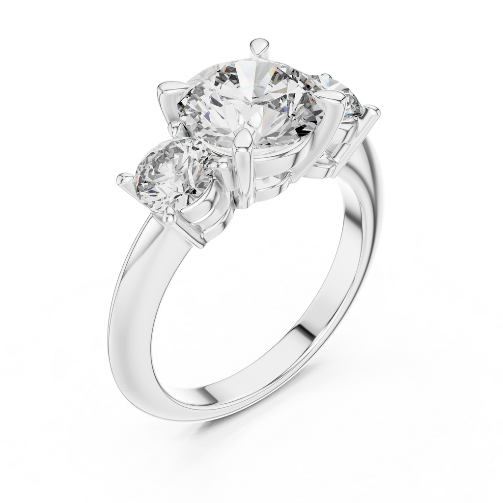 Capture the essence of your journey with this magnificent three-stone ring, a design celebrated for symbolizing the past, present, and future. The centerpiece is a stunning round brilliant-cut gem, perfectly balanced by two matching side stones that create a continuous horizon of sparkle. The stones are held securely in a sophisticated trellis setting, where the polished metal prongs sweep and cross over one another in a graceful, woven pattern. This open gallery structure not only adds a unique architectural detail but also allows light to flood the gems from all sides for maximum brilliance. With its tapered band and fluid lines, this piece offers a timeless silhouette that is both elegant and meaningful. Key Features: Design: Classic Three-Stone Trilogy Gem Shape: Round Brilliant Cut Setting: Interwoven Trellis Gallery Aesthetic: Timeless, Symbolic, and Radiant