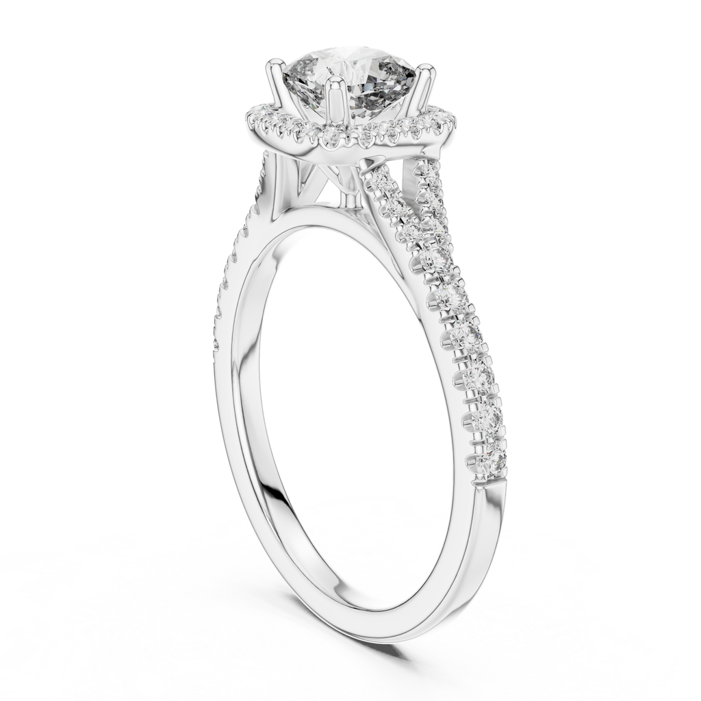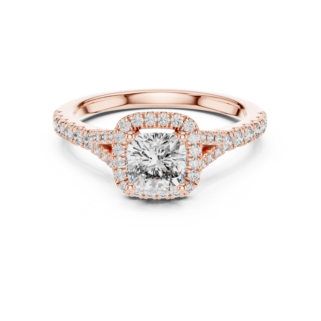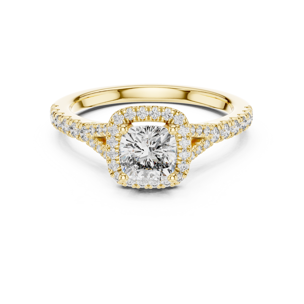 Capture the essence of romance with this breathtaking engagement ring. The design features a magnificent cushion-cut center stone, framed by a delicate halo of smaller gems that enhance its size and brilliance. The band showcases a sophisticated split-shank style, where the metal divides as it approaches the center, creating an architectural look that is both modern and timeless. Each arm of the split band is lined with shimmering pav?-set stones, ensuring sparkle from every angle. This exquisite piece is designed to be the perfect symbol of your everlasting commitment. Key Features: Center Stone: Premium Cushion Cut Setting Style: Halo with Split Shank Accent Stones: Pav? set along the band and halo Design Aesthetic: Vintage-inspired luxury with high-brilliance finish