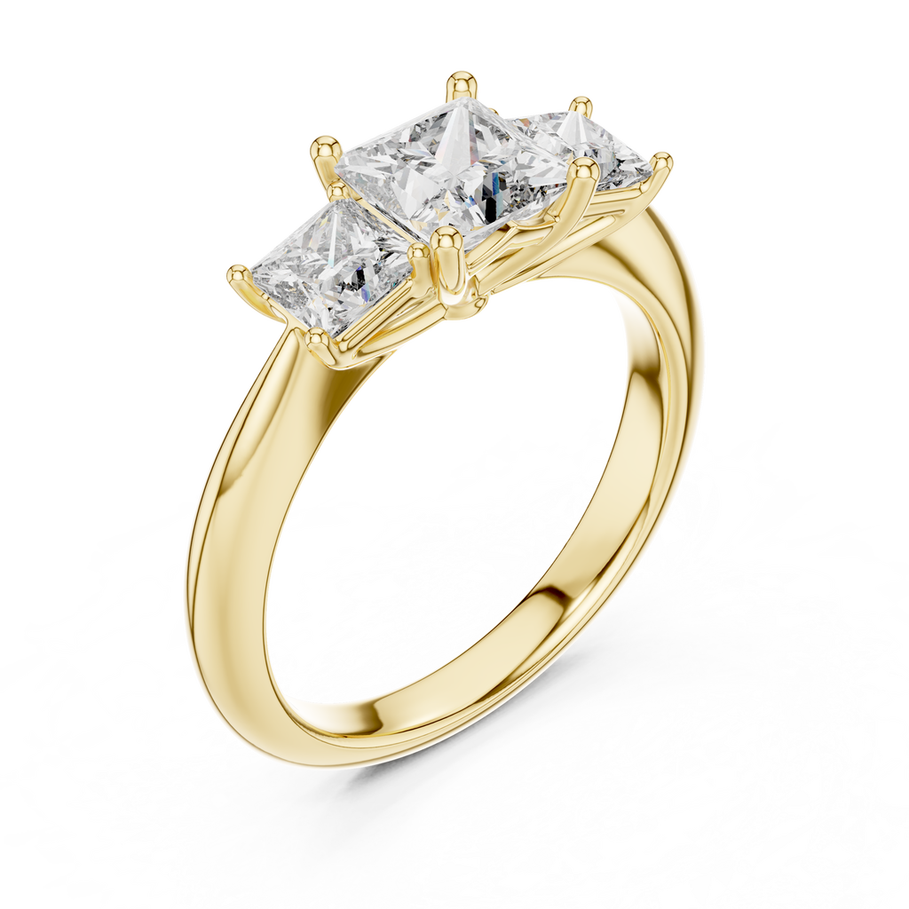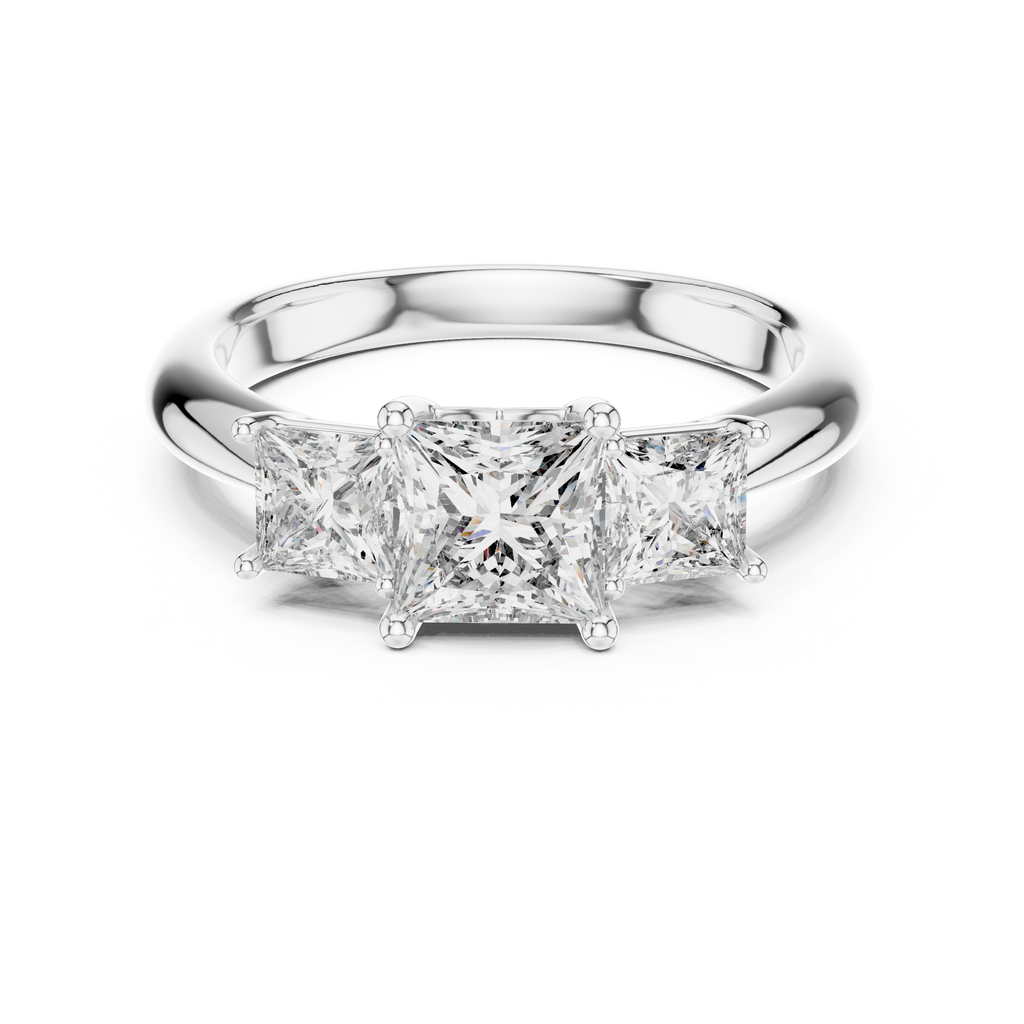 Celebrate your unique love story with this elegant three-stone ring. The design features a brilliant square-cut center stone flanked by two matching side stones, creating a powerful symbol of your past, present, and future together. Each gem is lifted by a classic prong setting that allows maximum light to enter, ensuring exceptional sparkle from every angle. The smooth, polished band provides a comfortable fit and a sophisticated finish, making this piece a timeless choice for your special moment. Key Features: Center Stone: Princess Cut Side Stones: Matching Princess Cut Setting Style: Three-Stone Trilogy Band Finish: High Polish Design Meaning: Past, Present, and Future