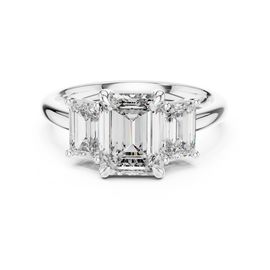 Indulge in the sophisticated beauty of this three-stone ring, designed for those who appreciate clean lines and architectural elegance. The centerpiece is a magnificent emerald-cut stone, renowned for its step-cut facets that create a mesmerizing hall-of-mirrors effect. It is perfectly framed by two matching side stones, creating a seamless horizon of brilliance across the finger. The gems are elevated by a classic prong setting, allowing light to cascade through each stone for maximum clarity. Finished with a smooth, high-polish band, this ring offers a timeless look of understated luxury. Key Features: Center Stone: Emerald Cut Side Stones: Matching Step Cut Gems Setting Style: Three-Stone Prong Band Finish: Lustrous High Polish Design Aesthetic: Art Deco inspired elegance