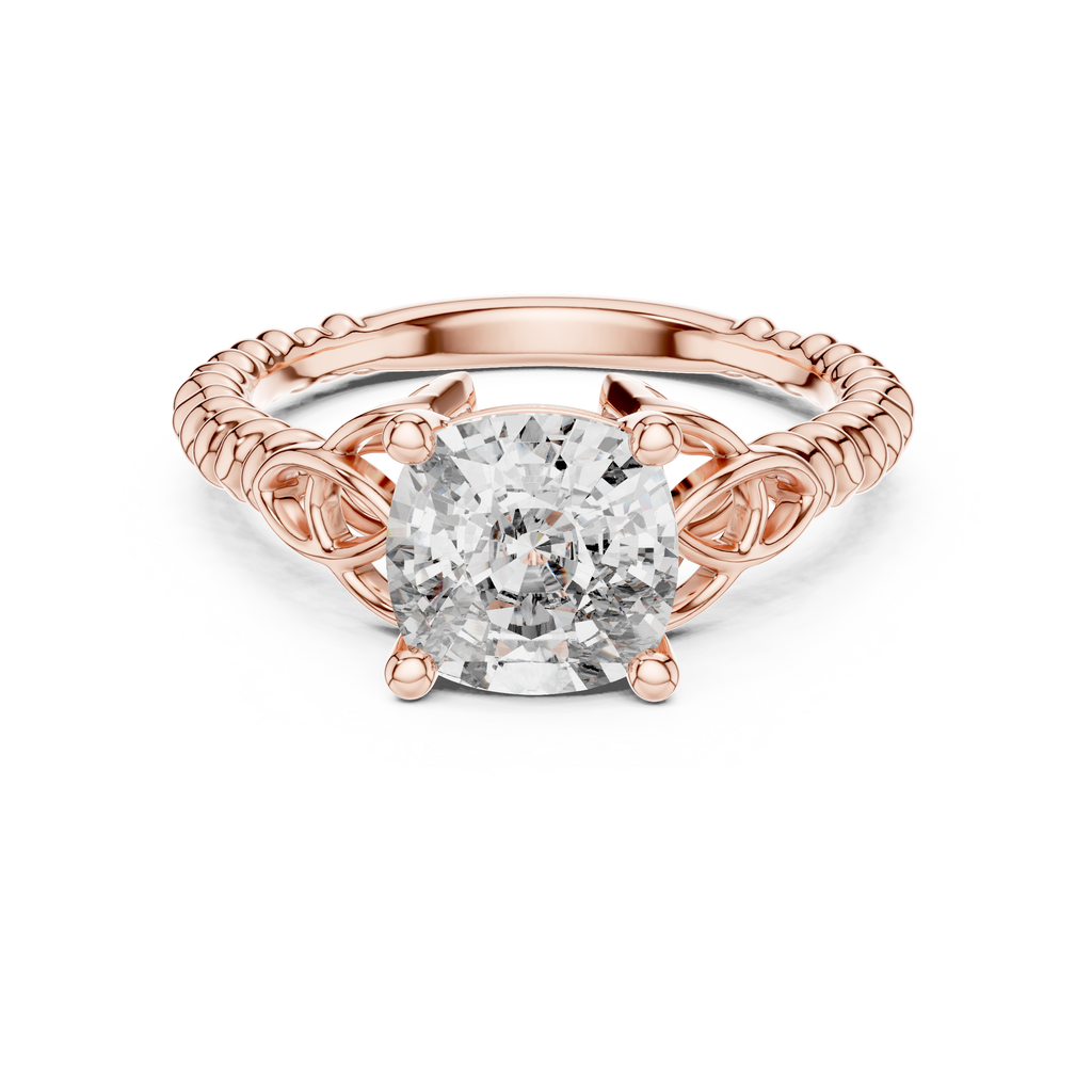 Embrace the charm of vintage-inspired design with this exquisite solitaire ring. The piece centers on a stunning cushion-cut stone, held securely in a classic prong setting that highlights its soft corners and brilliant facets. The true character of this ring lies in its intricate band, which features a sculpted twisted rope texture representing the intertwining of two lives. Elegant knot detailing at the shoulders adds a touch of Celtic symbolism, representing eternity and strength. With its highly detailed metalwork and timeless silhouette, this ring is a perfect choice for those who value meaning and craftsmanship. Key Features: Center Stone: Cushion Cut Band Style: Twisted Rope / Cable Design Detailing: Celtic Knot / Infinity Accents at Shoulders Setting Type: Solitaire Prong Finish: High Polish Sculpted Metal