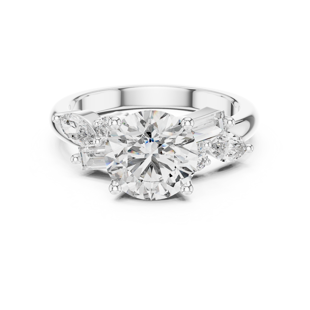 Discover a masterpiece of light and geometry with this exquisite engagement ring. The design features a magnificent round brilliant cut center stone, flanked by a sophisticated arrangement of accent gems. The shoulders display a unique sequence of mixed fancy cuts, combining the clean lines of baguette stones with the soft curves of marquise or round diamonds. This artful transition draws the eye toward the center while adding dynamic sparkle from every angle. The high polished band provides a lustrous foundation, creating a harmonious balance between the intricate setting and the smooth shank. Key Features: Center Stone: Round Brilliant Cut Side Stones: Mixed Baguette and Marquise/Round Cuts Setting Style: Multi-Stone Prong Band Finish: High Gloss Polish Design Aesthetic: Artful and Sophisticated