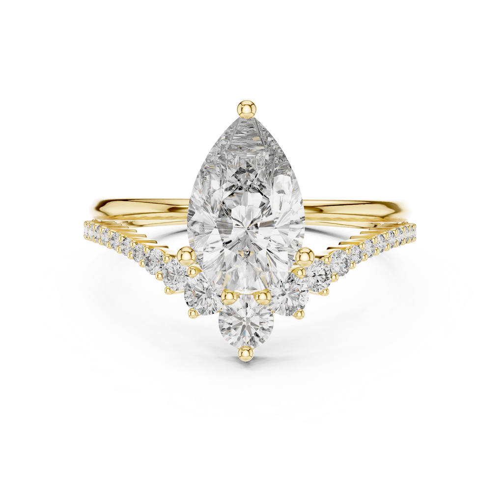 Elevate your special moment with this exquisite engagement ring. The design centers around a breathtaking pear-shaped stone, offering a teardrop silhouette that is both elegant and timeless. A graceful, twisting band sweeps upward to cradle the main gem, encrusted with graduating round brilliant accents that maximize sparkle from every angle. This intricate bypass style combines modern artistry with classic romance, making it a truly unforgettable choice for a proposal. Key Features: Center Stone: Pear Cut Side Stones: Round Brilliant Cut Setting Style: Twisted Pave Shank Category: Engagement Ring