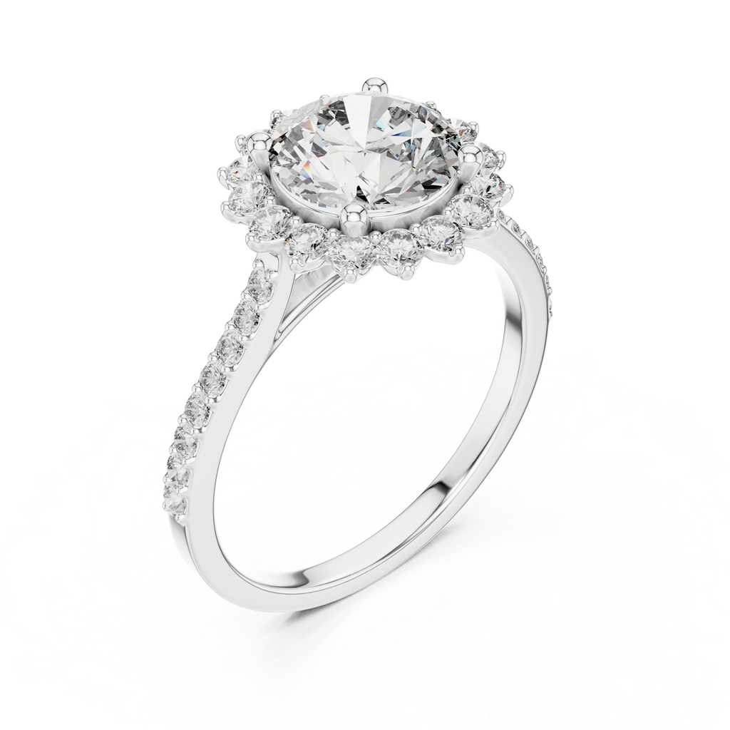 Indulge in the brilliance of this radiant engagement ring. At its heart lies a magnificent round brilliant cut stone, encircled by a captivating halo of smaller round gems. The halo features a unique, scalloped edge that creates a starburst effect, amplifying the center stones fire and adding a regal touch. The sparkle extends gracefully down the shank, which is lined with a row of shimmering pave-set accents. This design perfectly balances classic elegance with a touch of celestial drama, making it an ideal symbol of everlasting love. Key Features: Center Stone: Round Brilliant Cut Setting Style: Scalloped Starburst Halo Band Design: Pave Set Shank Category: Engagement Ring