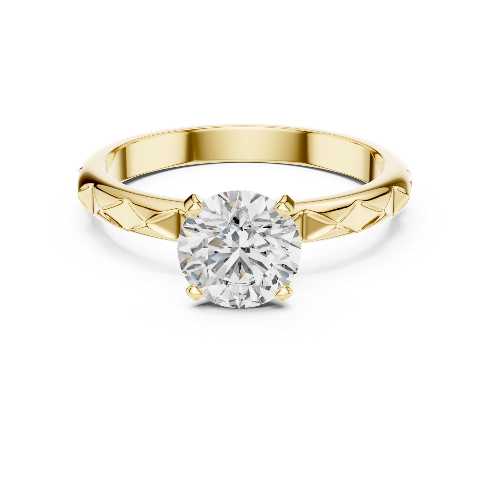 Elegant and eye-catching, this Diamond Engagement Ring blends timeless beauty with a touch of modern artistry. At its center, a stunning round brilliant-cut diamond is secured in a classic four-prong setting, designed to highlight the diamond’s exceptional sparkle. The band is enhanced with distinctive geometric engravings, creating a sleek, textured finish that sets this ring apart. Perfect for the modern romantic, this ring offers a sophisticated yet unique take on the classic solitaire design.