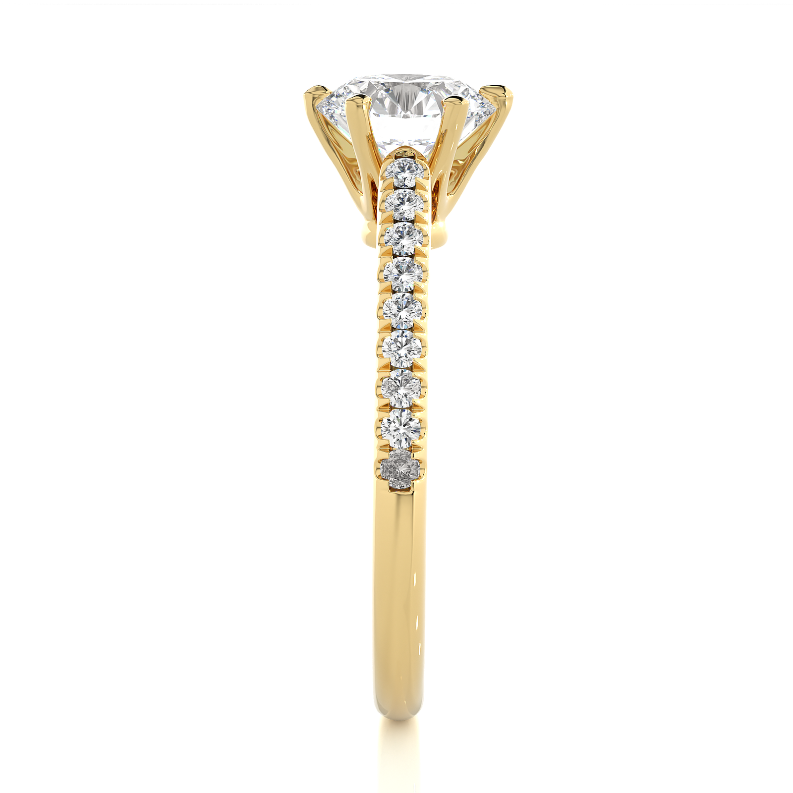 This elegant solid gold engagement ring features a dazzling round-cut center stone in a secure six-prong setting. The slender band sparkles with pavé-set diamonds, adding brilliance and charm. A timeless design that captures the essence of romance, perfect for celebrating love with sophistication and enduring beauty.