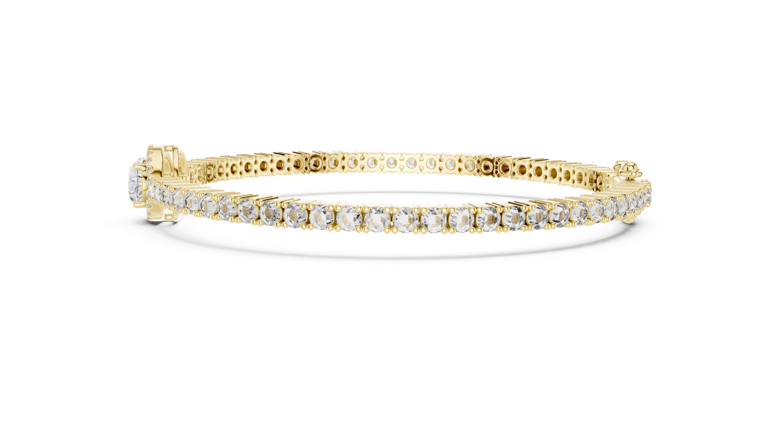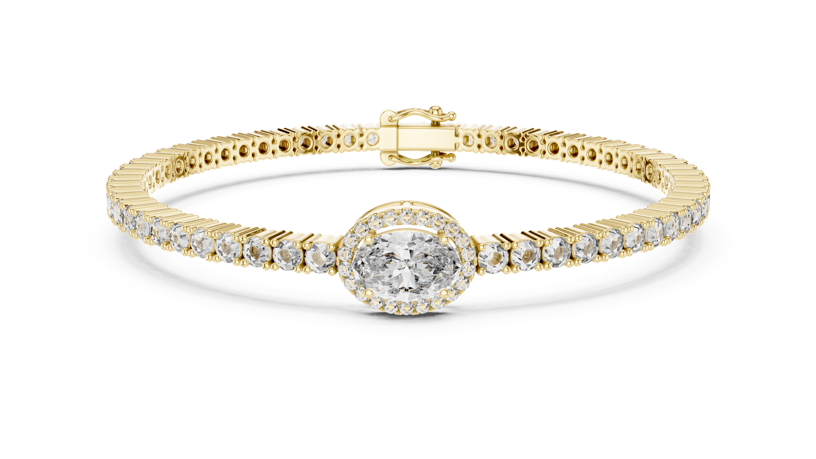 A timeless statement of elegance and brilliance, this luxurious tennis bracelet showcases a captivating oval-cut center diamond framed by a halo of petite round diamonds for extra sparkle. The center motif is flanked by a continuous stream of round brilliant-cut diamonds, each meticulously set in gleaming 18K yellow gold. Designed with precision and crafted for sophistication, this bracelet combines classic charm with modern refinement?ideal for celebratory occasions or enhancing your daily elegance. Centerpiece: Oval-Cut Diamond with Halo Diamond Accents: Round Brilliant-Cut Diamonds Clasp: Secure Box Clasp with Safety Latch Occasions: Perfect for weddings, anniversaries, and formal events Setting Style: Center Diamond: Halo Setting ? The oval center diamond is encircled by a halo of smaller round diamonds, amplifying its size and sparkle. Side Diamonds: Four-Prong Setting ? Each round diamond is individually held in a secure four-prong setting for a clean, elegant look.
