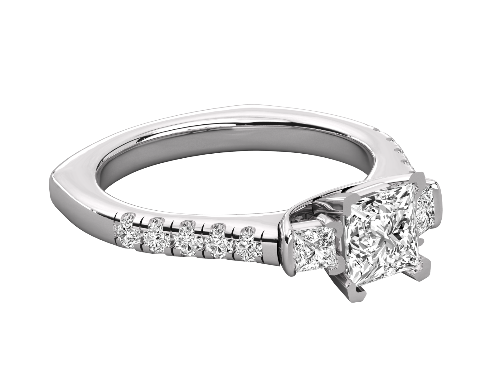 This luxurious gold ring features a stunning princess-cut center diamond, flanked by two sparkling side stones. The band is elegantly adorned with pave-set diamonds, adding extra brilliance and sophistication. A timeless design that symbolizes enduring love, making it the perfect engagement or anniversary ring for the one you cherish.