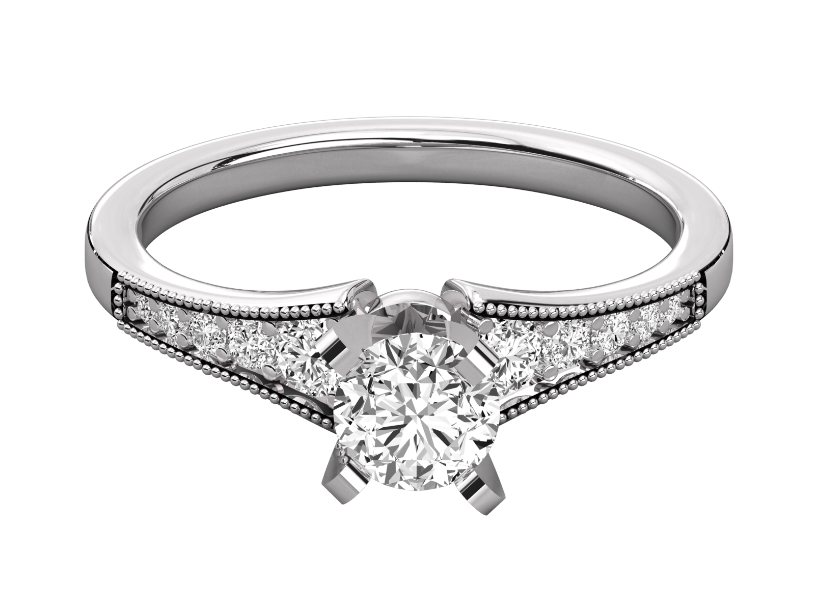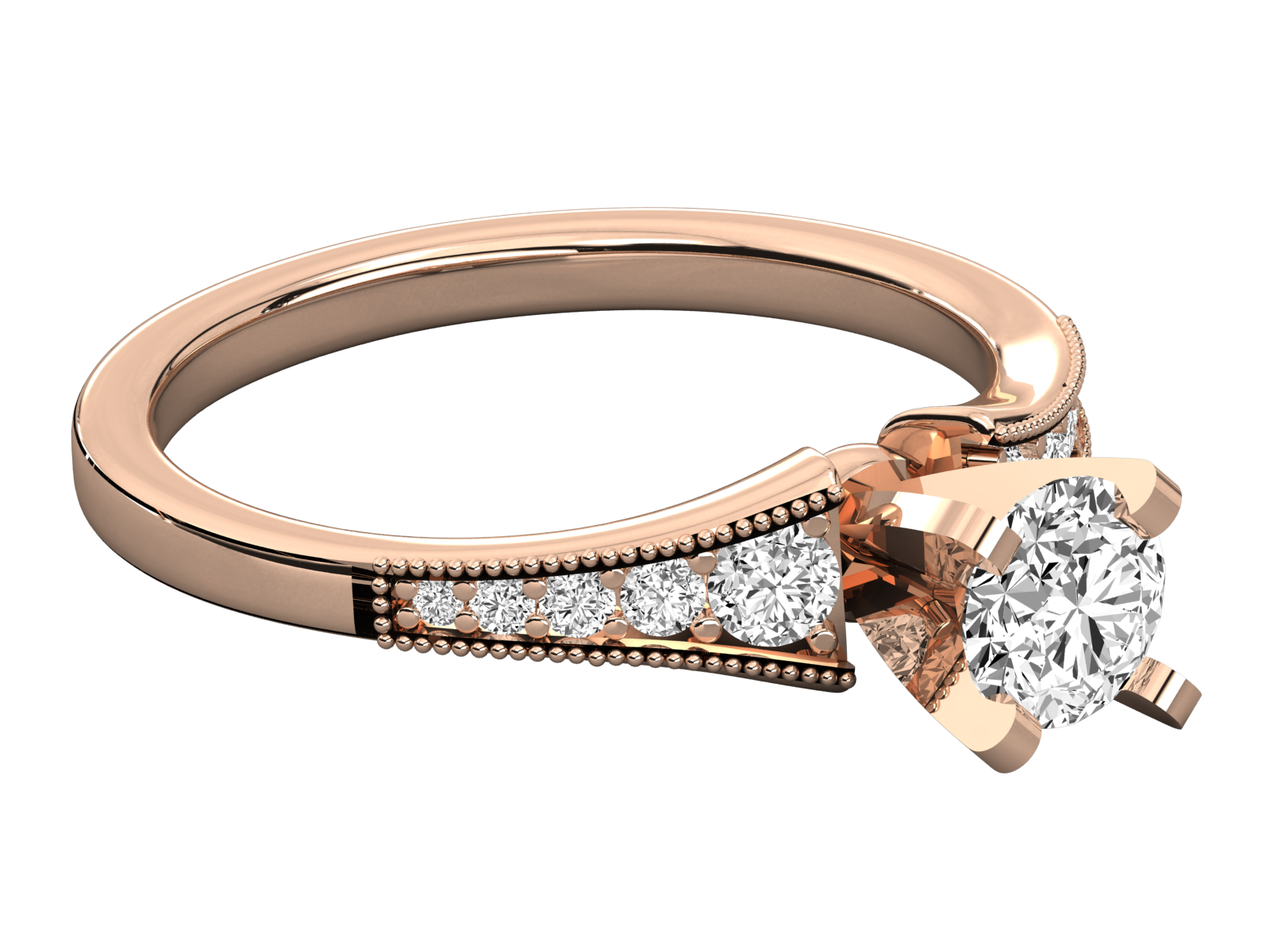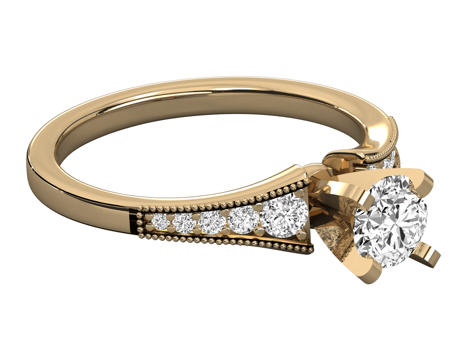 A captivating blend of vintage charm and modern elegance, this ring showcases a brilliant round-cut diamond in a secure prong setting. The intricate milgrain detailing and graduated diamond accents along the yellow gold band create timeless sophistication. A perfect choice for those seeking a romantic and heirloom-inspired engagement ring.
