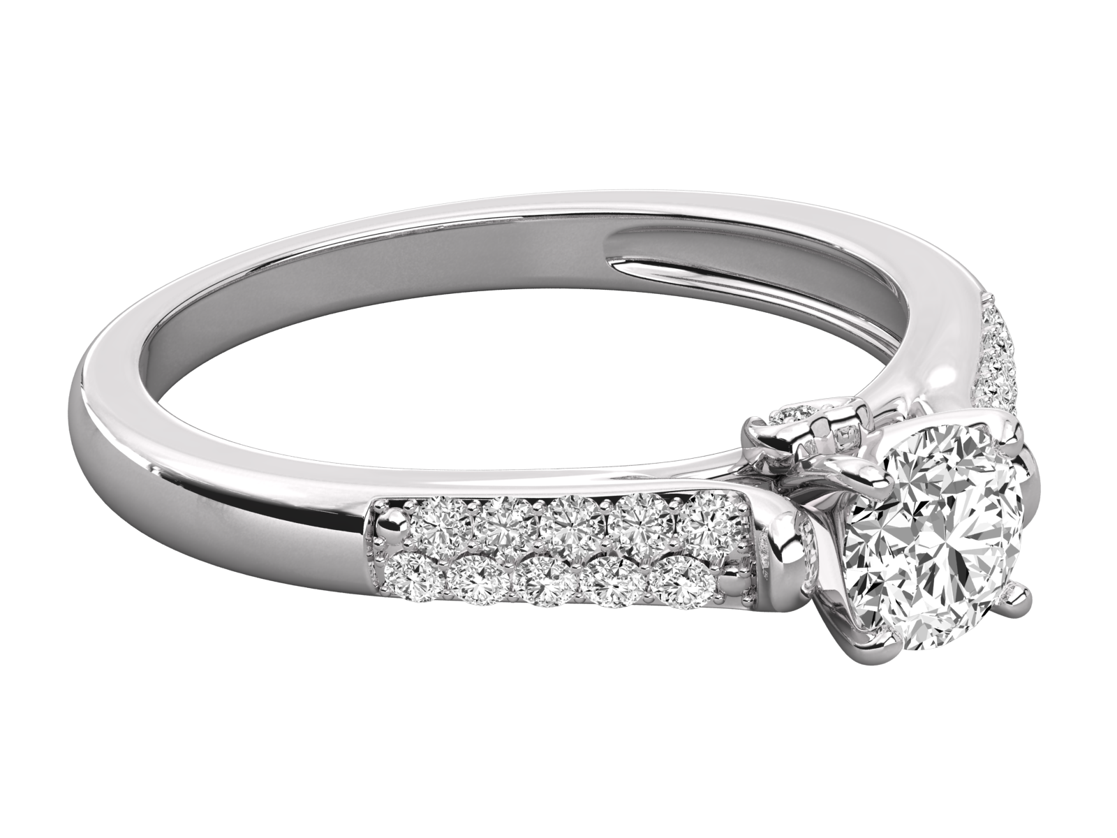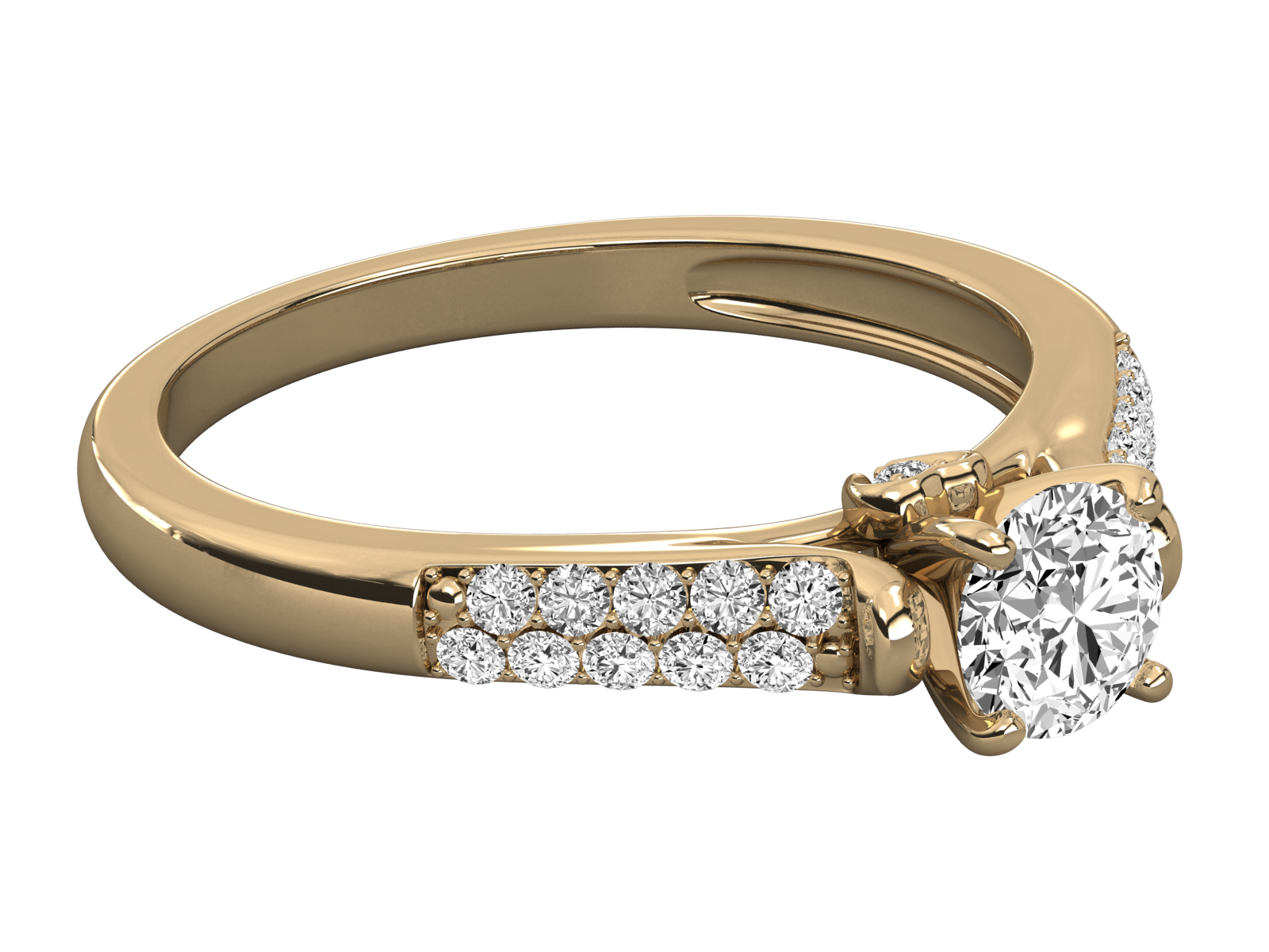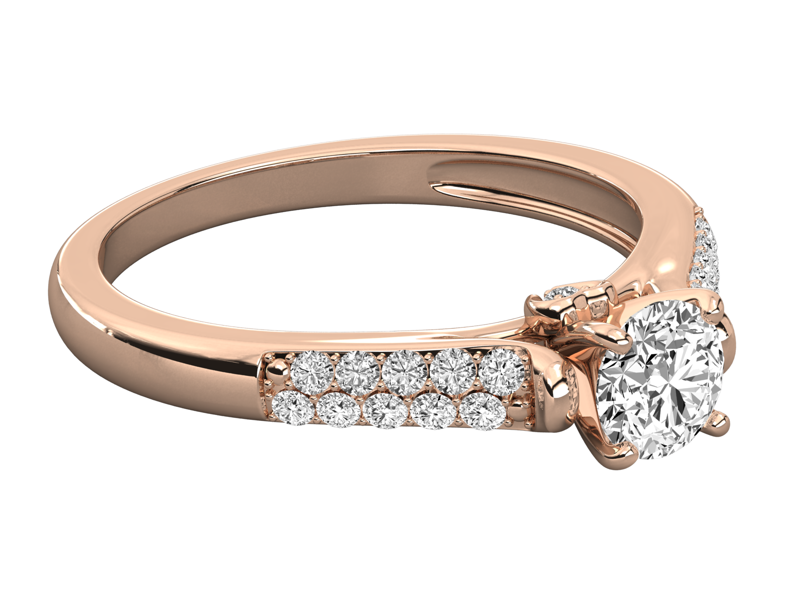 This elegant rose gold engagement ring. A brilliant round center diamond is accented by shimmering pave-set diamonds along the tapered band. The delicate design offers classic beauty with a modern touch, making it the perfect symbol of your everlasting love and commitment.