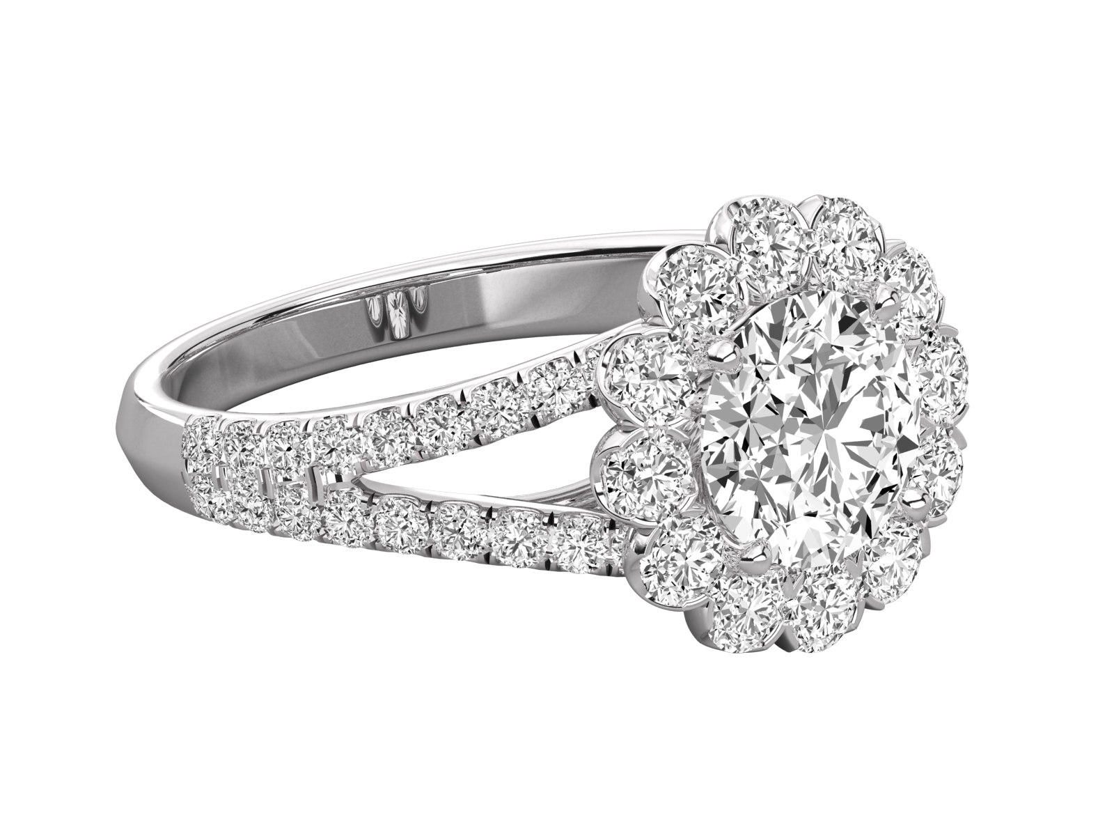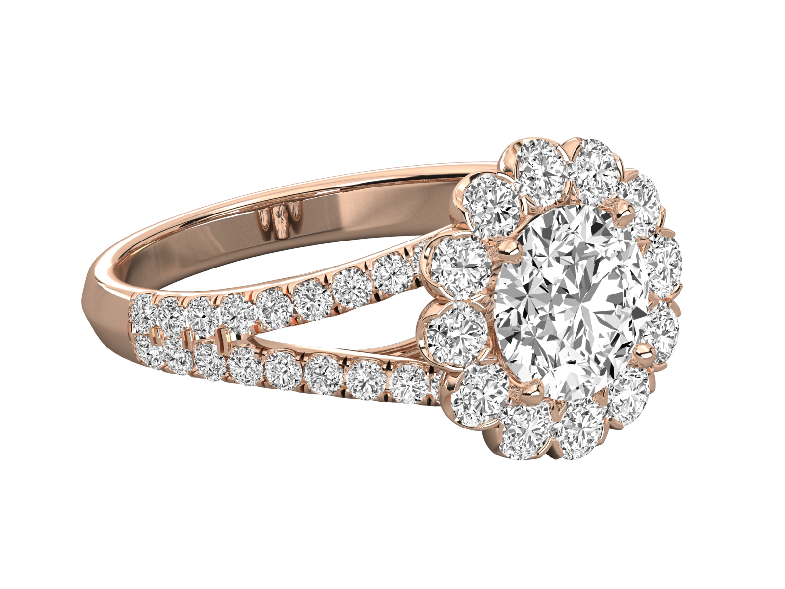 This breathtaking rose gold engagement ring features a radiant round center stone encircled by a floral halo of sparkling diamonds. The split shank design adds extra brilliance and elegance. Perfect for brides who love vintage glamour with a modern twist. A timeless flower-inspired piece to celebrate everlasting love and commitment.
