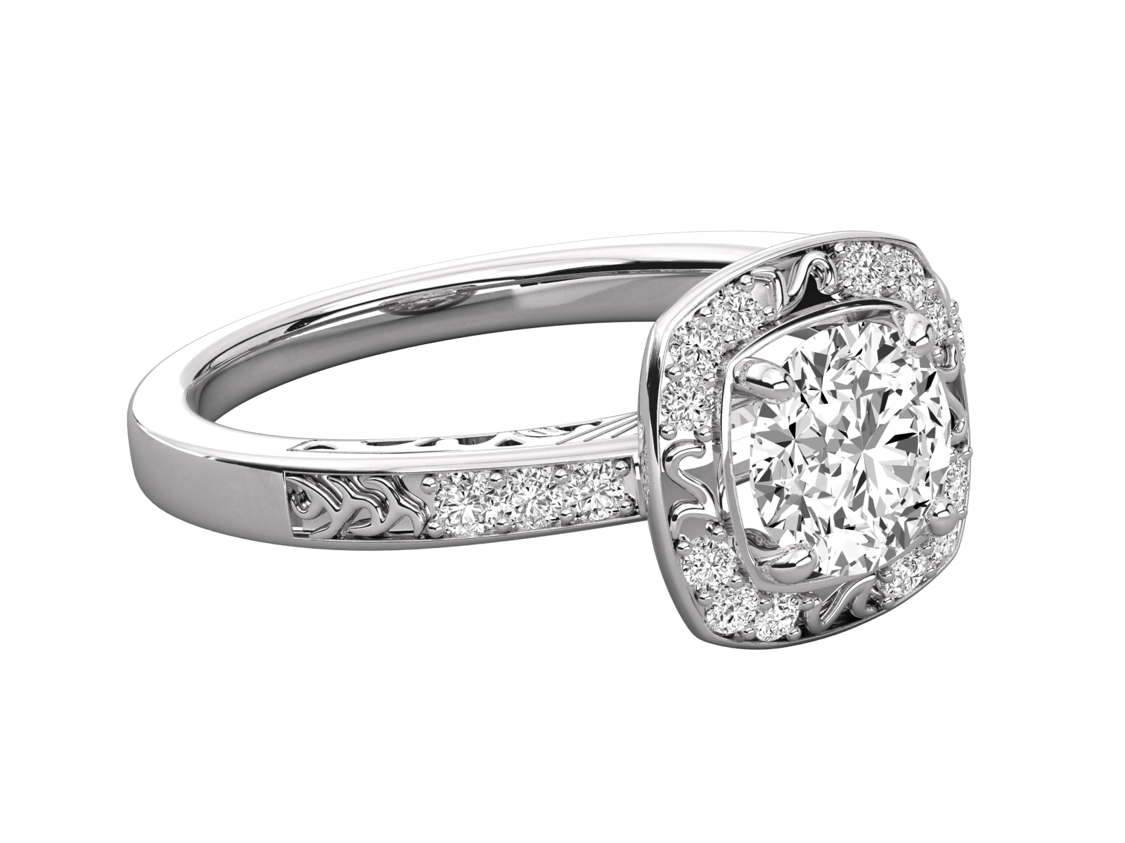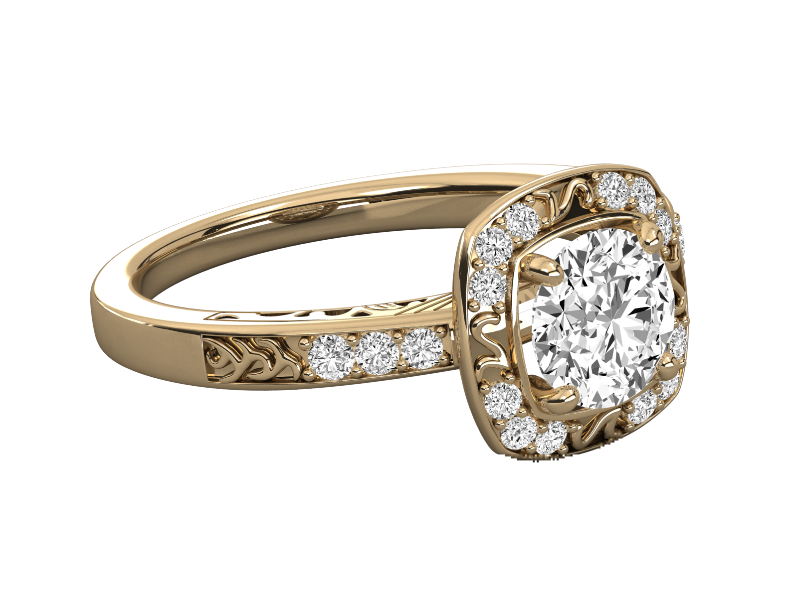 This vintage-inspired engagement ring features a dazzling round-cut center stone surrounded by a diamond halo. Delicate filigree details on the band and gallery evoke timeless charm and intricate craftsmanship. A perfect choice for those who adore antique elegance with a modern sparkle. Truly unforgettable.