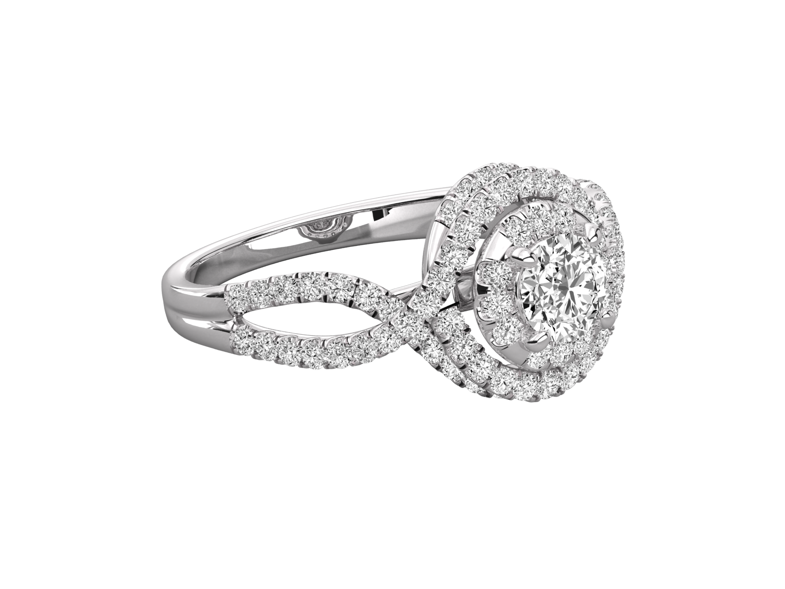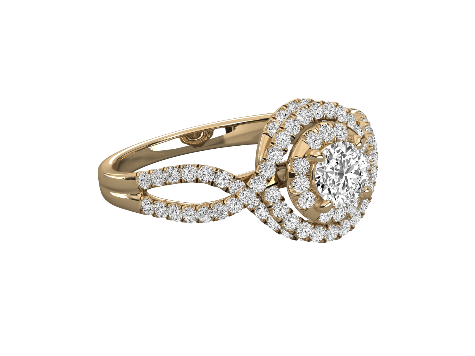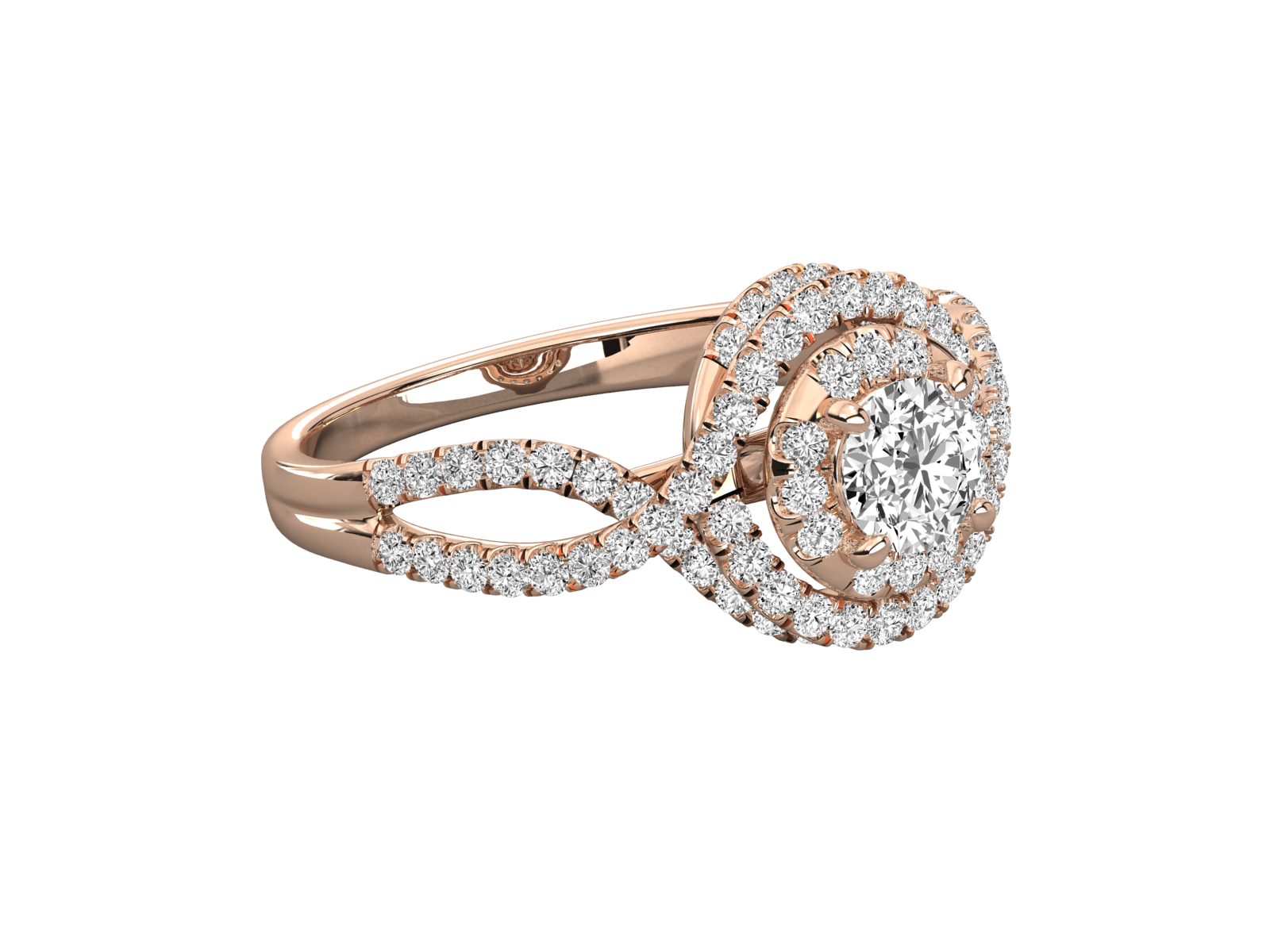 This infinity halo engagement ring features a brilliant round-cut diamond encircled by double halos of pavé-set stones. The twisting band in rose gold signifies eternal love and unity. A captivating and unique design perfect for proposals, anniversaries, or milestone celebrations. Handcrafted brilliance in every curve.