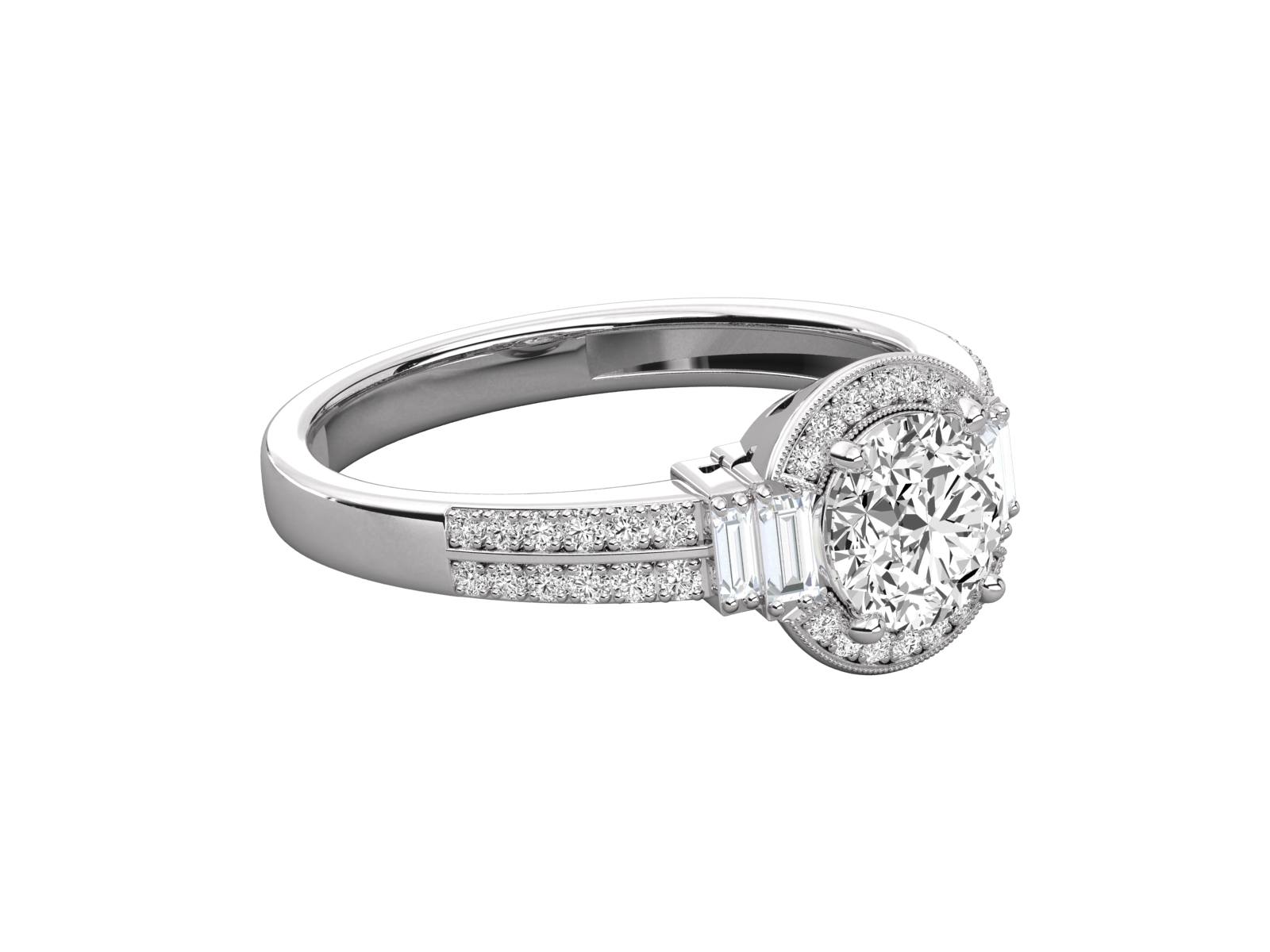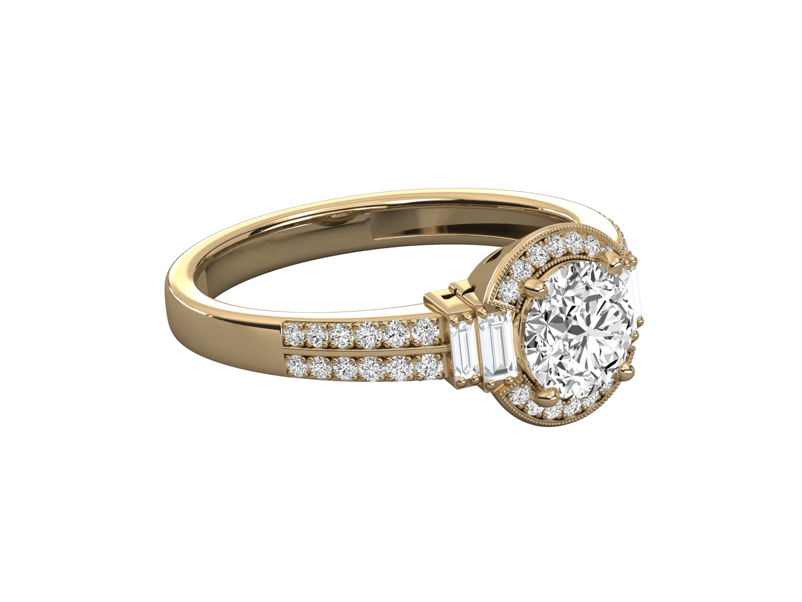 A timeless treasure, this gold engagement ring features a brilliant round center stone, framed by a vintage-style pavé halo. Flanked by two elegant baguette-cut diamonds and a double pavé band, this design combines sophistication and sparkle. Perfect for those who love art deco details and refined elegance with a modern twist.