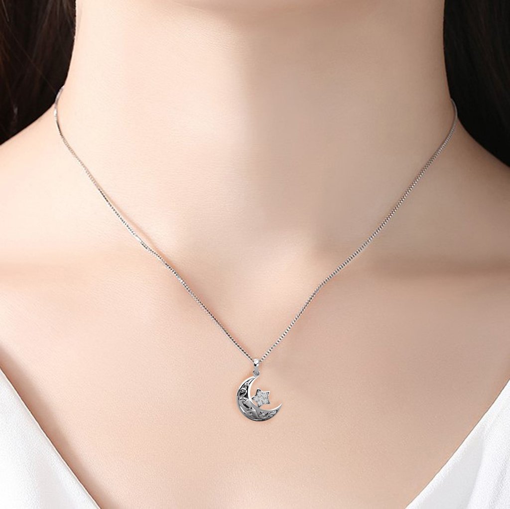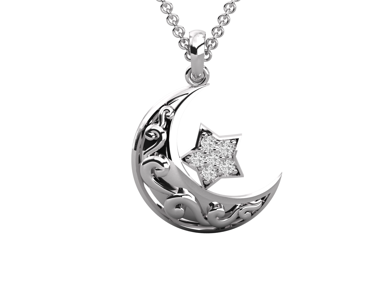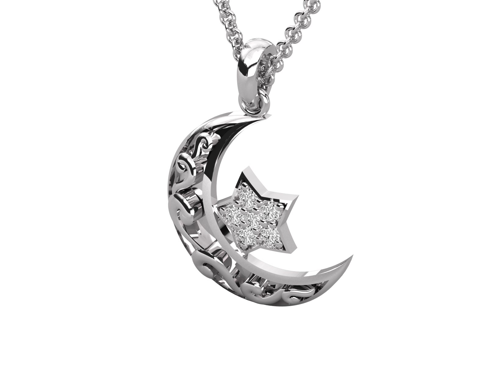 This stunning gold crescent moon and star pendant, adorned with sparkling diamonds. Featuring intricate floral scrollwork, it makes a meaningful gift for Ramadan, Eid, or spiritual occasions. A timeless celestial design perfect for daily wear or special celebrations. Includes chain. Symbolic, stylish, and spiritual.