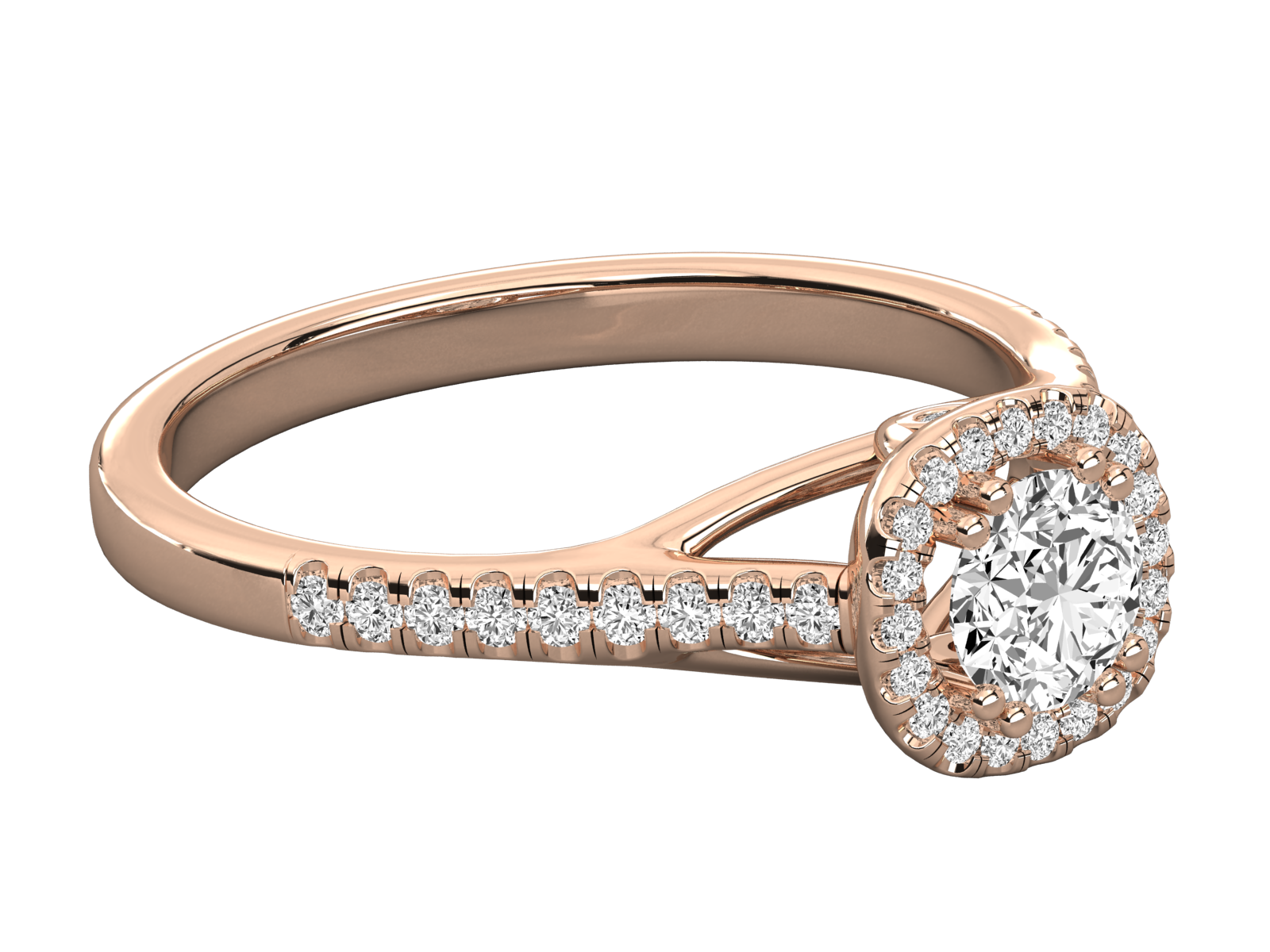 This exquisite engagement ring features a Round-shaped halo surrounding a brilliant round-cut center diamond. Crafted in radiant rose gold, the pave-set diamonds along the band add sparkle and sophistication. A timeless and romantic design, perfect for proposals and cherished moments that deserve elegance, brilliance, and everlasting beauty.