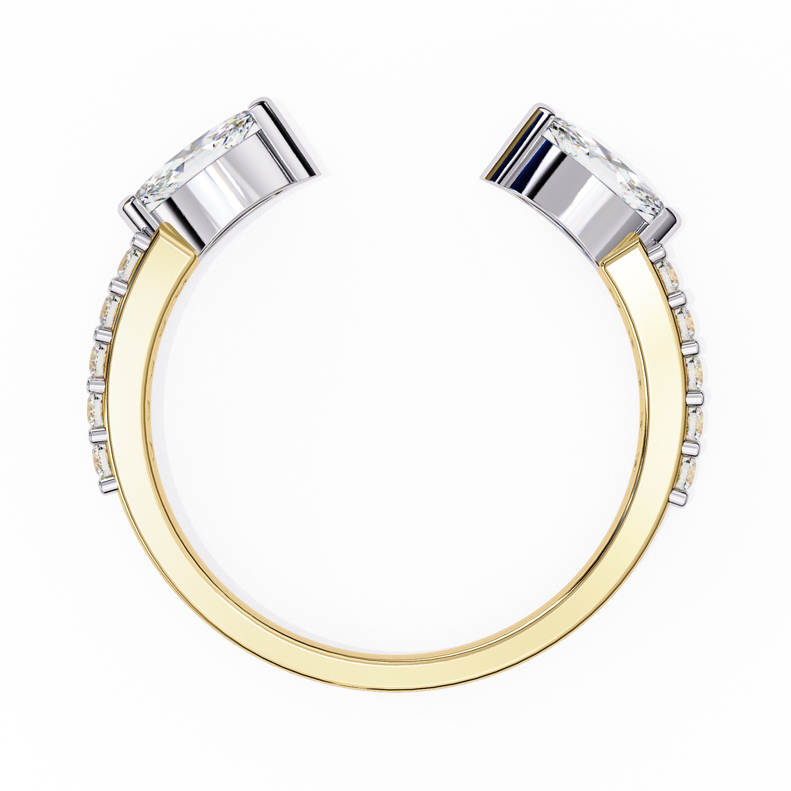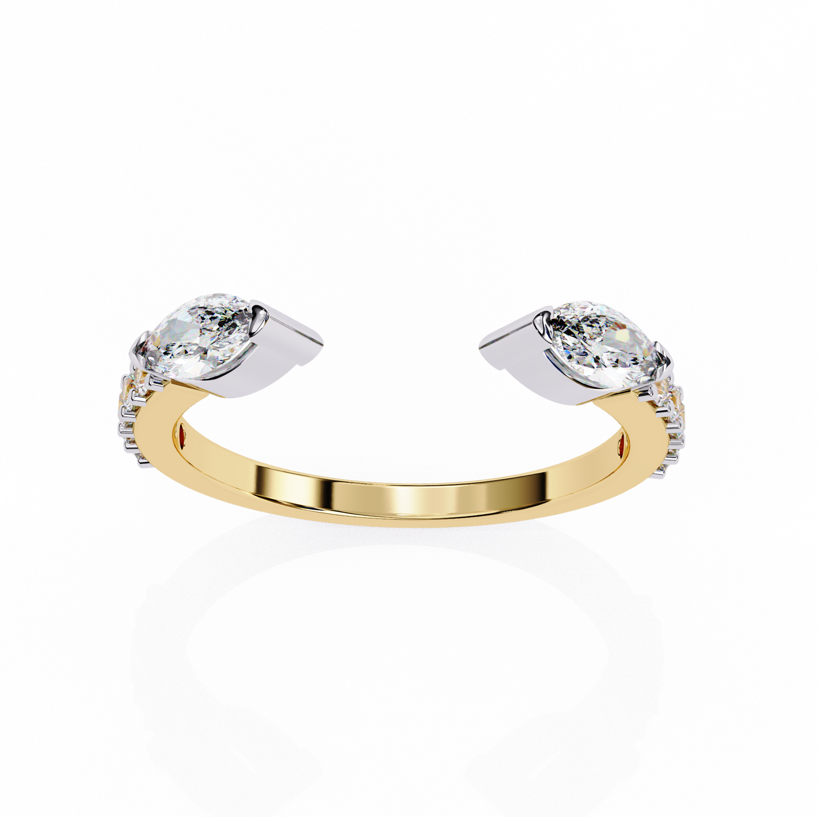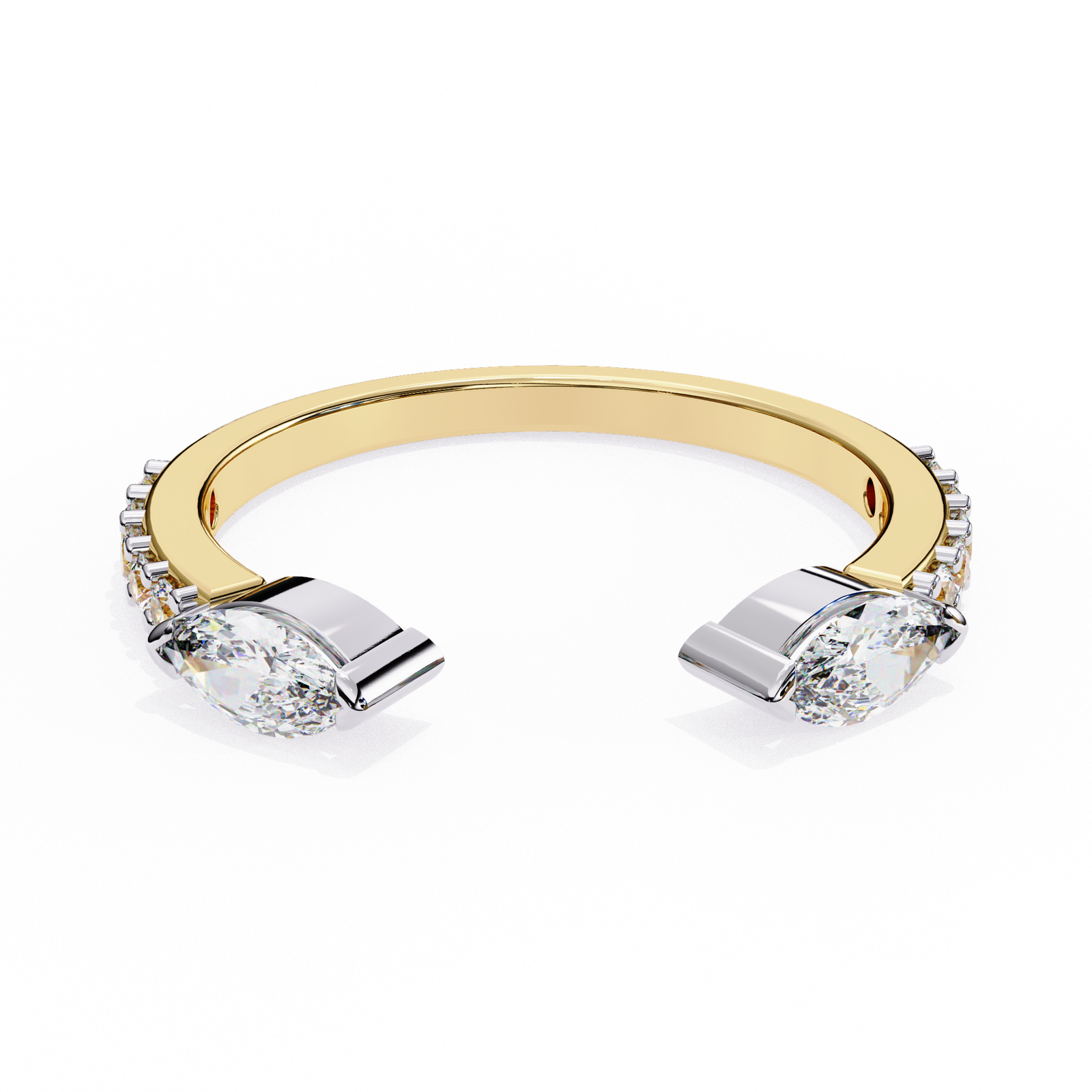 This open ring features two striking marquise-cut diamonds set in sleek gold caps, contrasted by a polished yellow gold band. Accented with delicate side diamonds, it blends elegance with contemporary flair. Perfect for stacking or wearing solo as a unique statement piece with refined sophistication.