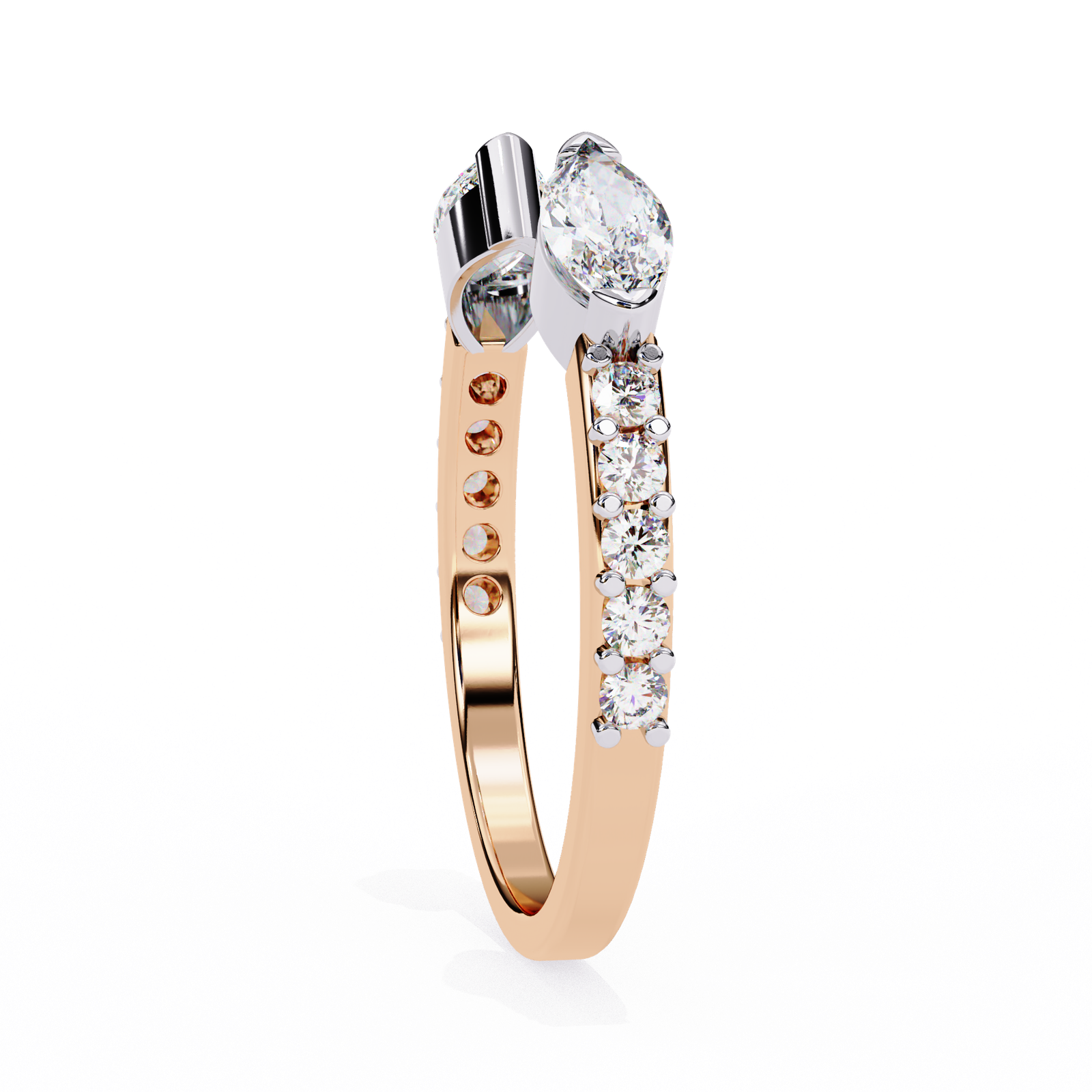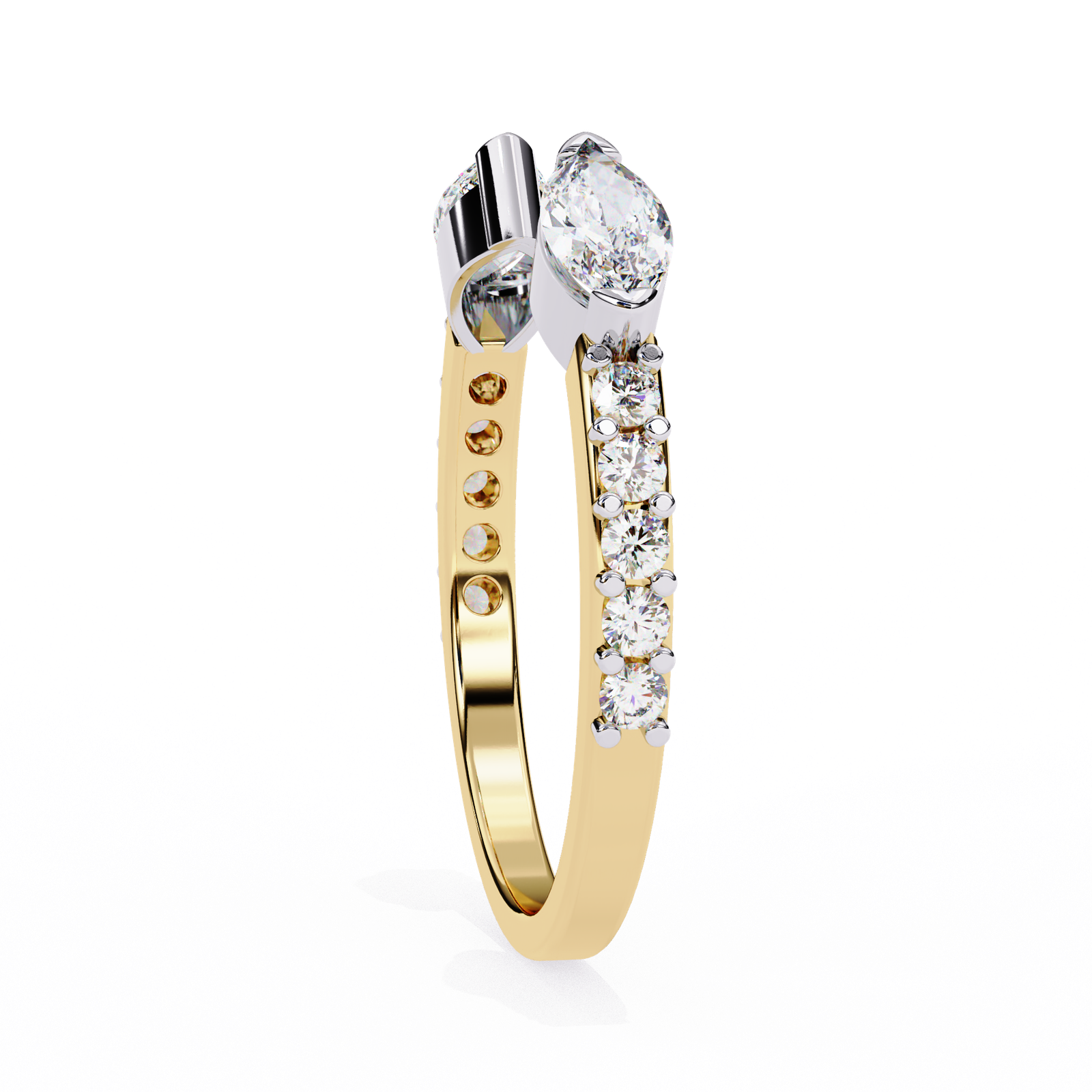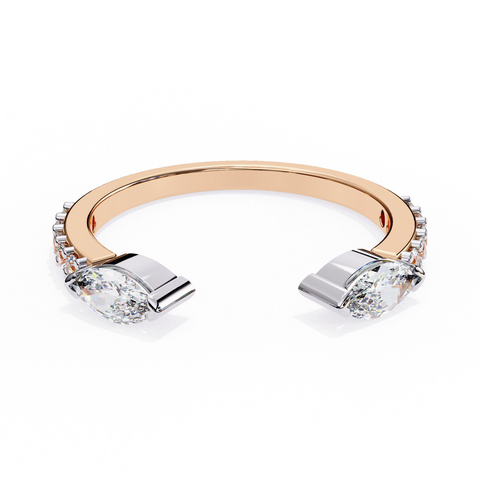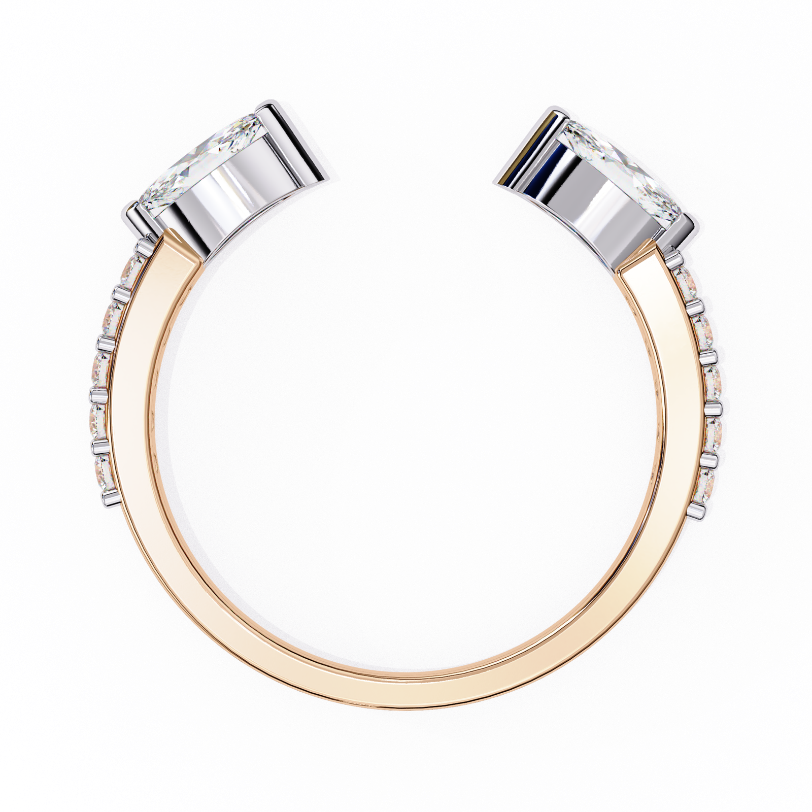 This open ring features two striking marquise-cut diamonds set in sleek gold caps, contrasted by a polished yellow gold band. Accented with delicate side diamonds, it blends elegance with contemporary flair. Perfect for stacking or wearing solo as a unique statement piece with refined sophistication.