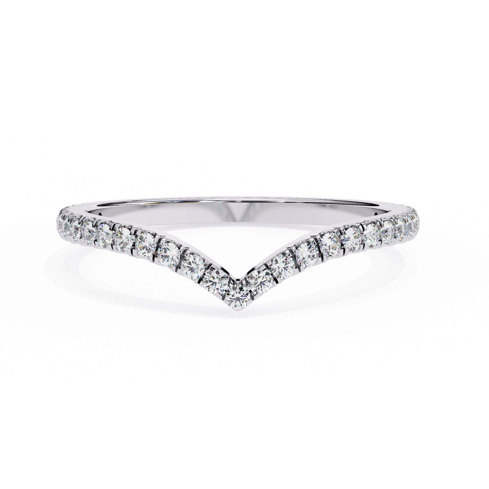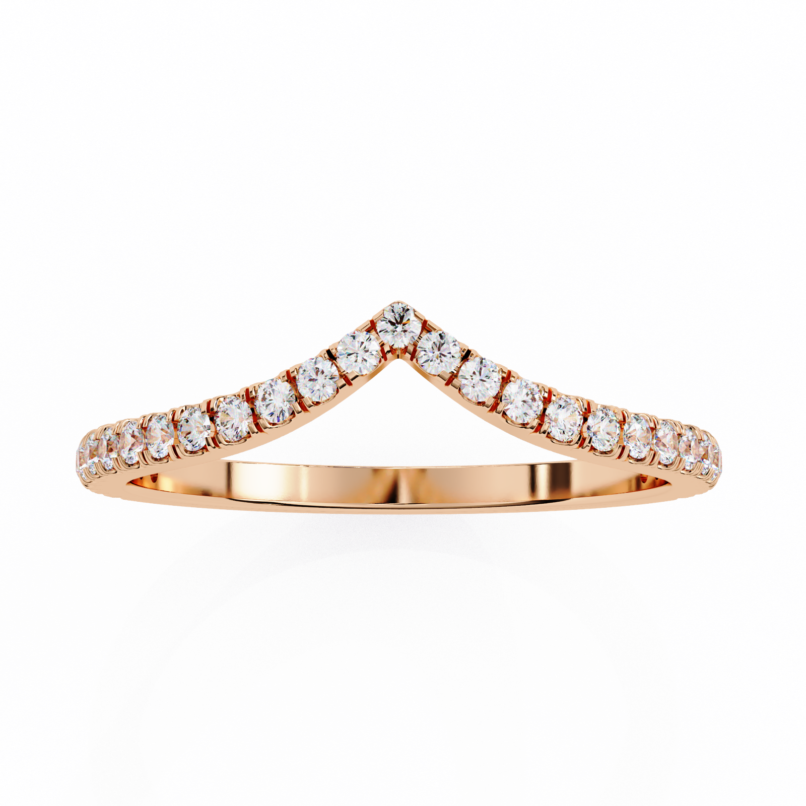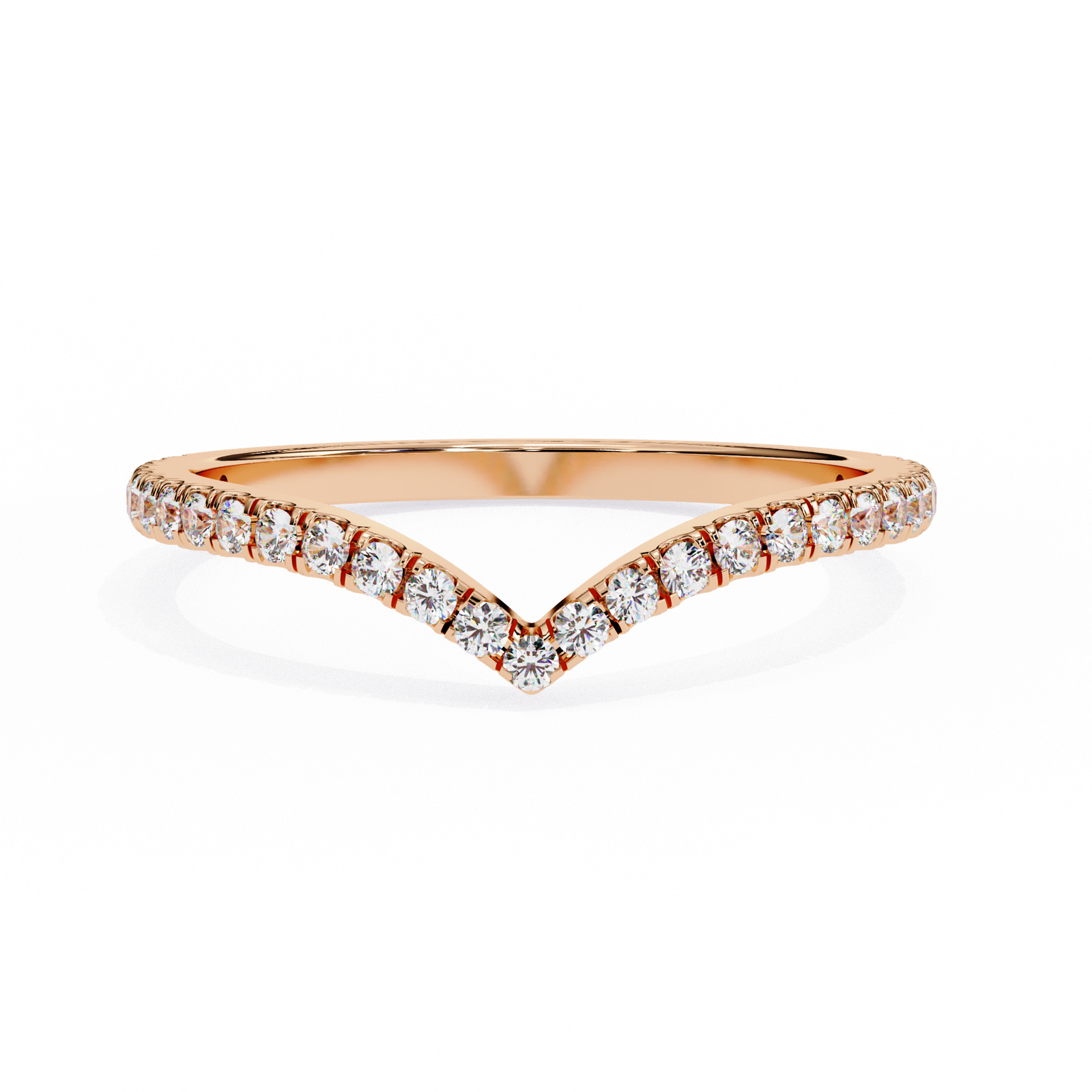 This chevron band features a sleek V-shaped design adorned with brilliant round diamonds, set in warm rose gold. Perfect for stacking, pairing with an engagement ring, or wearing solo, this ring adds a touch of sparkle and sophistication to any jewelry collection with timeless grace.
