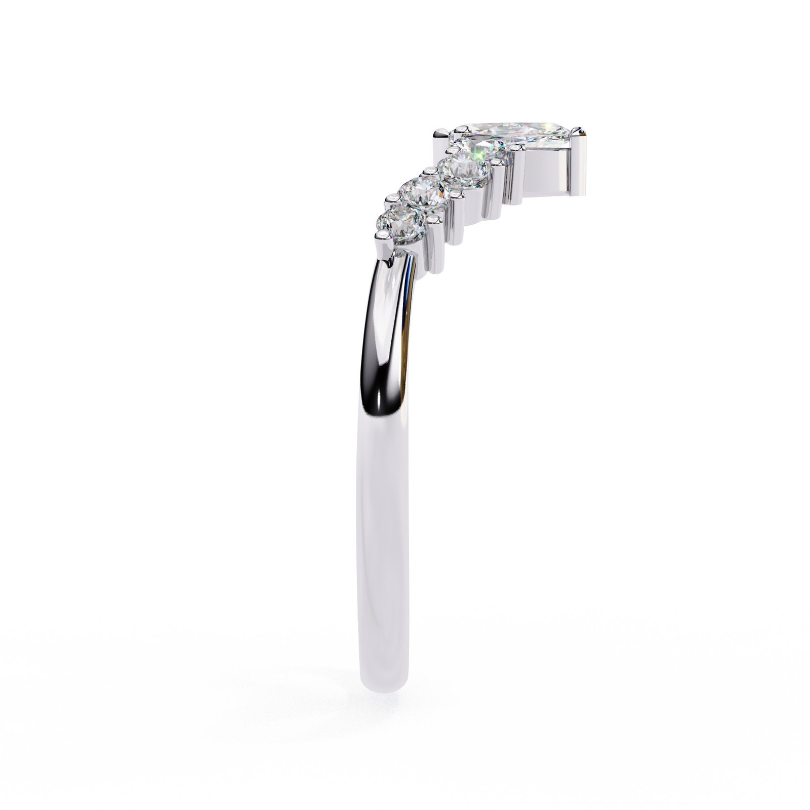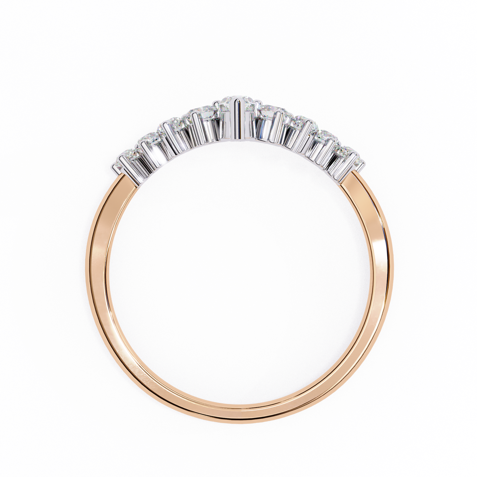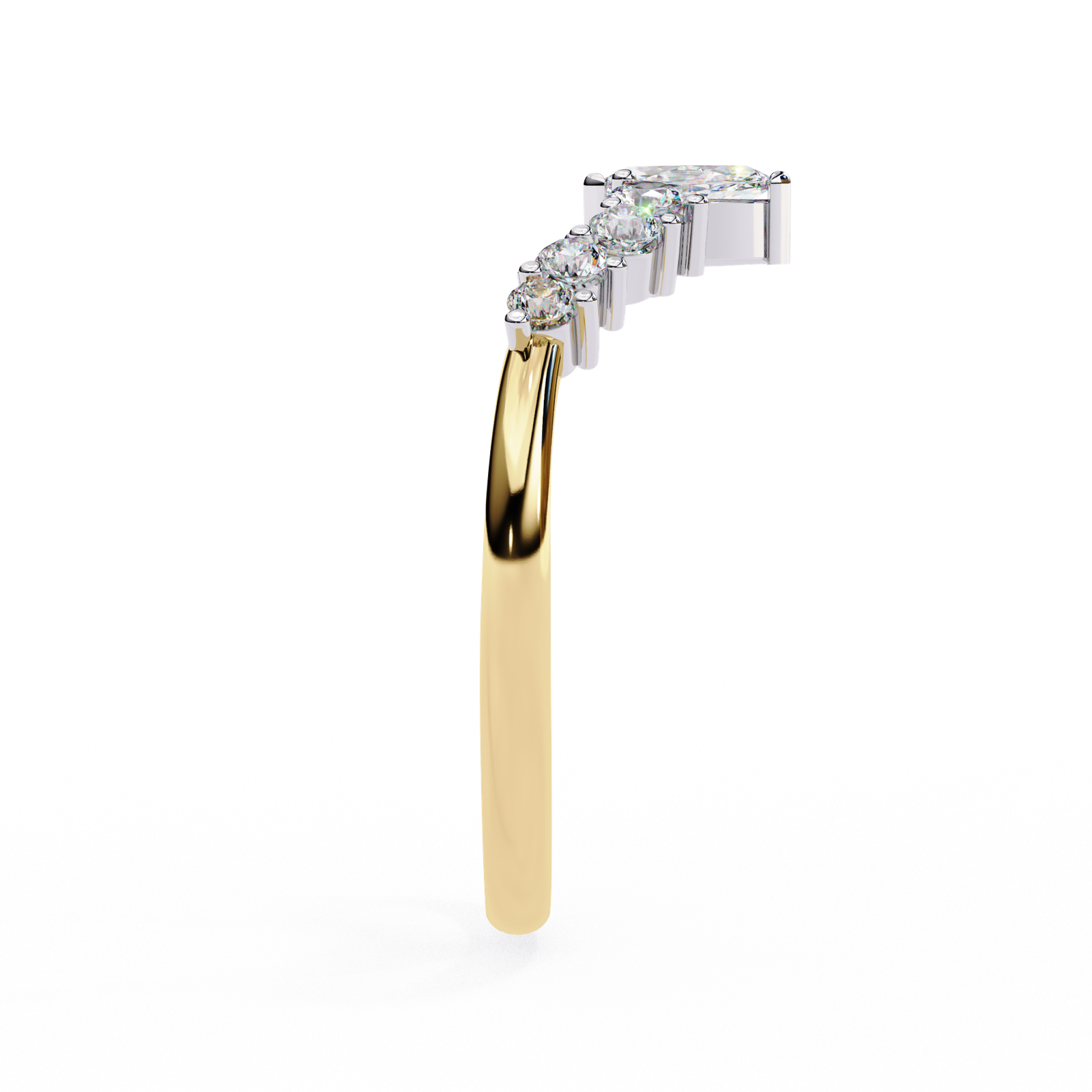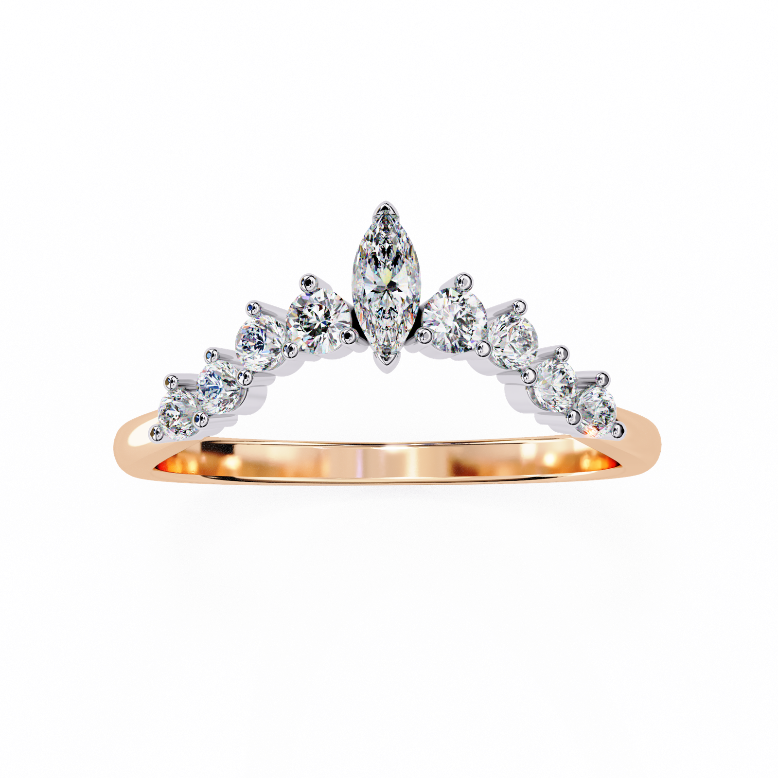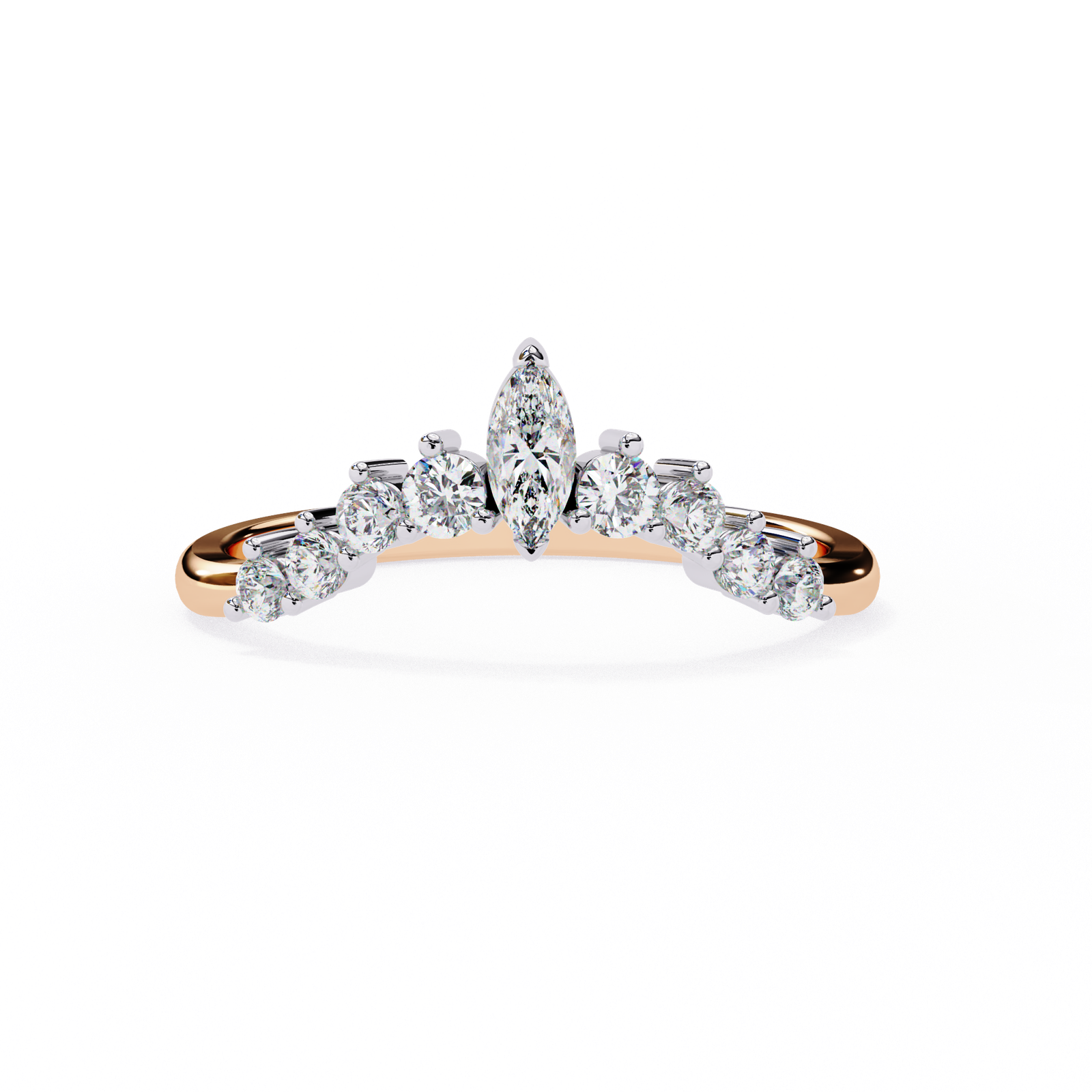 This tiara-inspired ring features a striking marquise-cut diamond centerpiece accented by tapered round and pear-shaped diamonds, set in shimmering white gold atop a delicate rose gold band. A romantic blend of elegance and sparkle, perfect as a wedding band, crown ring, or a fairytale-inspired statement piece.