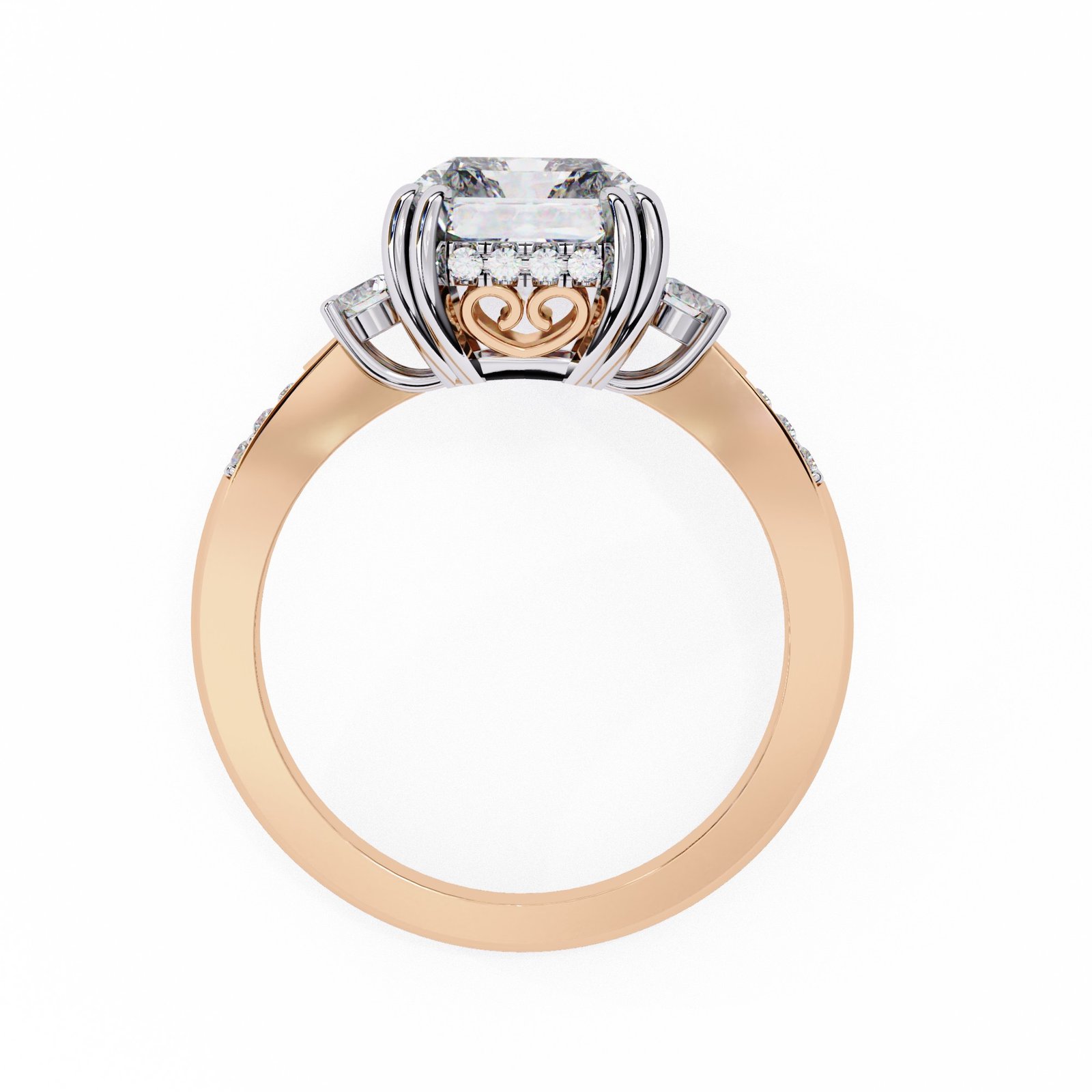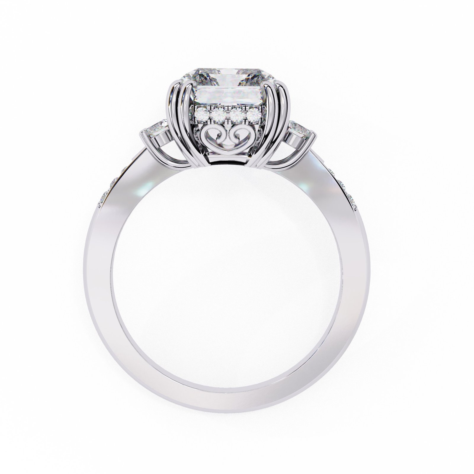 This radiant-cut diamond ring dazzles with brilliance and elegance. Set in lustrous white gold or platinum, the centerpiece is flanked by round side stones and accented by pavé diamonds along the band. A vintage-inspired gallery adds charm, making this a stunning symbol of love, style, and timeless sophistication.