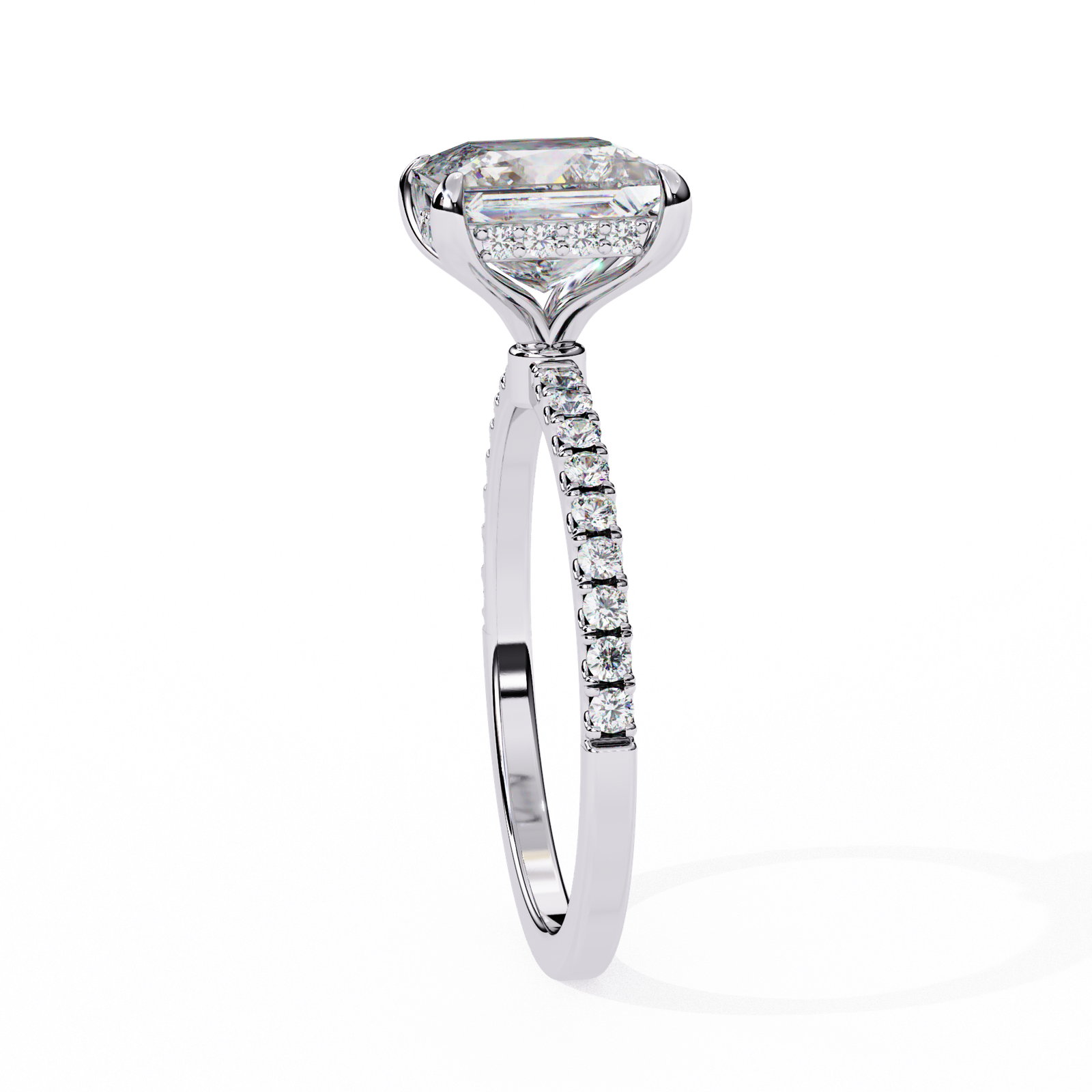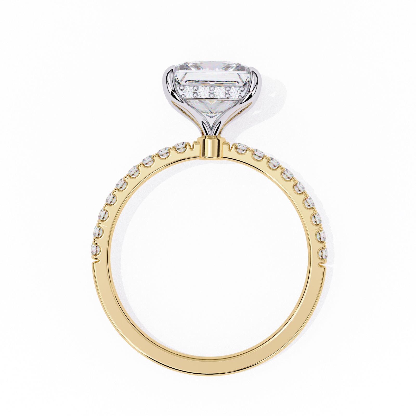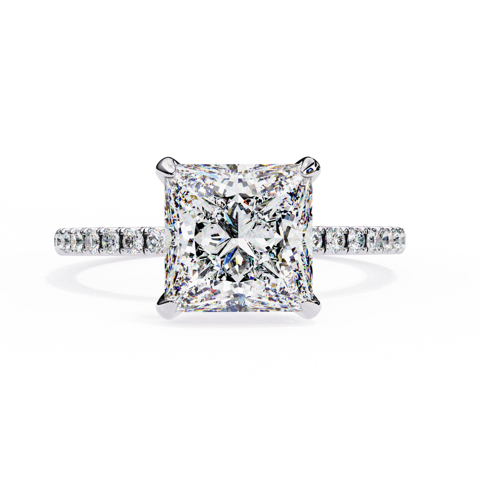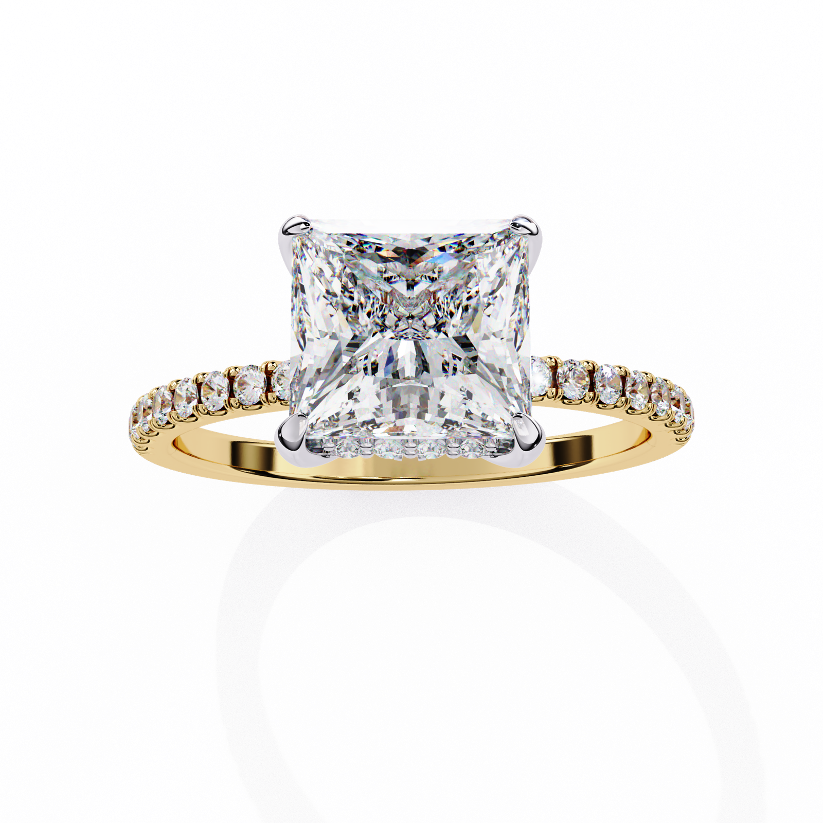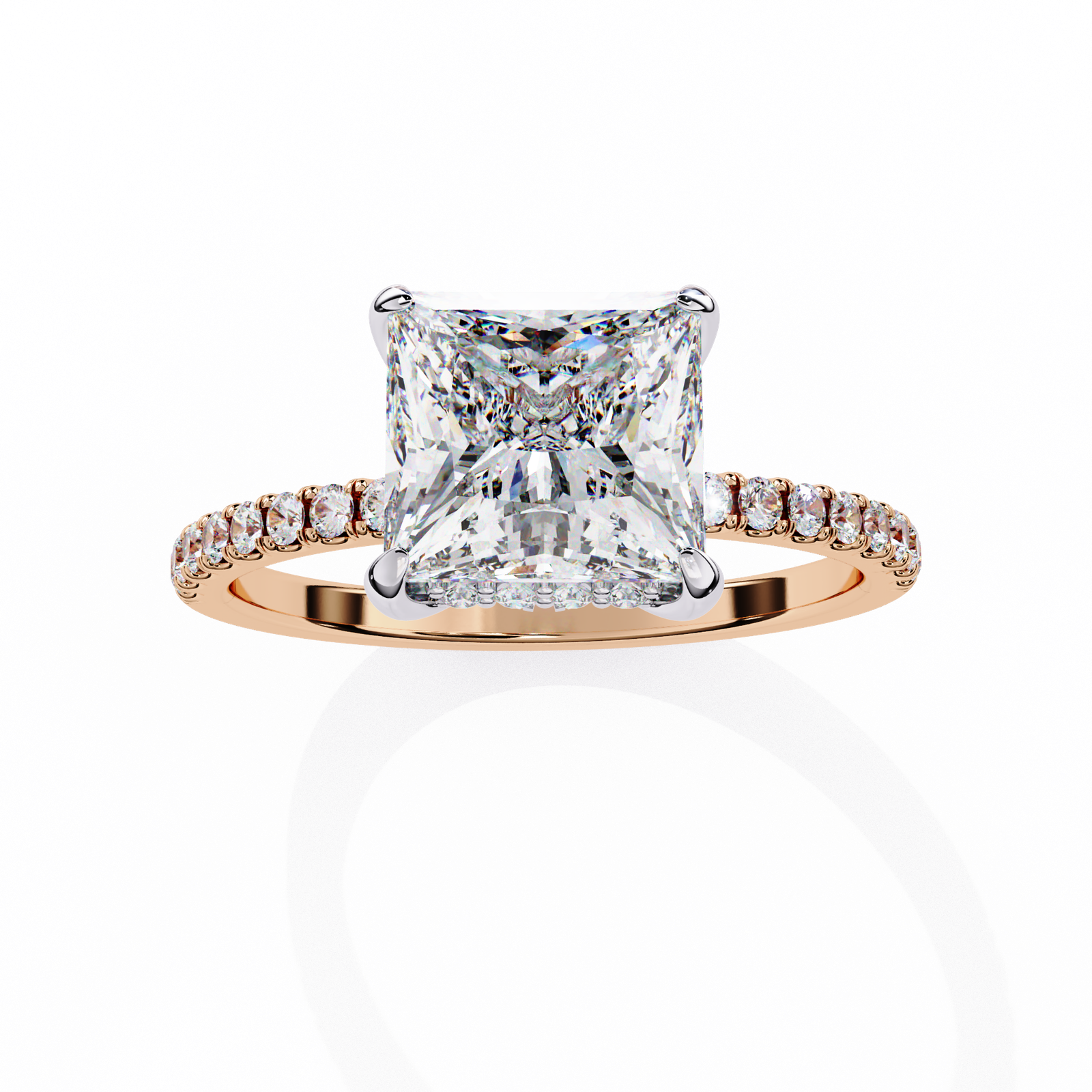 A dazzling princess-cut diamond takes center stage in this elegant ring, held securely by a four-prong setting. The Pave-set diamond band adds extra sparkle and sophistication, creating a look that?s both luxurious and timeless. Ideal for those who want the brilliance of a solitaire with the added glamour of a diamond-accented band.