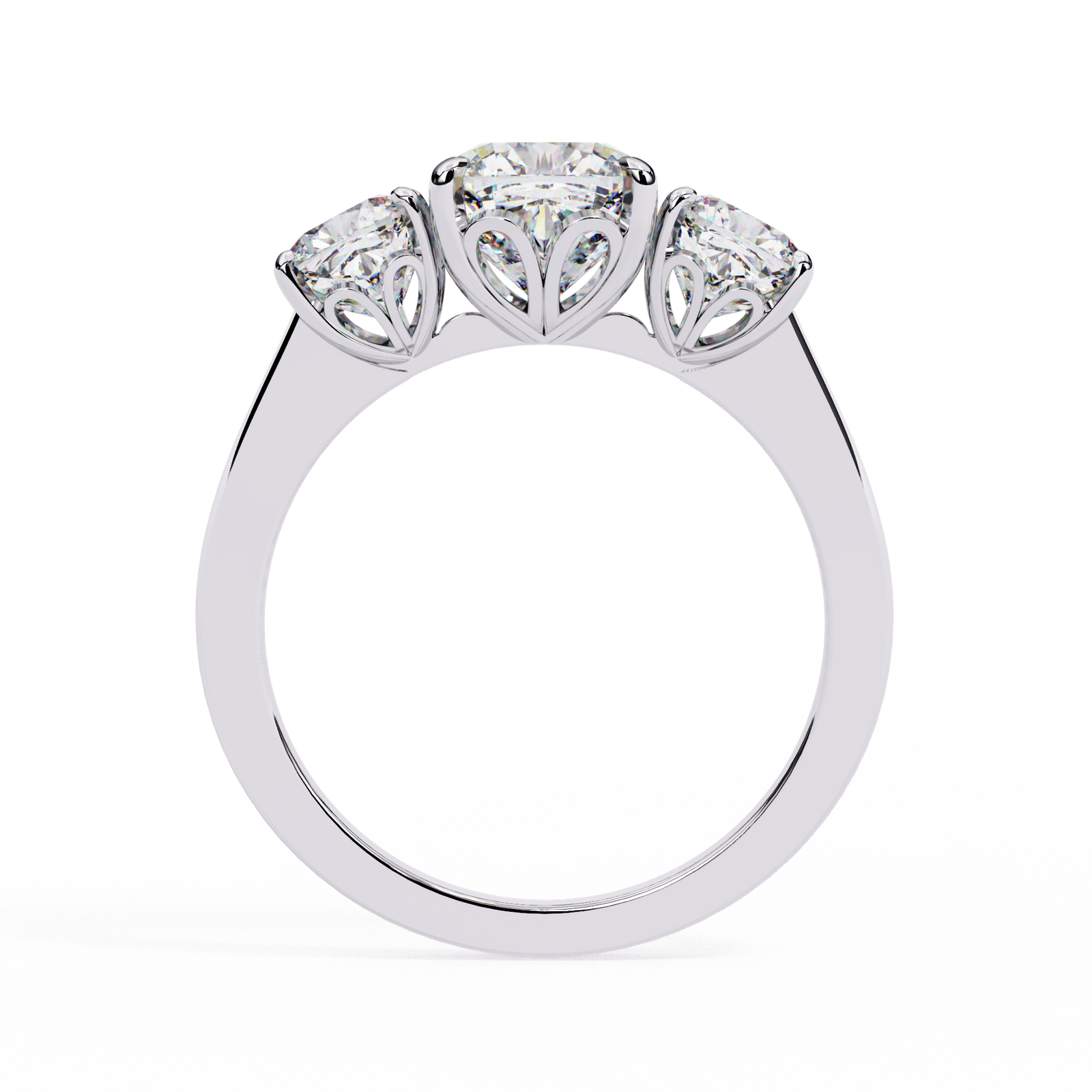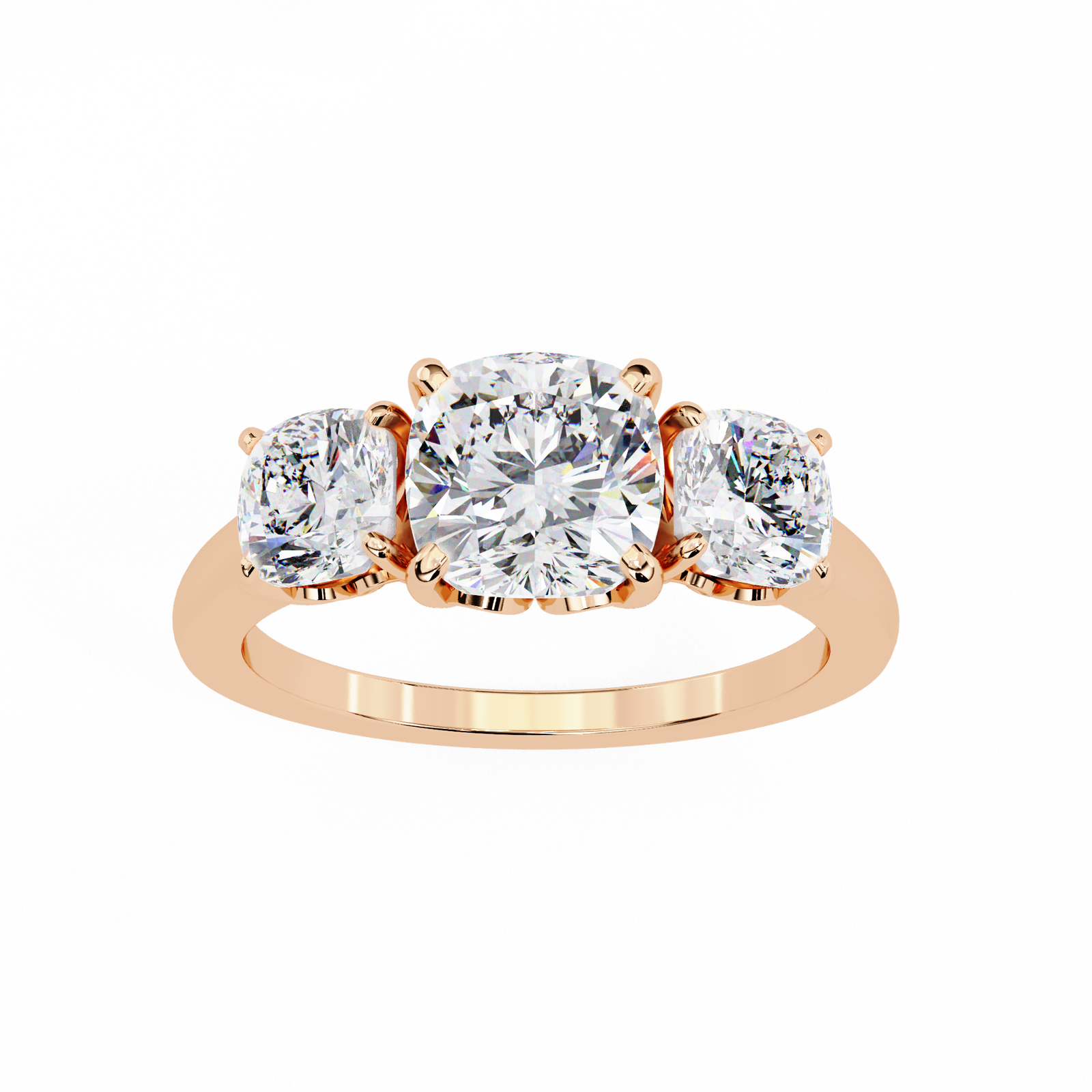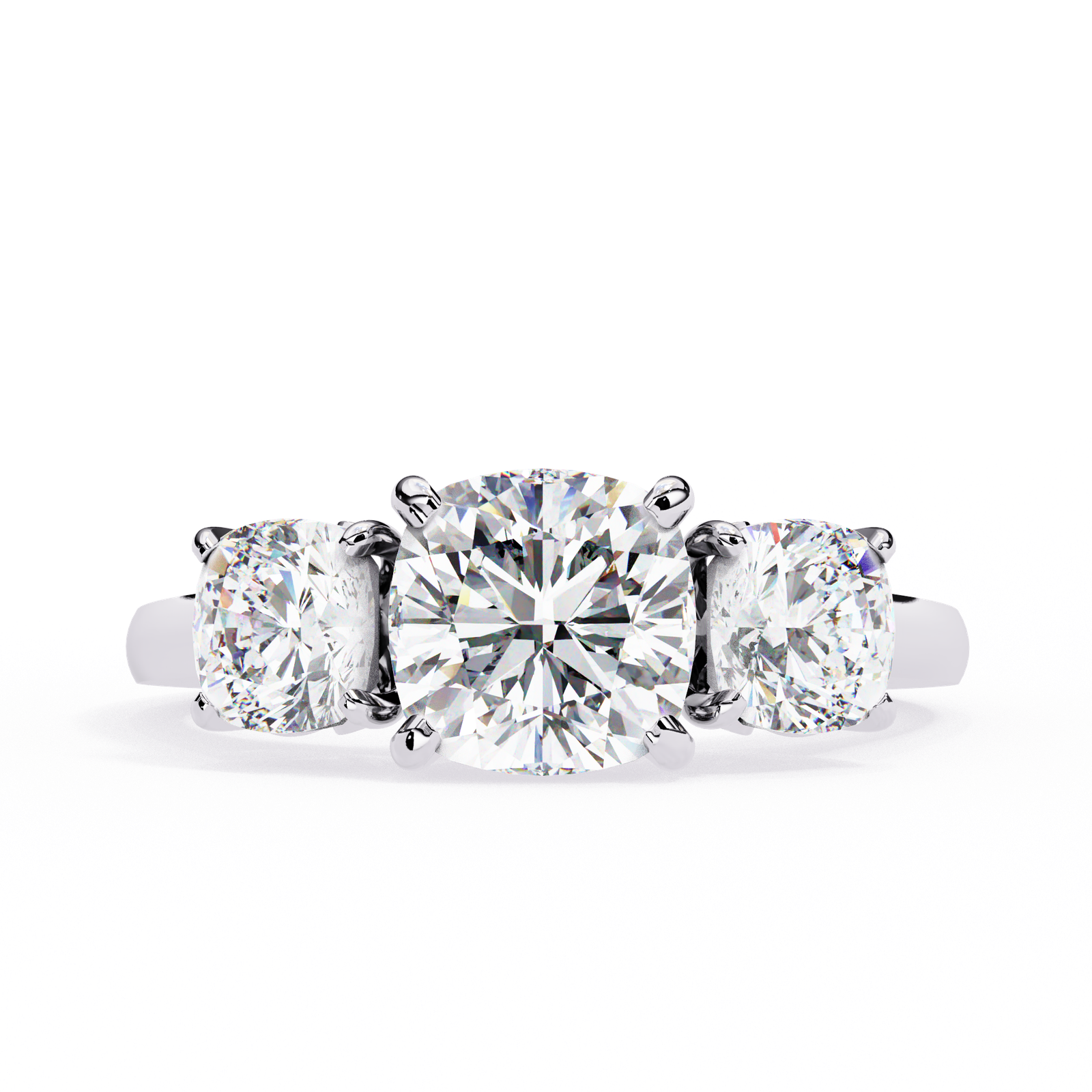 This stunning ring features a cushion-cut center diamond accented by two matching round brilliant side diamonds. The three-stone setting symbolizes the past, present, and future of love, making it a meaningful and timeless choice. Crafted in polished metal with a secure prong setting, this ring exudes brilliance and sophistication.