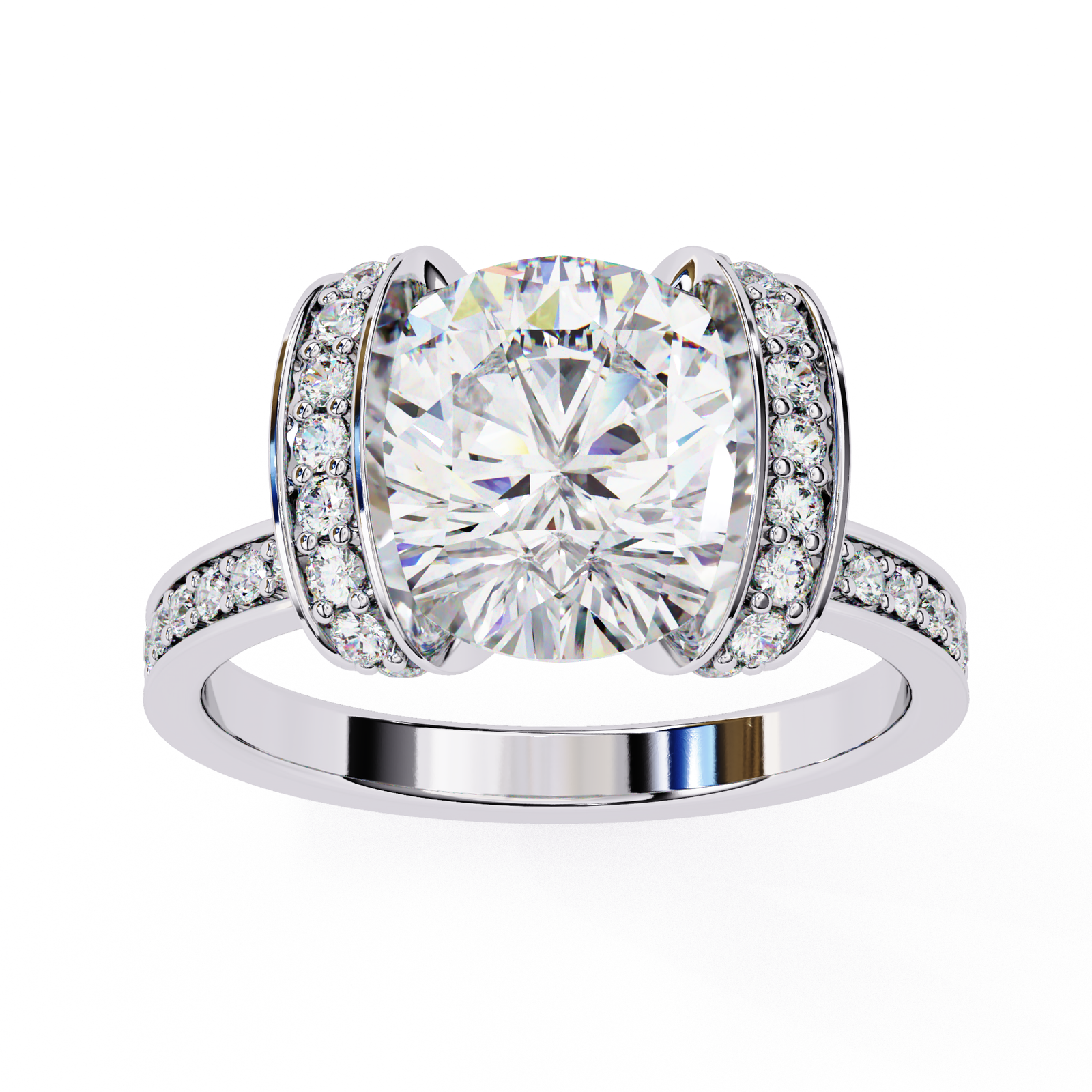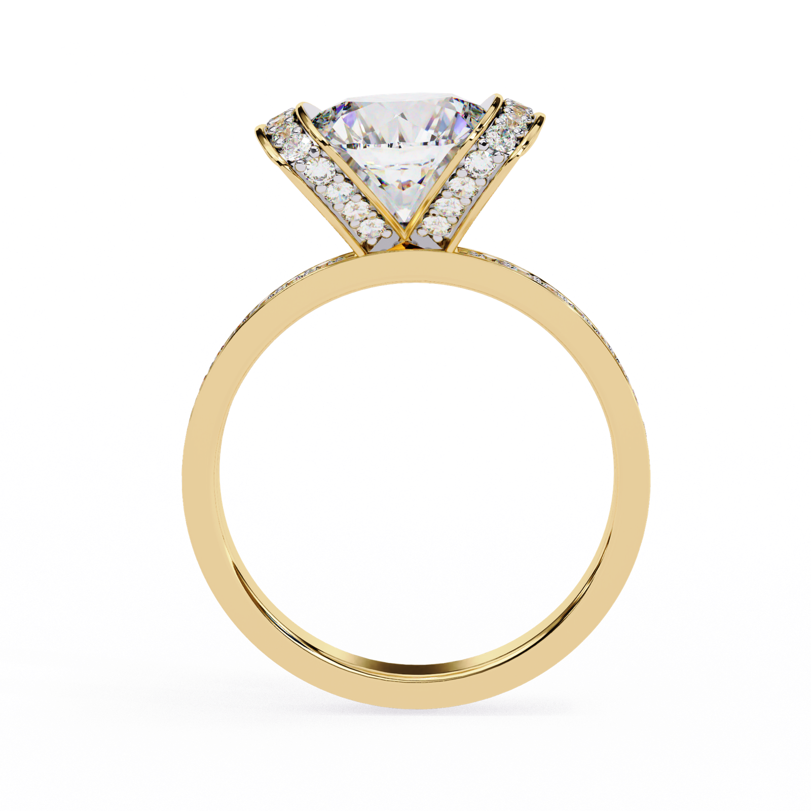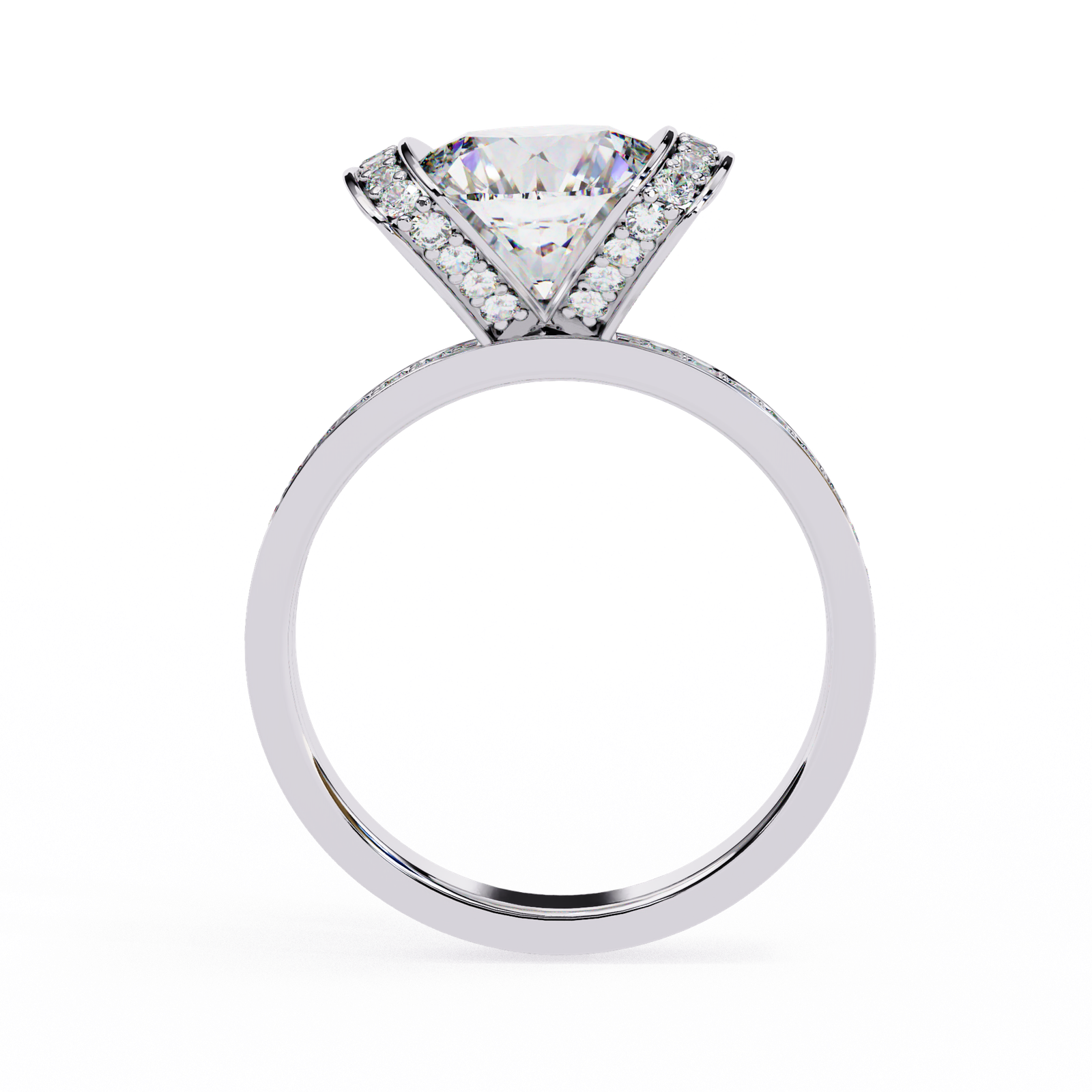 This bold and contemporary ring showcases a brilliant round-cut center diamond, embraced by two curved rows of Pave-set diamonds that create a striking double-halo effect. The shimmering band is adorned with additional accent diamonds, ensuring sparkle from every angle. With its unique architecture and radiant design, this ring beautifully combines modern artistry with timeless brilliance?a perfect statement piece for those who dare to stand out.