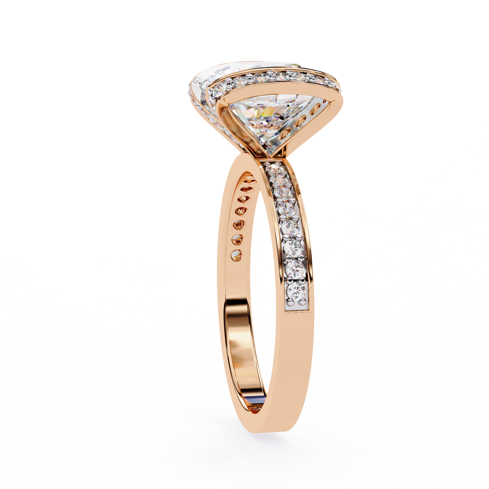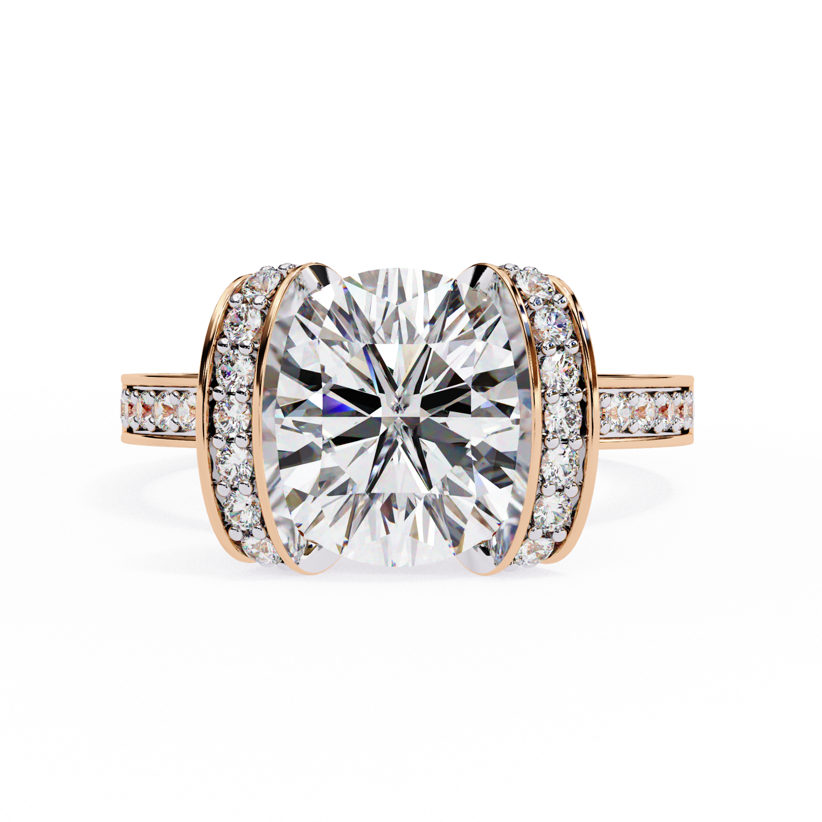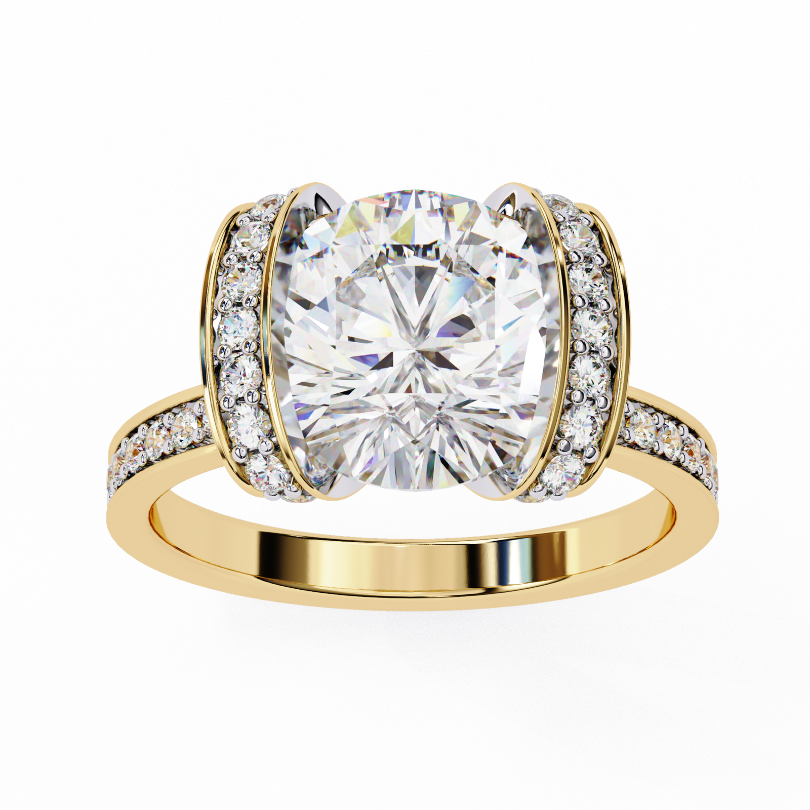 This bold and contemporary ring showcases a brilliant round-cut center diamond, embraced by two curved rows of Pave-set diamonds that create a striking double-halo effect. The shimmering band is adorned with additional accent diamonds, ensuring sparkle from every angle. With its unique architecture and radiant design, this ring beautifully combines modern artistry with timeless brilliance?a perfect statement piece for those who dare to stand out.