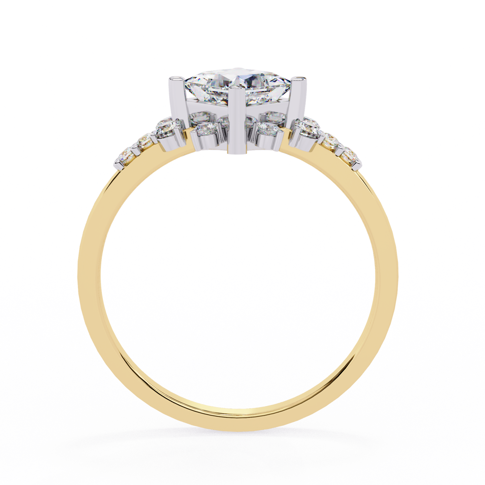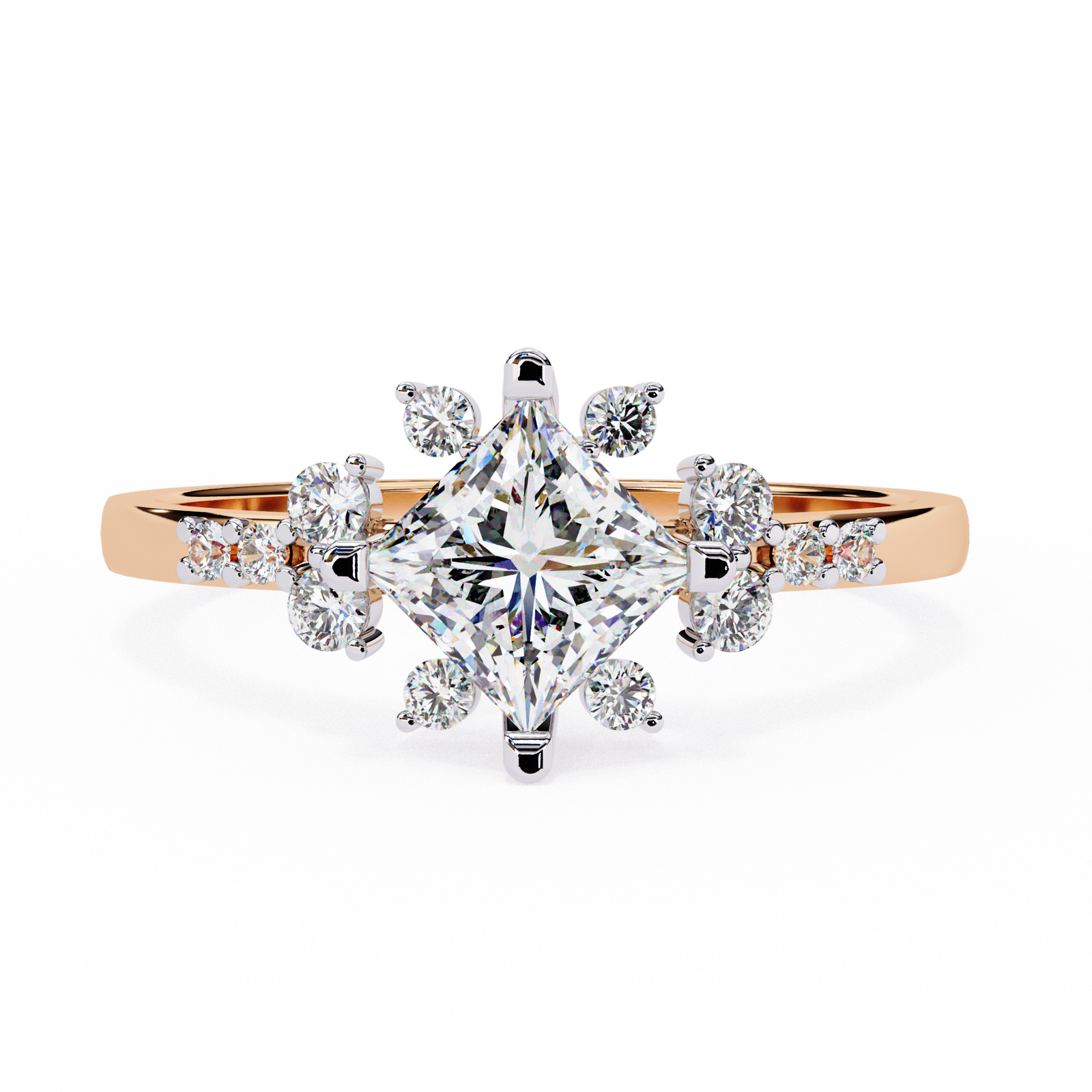 At the heart of this design lies a dazzling princess-cut diamond, set in a unique orientation to showcase its modern brilliance. Surrounding it, a delicate arrangement of round accent diamonds forms a sparkling cluster that enhances the center stone?s fire. The slim polished band adds balance, making this ring a refined statement of grace and radiance. Perfect for those who love a blend of classic elegance with contemporary charm.