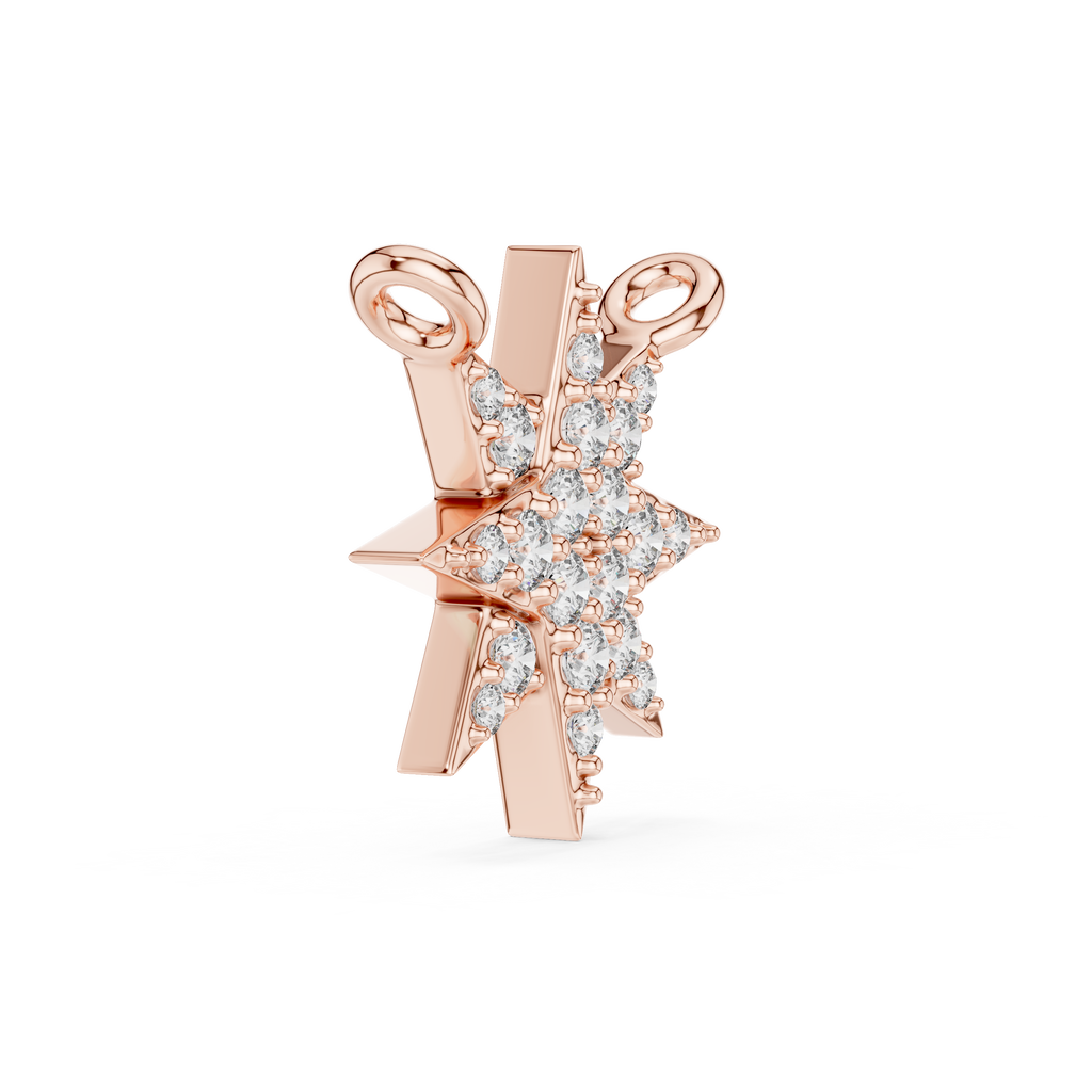 This sophisticated jewelry component is an eight-point starburst connector expertly crafted in elegant rose gold. The piece features a striking, symmetrical celestial silhouette adorned with a shimmering pav?-set diamond cluster that radiates from its center. Each point of the star is meticulously finished with high-polish metal and delicate beadwork to enhance its architectural depth and brilliance. Designed for versatility, the connector includes two integrated loops at the top, making it an ideal focal point for bridging chains in personalized necklaces or bracelets. Balancing timeless celestial symbolism with a contemporary geometric form, this starburst element offers a unique way to incorporate high-shine luxury and celestial-inspired sparkle into any custom jewelry ensemble.