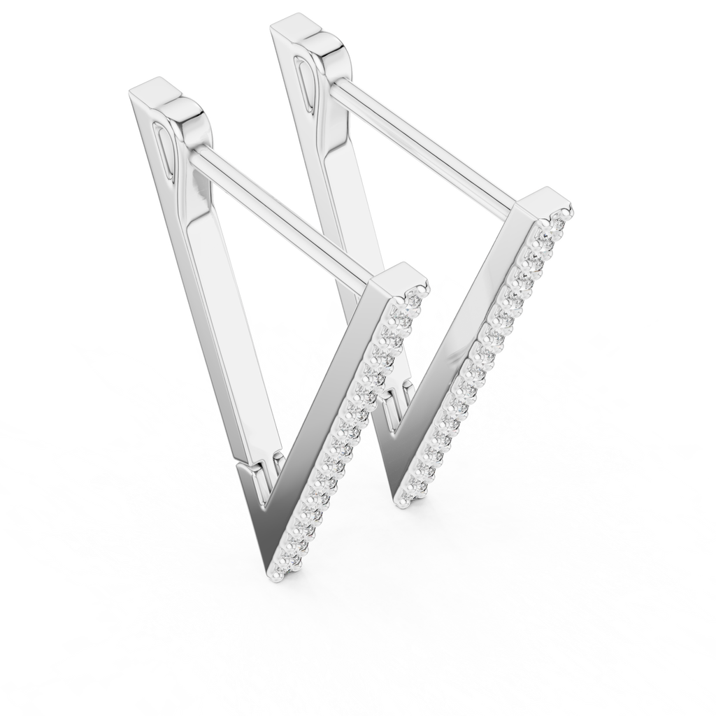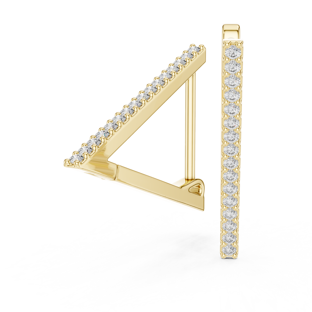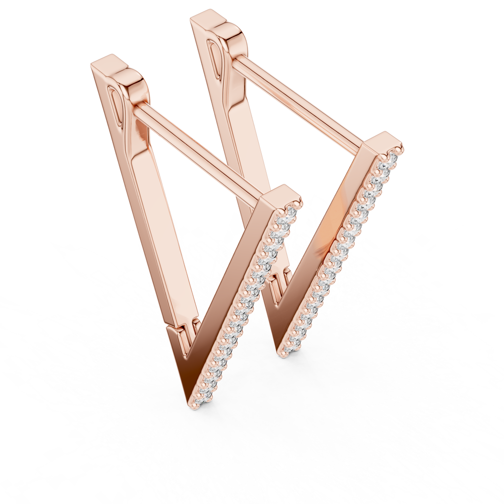 Elevate your jewelry collection with these striking Rose Gold Geometric Triangle Hoops, a contemporary twist on the classic earring design. Defined by their sharp, modern V-shaped silhouette, these earrings add an edgy yet sophisticated touch to any ensemble. The front face is meticulously lined with a row of brilliant pav?-set stones that catch the light with every movement, contrasting beautifully against the warm, polished rose gold finish. Designed for both style and comfort, they feature a secure hinge-snap mechanism that hugs the earlobe perfectly, making them an ideal accessory for seamless day-to-night wear.
