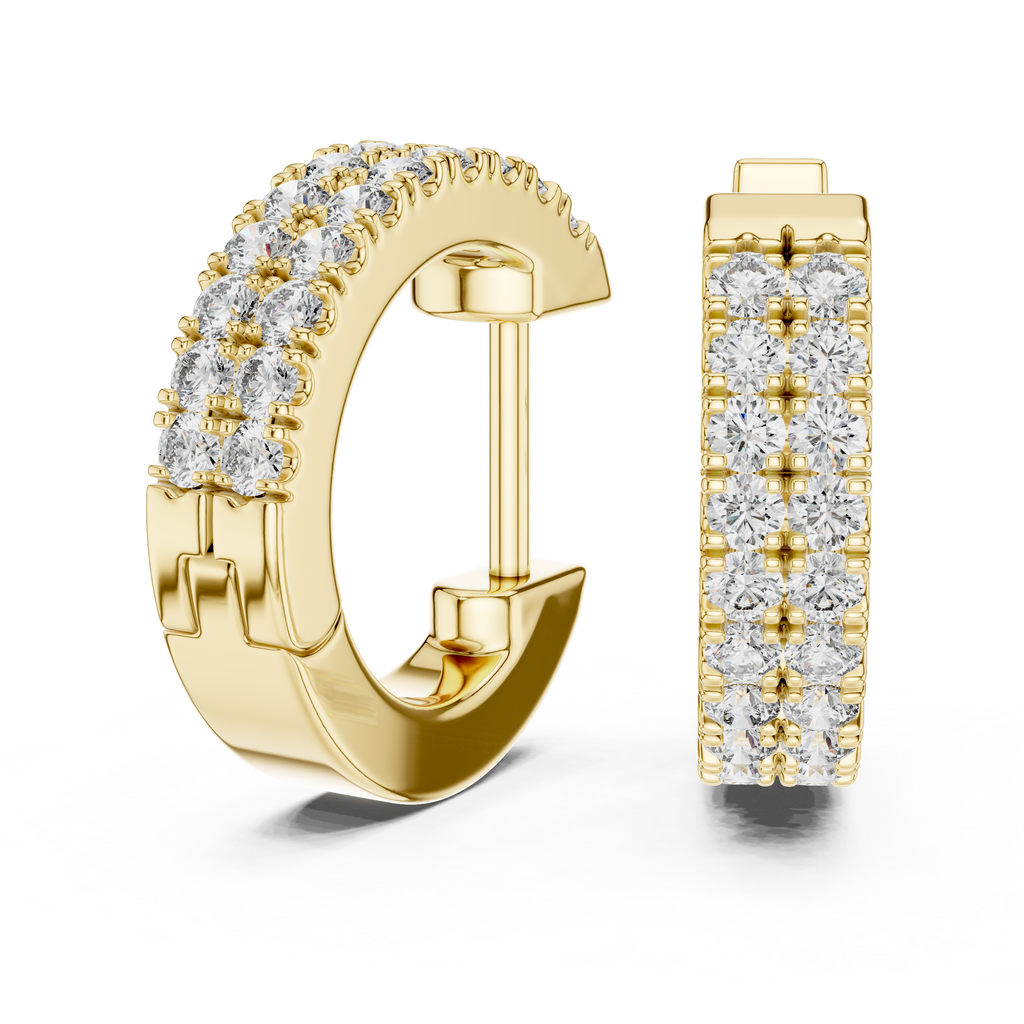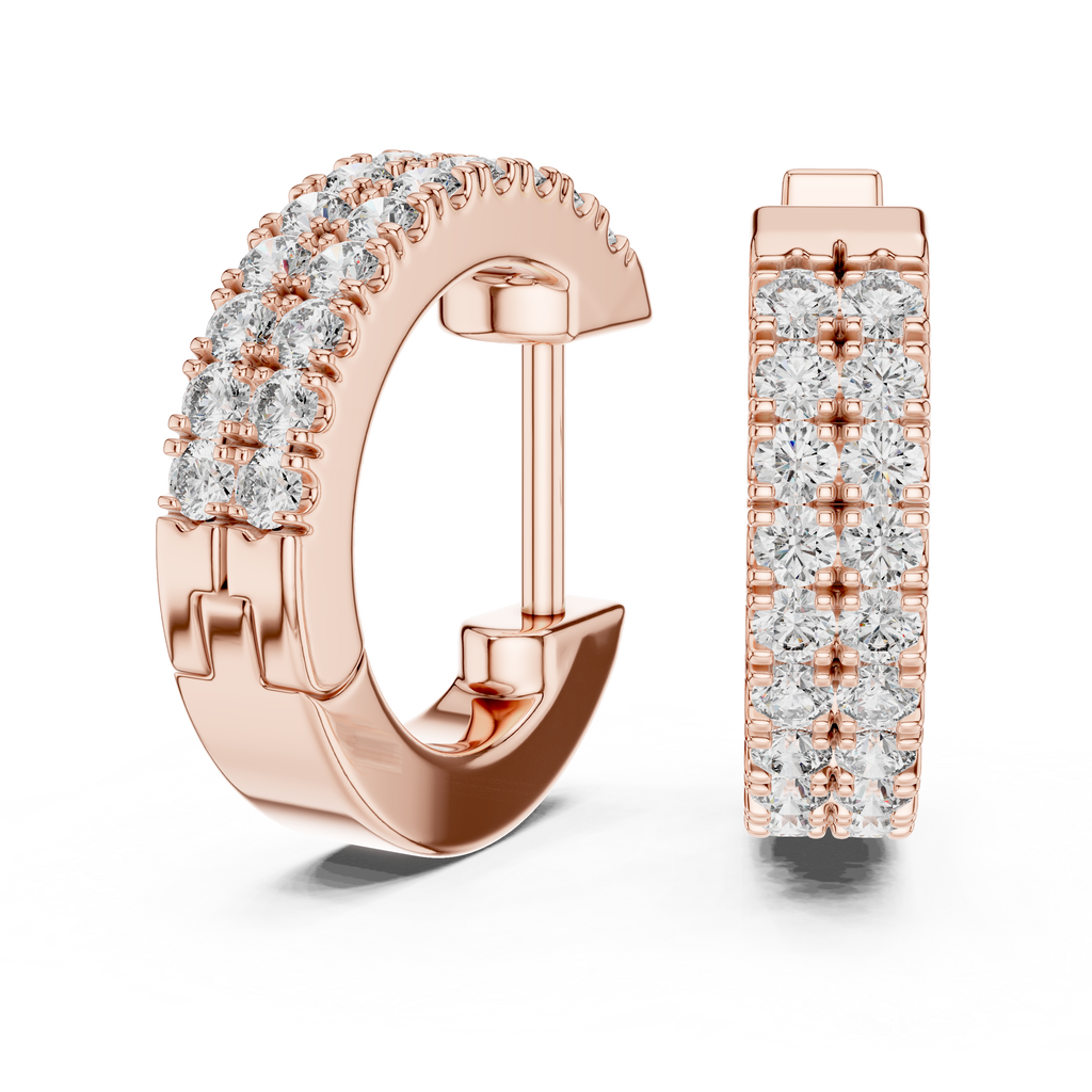 Double the sparkle with these luxurious Rose Gold Twin-Row Huggie Earrings. Designed for maximum brilliance, these earrings feature two parallel tracks of precision-set stones that wrap closely around the earlobe, creating a wide, luminous band of light. The shared-prong setting minimizes visible metal between the gems, allowing the stones to take center stage against the warm, polished rose gold backdrop. With their sturdy, wide profile and secure hinge-snap closure, they offer both a bold aesthetic and comfortable daily wear, making them the perfect statement piece to elevate your everyday style.
