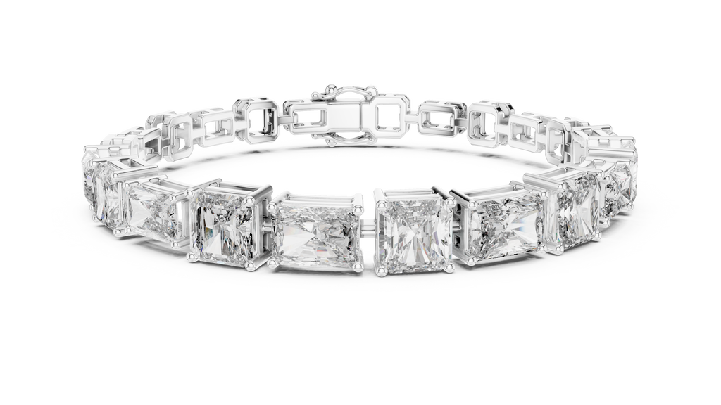This elegant piece is defined by its clean lines and geometric precision. The box-style links connect seamlessly, creating a flexible band of radiant, four-sided crystals. With its polished, copper-pink framework and secure locking clasp, it offers a contemporary take on classic luxury.