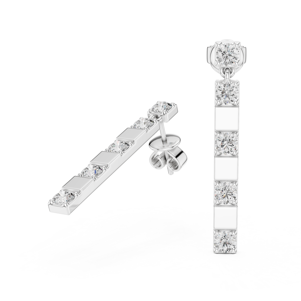 Embrace the rhythm of modern minimalism with these striking linear bar drop earrings. Crafted in warm rose gold, the design features a distinct alternating sequence where round brilliant diamonds are punctuated by sleek, flat polished square metal blocks. This structured, geometric arrangement creates a captivating visual beat?a "staccato" of light and reflection?that contrasts the intense sparkle of the stones with the smooth luster of the gold. Sleek and sophisticated, these drops offer a refined architectural look perfect for the woman who values precision and contemporary style.
