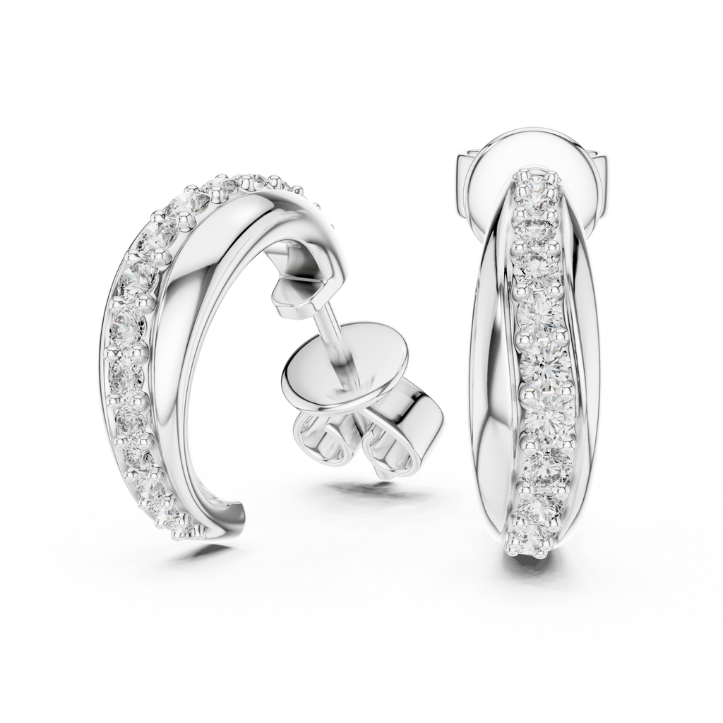 Redefine your hoop collection with the modern elegance of these Rose Gold Twin-Rail C-Hoops. This distinctive design features a continuous row of round brilliant diamonds set within a recessed channel, flanked by two bold, high-polished gold rails that add depth and architectural structure. The sturdy C-shape silhouette offers the substantial look of a hoop with the comfort and security of a classic stud post backing. Perfectly balancing warmth and sparkle, these earrings are an ideal choice for those seeking a sophisticated, contemporary twist on a timeless classic.