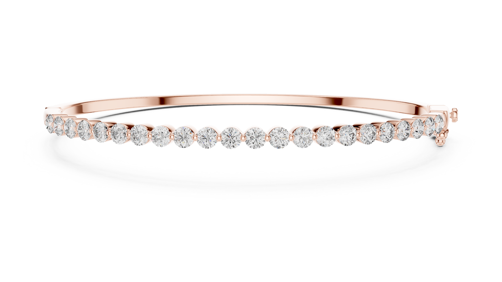 Grace your wrist with the sleek sophistication of this Rose Gold Scallop Diamond Bangle. Designed for the modern minimalist, this rigid hinged cuff features a dazzling half-circle of round brilliant diamonds, each cradled in a delicate scalloped setting that exposes the side profile of the stones to capture maximum light. The smooth, high-polished gold back ensures a comfortable fit against the skin, while the discreet integrated hinge and secure box clasp allow for effortless wear. Whether worn solo as a refined statement or stacked with other favorites, this bangle is a timeless addition to any jewelry collection.