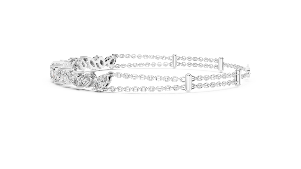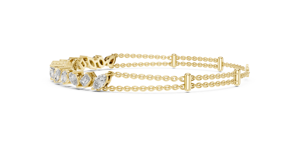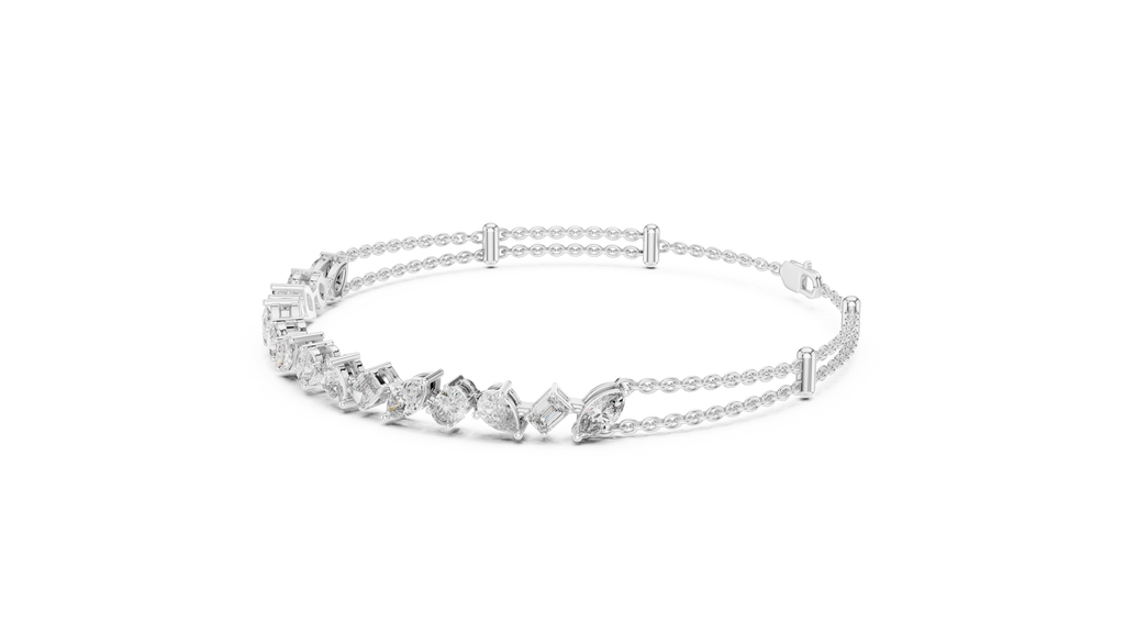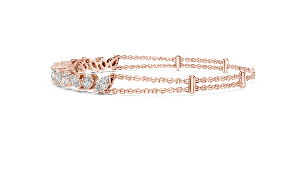 Celebrate individuality with the eclectic charm of this Rose Gold Mosaic Bar Bracelet. A true conversation starter, this modern design features a curated bar of mixed fancy-cut diamonds?including pear, emerald, oval, and marquise shapes?arranged in an artful, irregular rhythm that captures light from every angle. The dazzling diamond station is suspended from a unique double-strand chain, creating an instant layered look that feels both delicate and substantial. Secured with a lobster clasp and adjustable extender for a custom fit, this piece offers a fresh, contemporary twist on the classic diamond bracelet.