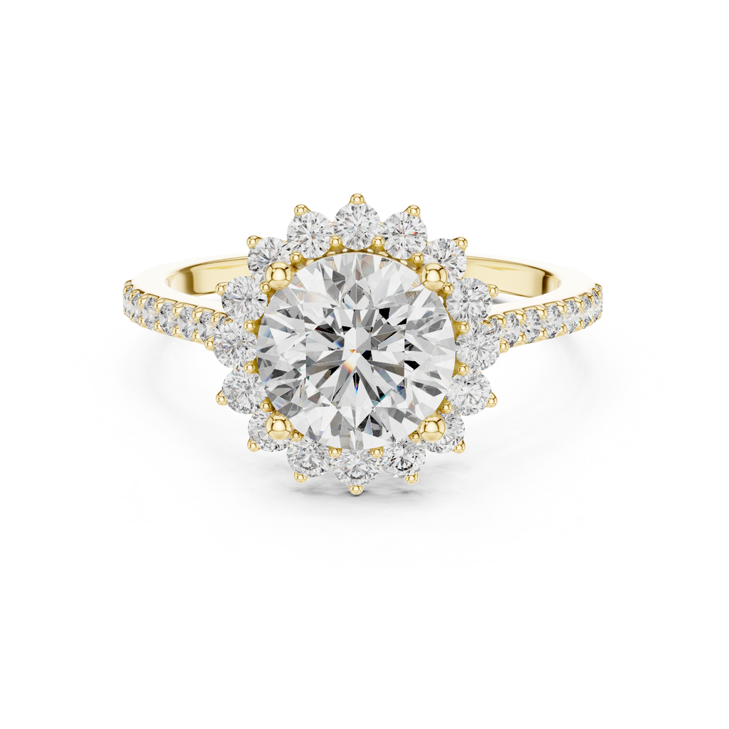 Indulge in the brilliance of this radiant engagement ring. At its heart lies a magnificent round brilliant cut stone, encircled by a captivating halo of smaller round gems. The halo features a unique, scalloped edge that creates a starburst effect, amplifying the center stones fire and adding a regal touch. The sparkle extends gracefully down the shank, which is lined with a row of shimmering pave-set accents. This design perfectly balances classic elegance with a touch of celestial drama, making it an ideal symbol of everlasting love. Key Features: Center Stone: Round Brilliant Cut Setting Style: Scalloped Starburst Halo Band Design: Pave Set Shank Category: Engagement Ring