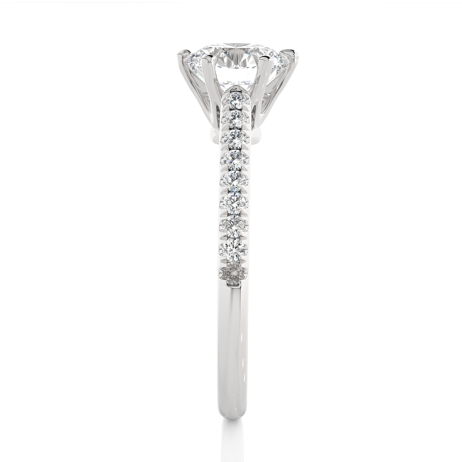 This elegant solid gold engagement ring features a dazzling round-cut center stone in a secure six-prong setting. The slender band sparkles with pavé-set diamonds, adding brilliance and charm. A timeless design that captures the essence of romance, perfect for celebrating love with sophistication and enduring beauty.